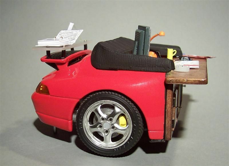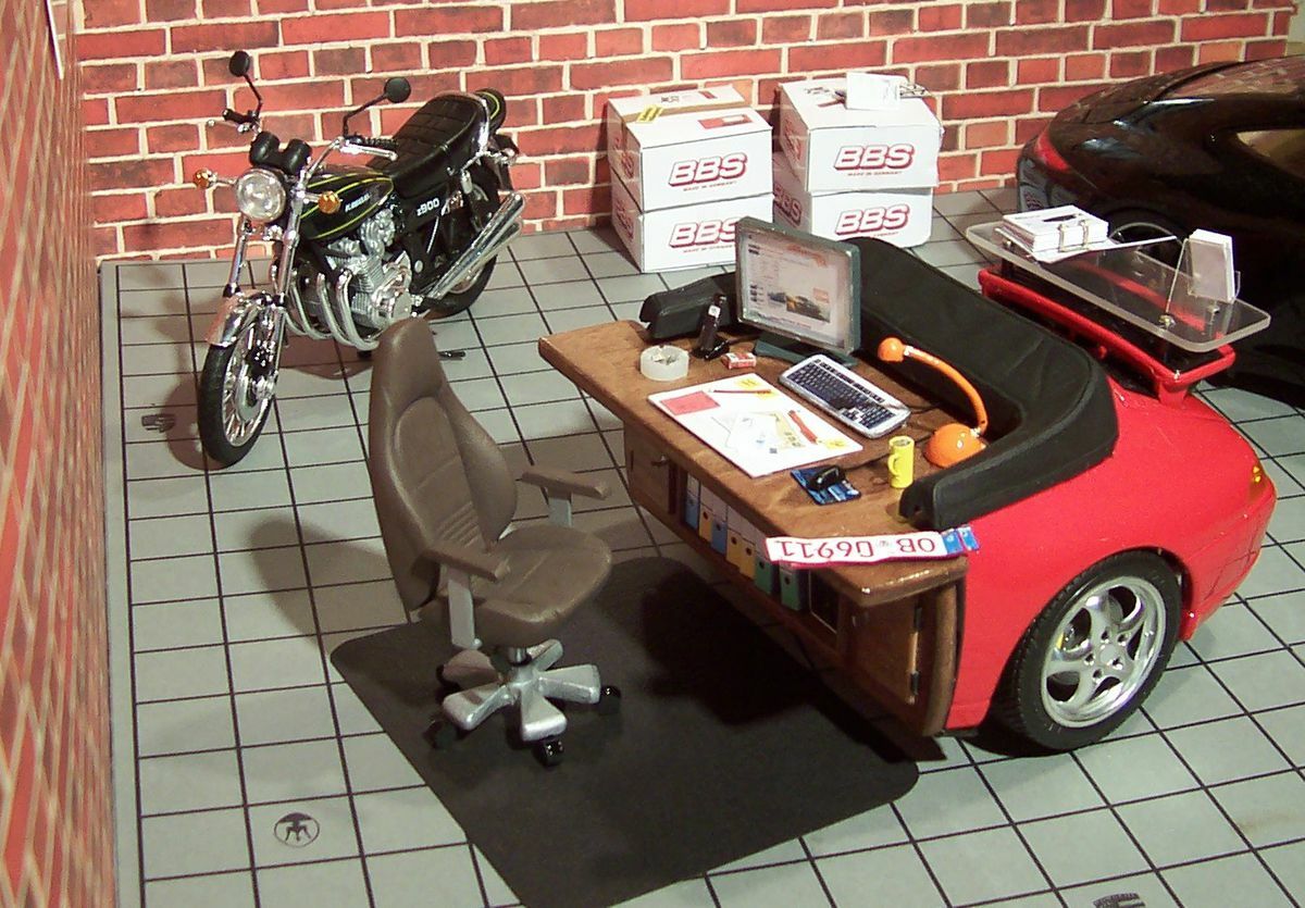 Das hier gezeigte Modell ist ein 1:18 skaliertes Modellauto, welches von Bburago gefertigt wurde. Es zeigt den Porsche 911 (993) Cabriolet in einer modifizierten Form. Diese Miniatur wurde aus dem hochwertigen Material Diecast hergestellt, was für eine hohe Detailtreue sorgt. Es ist wichtig zu betonen, dass diese Miniatur verändert wurde und nicht das ursprüngliche Produkt von Bburago darstellt. Zu den sichtbaren Modifikationen gehören eine aufgesetzte Arbeitsplatte und verschiedene typische Büroequipment, die das Modell zu einem einzigartigen Sammlerstück in der Kollektion von Modelly-Mitglied "Schraubaer61" machen.