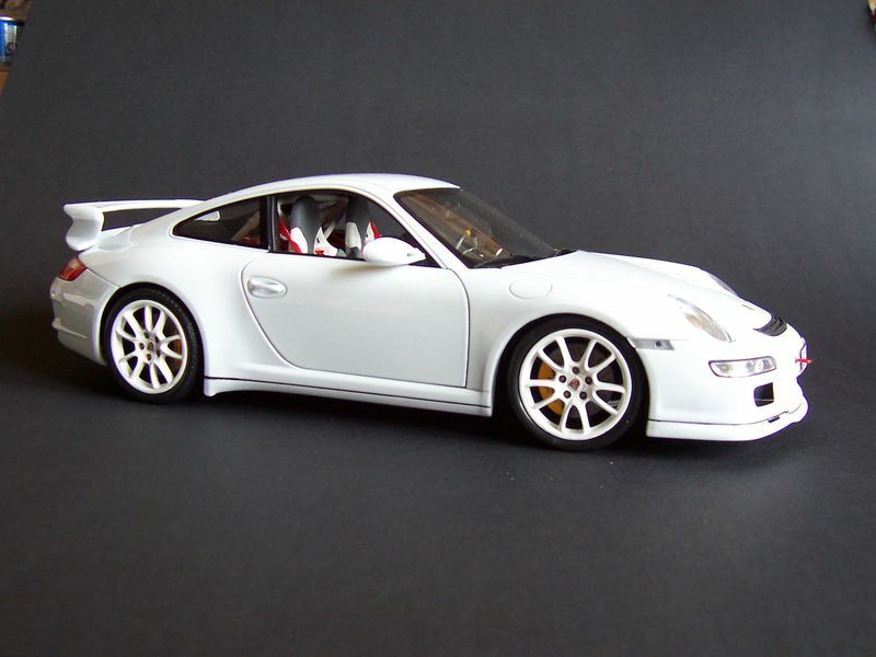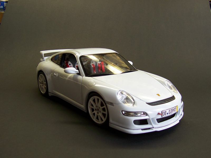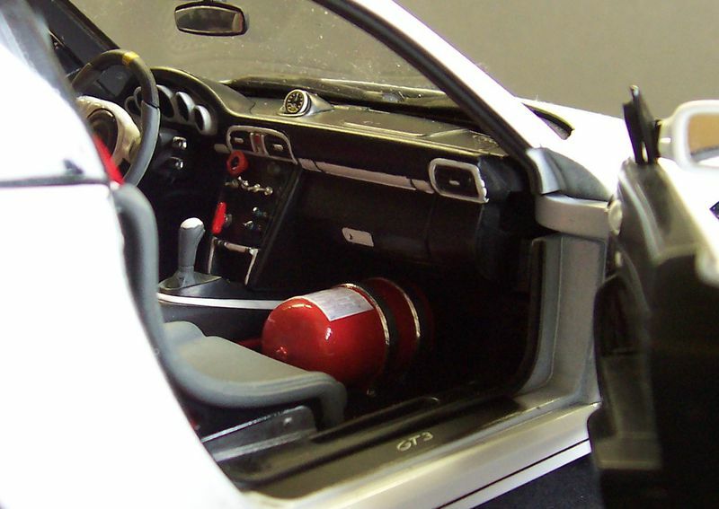 Der Welly 997 GT3 wurde von mir auf GT3CS umgebaut. Im einzelnen wurde verändert: Ü-Bügel weiss, Sitze mit Schlitzen für rote 6-Punkt-Gurte, 3-Punkt-Gurte in rot, Innenraum beflockt, Mittelkonsole mit Schaltern Notaus etc., Löschanlage, Felgen weiss lackiert, Bremsscheiben gelocht, Fzg. tiefergelegt und und und.....