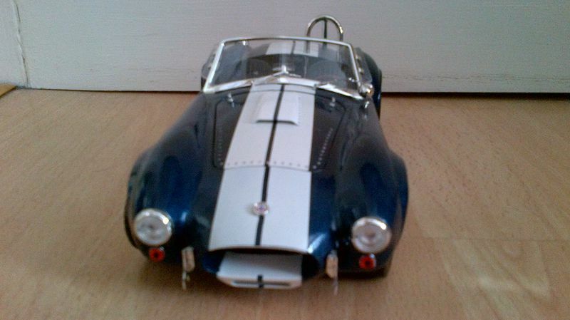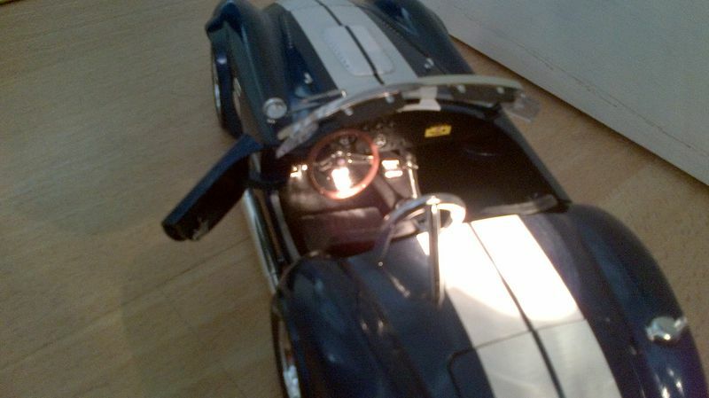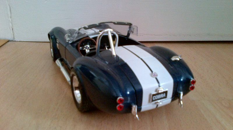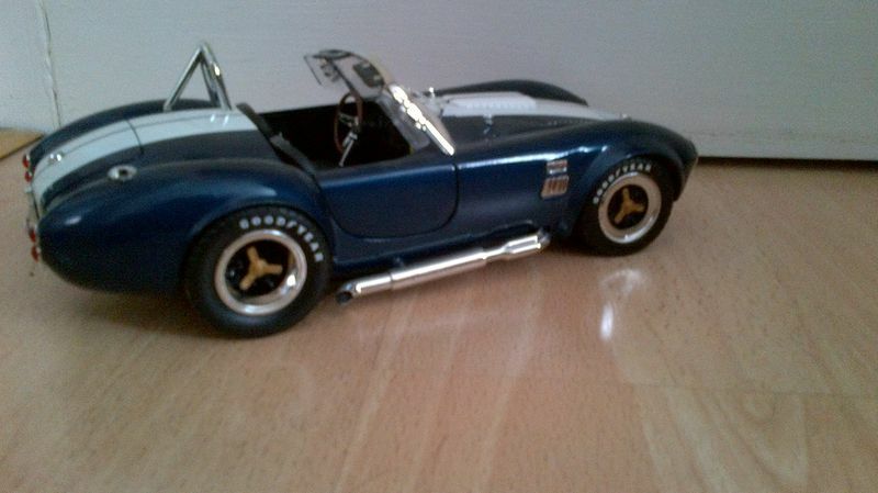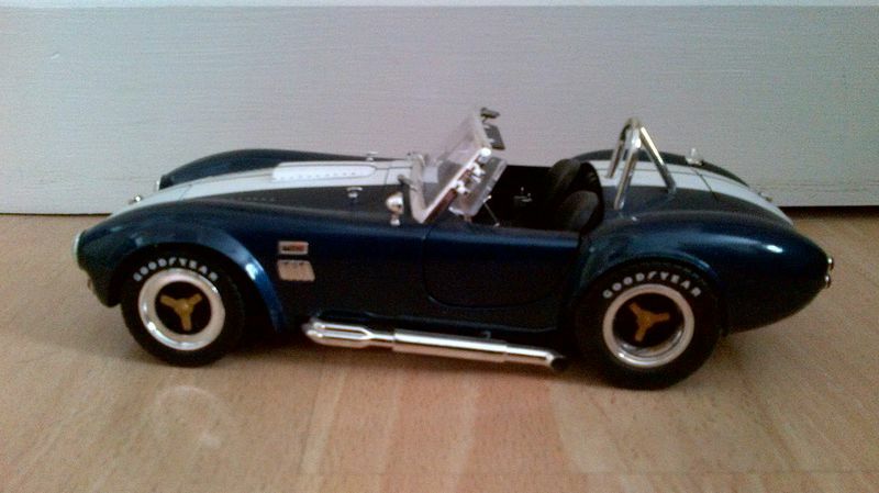 Dieses Modellauto des Shelby Cobra 427 S/C im Maßstab 1:18, das von Shelby Collectibles hergestellt wurde, ist ein detailgetreues Abbild des Originals. Die präzise Lackierung in dunklem Blau mit den dualen weißen Rennstreifen ist charakteristisch für das Cobra-Design und gibt diesem Modell einen echten Wiedererkennungswert. Jedes Element, von den Scheinwerfern über den Kühlergrill bis zu den Seitenauspuffrohren, ist akkurat nachgebildet. Die Goodyear-Reifen, die gut sichtbar auf den Felgen angebracht sind, spiegeln das Rennerbe des Originals wider. Das Gesamtbild wird von den originalgetreuen Emblemen und Badges komplettiert, die dem Modell eine authentische und hochwertige Optik verleihen.