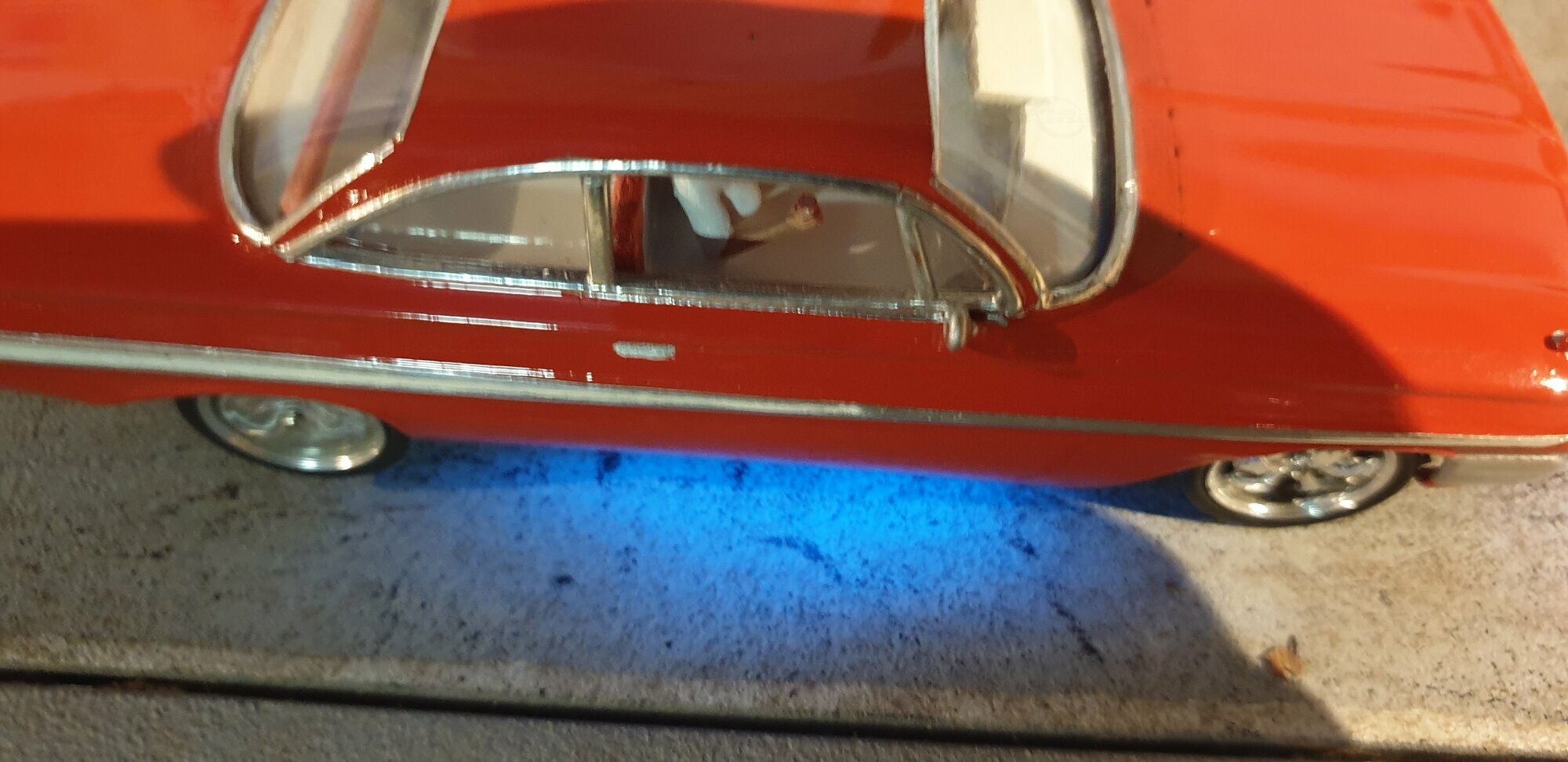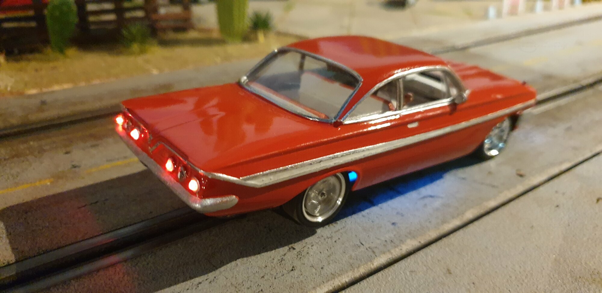 Das Modellauto zeigt den Chevrolet Impala in seiner vollen Pracht. Ein Highlight sind die glänzenden Oberflächen, die mit einem auffälligen Lack und verchromten Details versehen sind. Besonders hervorzuheben sind die sorgfältig gearbeiteten Scheinwerfer und Rücklichter, die dem Modell einen authentischen Look verleihen, wenn es über die Slotcar-Bahn saust. Die Elektronik sorgt dafür, dass das Auto durch verschiedene Geschwindigkeiten nahtlos manövrierbar ist. Dieses Modell aus der Sammlung von Modelly-Mitglied "sparksfly" ist ein bezeichnendes Beispiel für die Vorliebe vieler Sammler für originalgetreue Fahrzeug-Miniaturen und stellt ein wertvolles Sammlerstück dar, das Geschichte, Design und technische Präzision in Miniaturform vereint.