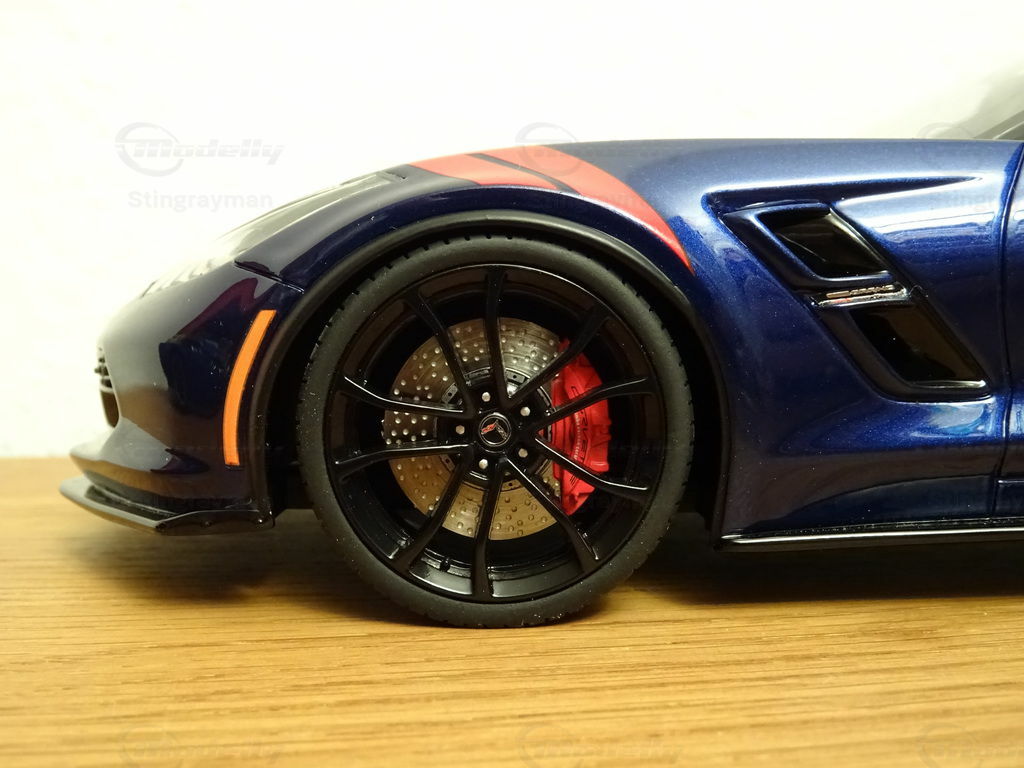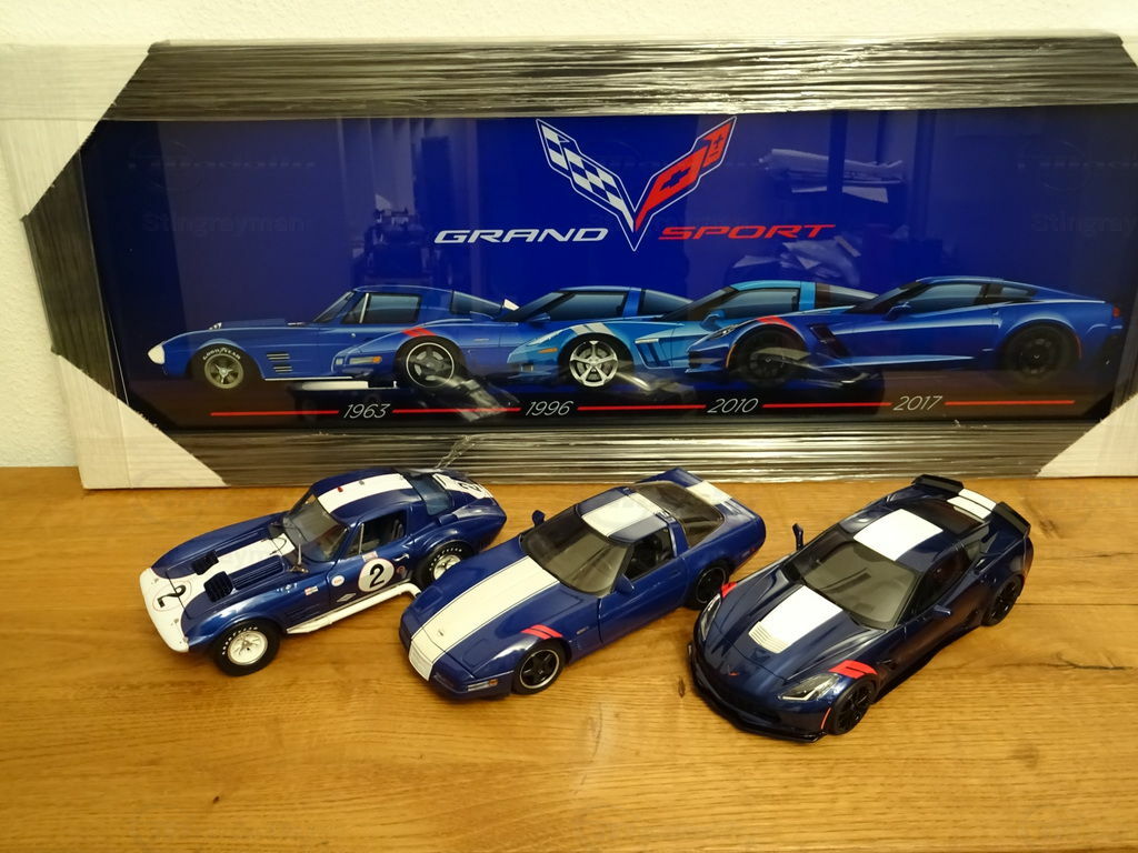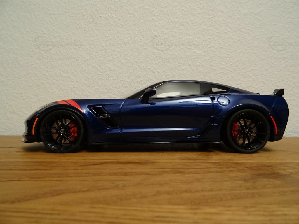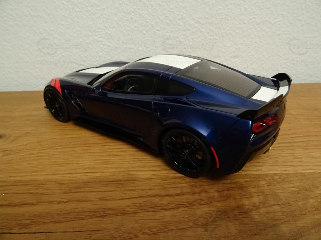 Das Modellauto der Chevrolet Corvette C7 Grand Sport im Maßstab 1:18, hergestellt von ACME / GT Spirit, ist eine bemerkenswerte Replik des echten Fahrzeugs. Hergestellt aus hochwertigem Harz (Resin), zeichnet sich diese Miniatur durch hervorragende Details und Präzision aus. Das Modell, das Teil der Sammlung von Modellauto-Enthusiast "Stingrayman" ist, präsentiert sich in einem tiefen Blauton mit weißen Rennstreifen, die über die Motorhaube verlaufen und so den sportlichen Charakter des Originals gekonnt einfangen. Besondere Kennzeichen des Modells sind die rot lackierten Lufteinlässe an den vorderen Kotflügeln und die stilisierten Felgen, die das aggressive Design der Grand Sport widerspiegeln. Dieses exklusive Modell ist ein Muss für jeden Sammler, der realistische und detaillierte Nachbildungen bevorzugt.