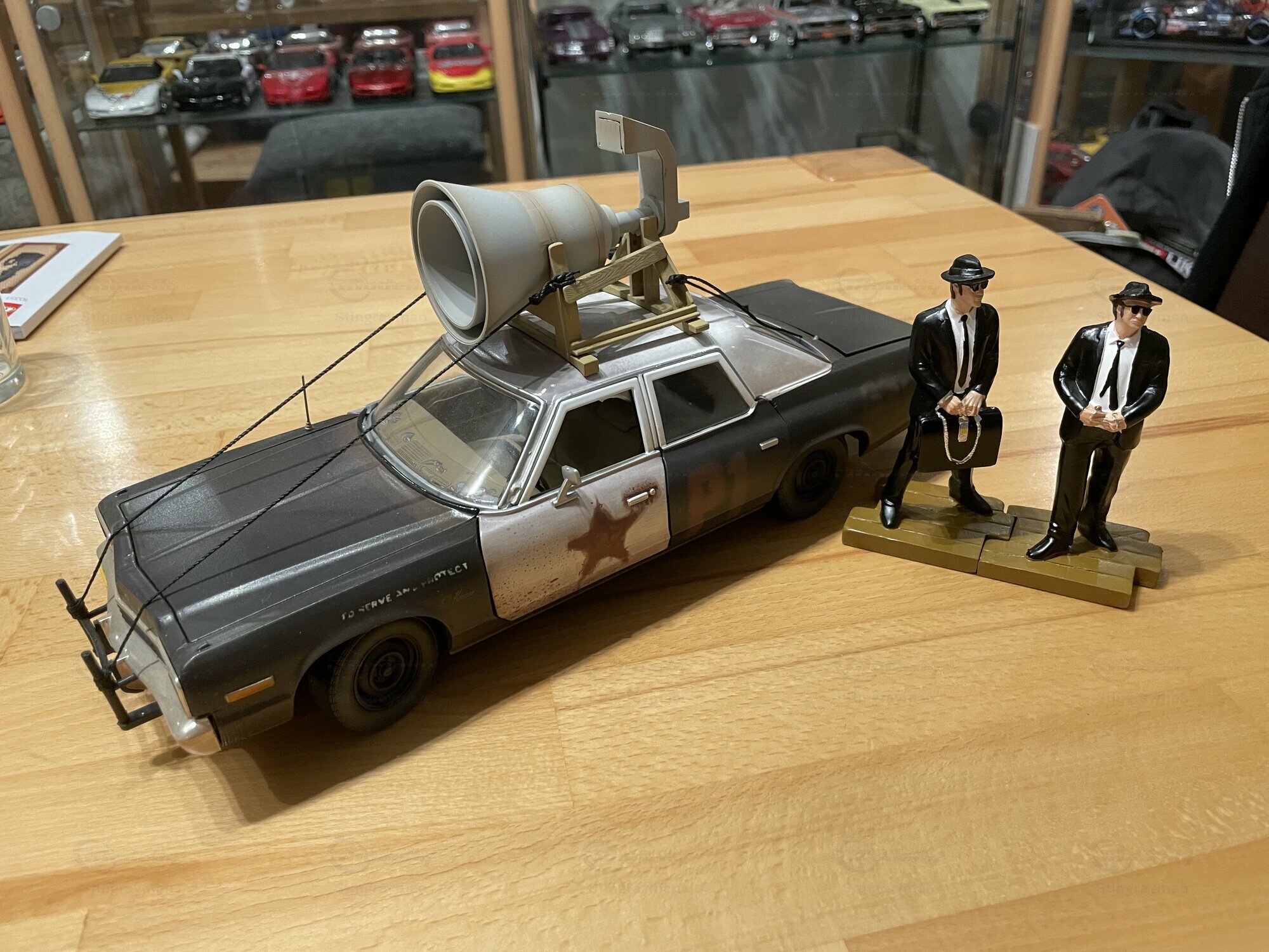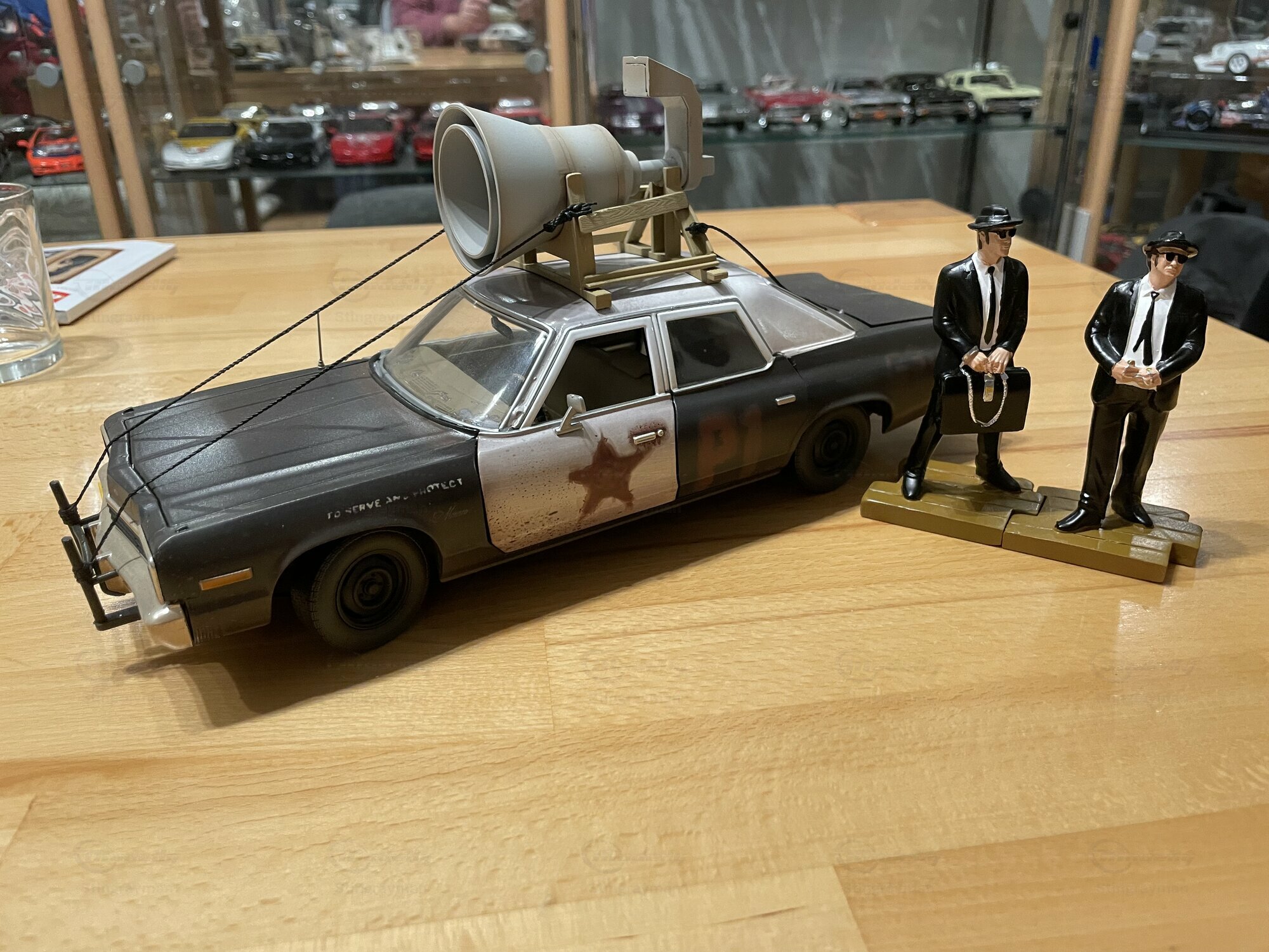 Das konkrete Vorbild dieser Miniatur ist die Bluesmobile, ein ausgemusterter Dodge Monaco Police Pursuit, der im Film The Blues Brothers (1980, Regie John Landis) eine zentrale Rolle spielt. Das Auto begleitet zahlreiche Szenen: vom Kauf auf dem Polizeiversteigerungsplatz über die berühmte Fahrt durch das Einkaufszentrum bis zur finalen Verfolgungsjagd nach Daley Plaza in Chicago. In mehreren Sequenzen trägt die Bluesmobile einen massiven Lautsprecher auf dem Dach, um eine Show anzukündigen – genau diese Konfiguration spiegelt das hier gezeigte Modell. Fahrer im Film sind Elwood Blues und Jake Blues, verkörpert von Dan Aykroyd und John Belushi. Die Figuren versuchen, ihre Band zu vereinen und durch ein Benefizkonzert die Steuerschulden eines Waisenhauses zu begleichen; der Dodge Monaco dient als Transportmittel, Fluchtfahrzeug und Symbol der Handlung. In der Produktion kamen mehrere identische Autos zum Einsatz, oft in der robusten Police‑Spezifikation mit Stahlrädern und Suchscheinwerfer.