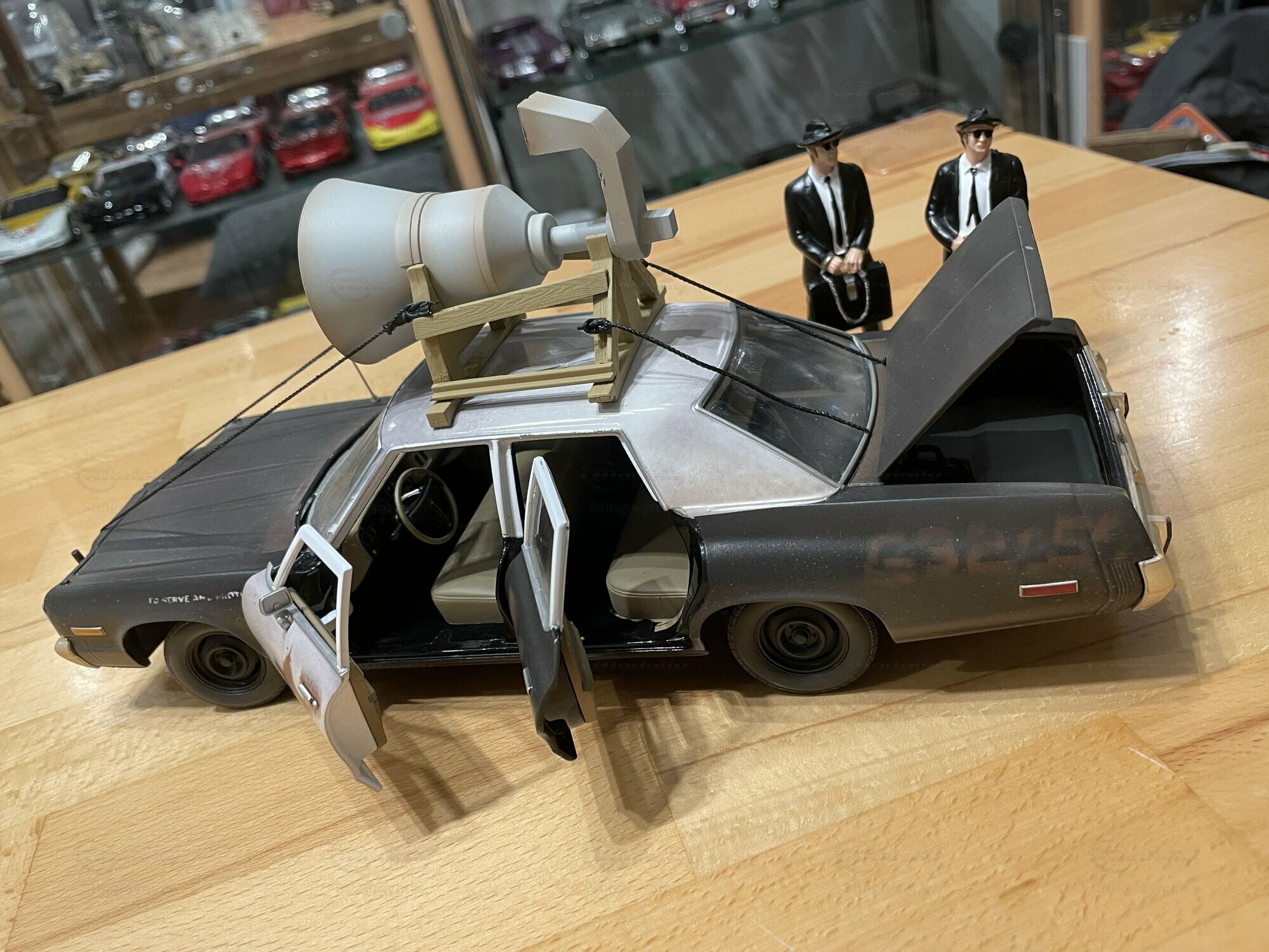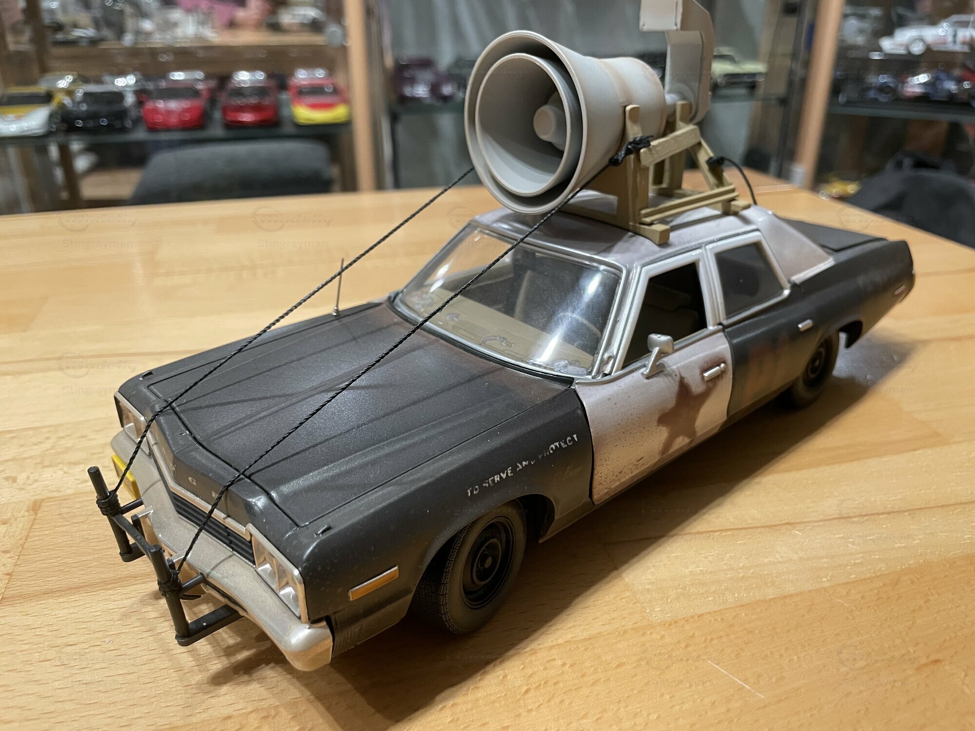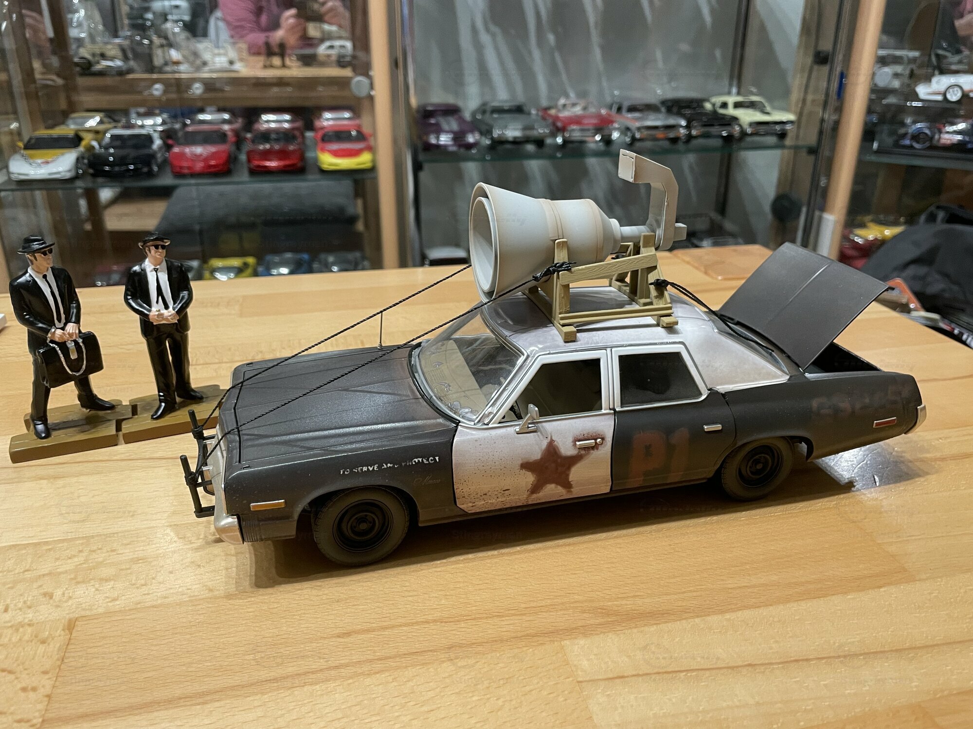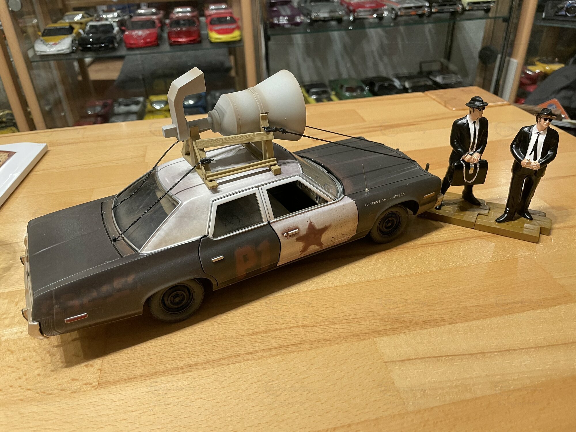 Die Lackierung und Beschriftung dieses Diecast‑Modells lehnt sich sichtbar an die Filmoptik der Bluesmobile an. Die Grundfarbe der Karosserie erscheint in einem dunklen, matt wirkenden Grauton; die vorderen Türen sind kontrastierend in einem helleren Weiß gehalten. Auf der Beifahrertür ist ein übermalter Sheriff‑Stern zu sehen, während am hinteren Kotflügel „P1“ beziehungsweise verwitterte Dienstkennungen angedeutet sind. An der vorderen Seitenwand ist der Slogan „To Serve and Protect“ als handschriftlich wirkende Aufschrift platziert. Die Stoßstangen wirken optisch wie unlackiertes Metall, was das Behörden‑Erscheinungsbild stützt. Der große Dachlautsprecher ist mit einem Winkel‑Träger auf vier Füßen montiert und über zwei Seile mit der Frontbefestigung verspannt – genau wie in den Filmszenen, in denen die Brüder durch die Straßen fahren und die anstehende Show bewerben. Im Modell sind die Schnüre, Knotenpunkte und der Schwenkrahmen detailliert aufgegriffen, was die Fotos besonders gut zeigen. Zwei Figuren, die die Filmcharaktere darstellen, stehen separat auf Steckbasen neben dem Auto; dies unterstreicht die thematische Zuordnung. Das Material wirkt sauber entgratet, die Fensterrahmen sind dünn bedruckt und die Spaltmaße der Türen sind gleichmäßig. Der generelle Eindruck ist stimmig und neutral umgesetzt, ohne übertriebene Glanzeffekte. Für Sammler ist interessant, dass es sich um ein Diecast‑Modell handelt, das die spezifische Variante der Bluesmobile mit Dachlautsprecher darstellt – eine Abweichung von der gängigen Version ohne Aufsatz. In der Vitrine von „Stingrayman“ ist das Modell vor einer Sammlung weiterer Sport‑ und Straßenwagen platziert; die Größe passt zu anderen Exponaten im Maßstab 1:18. Technisch passt das nachgebildete Vorbild: der Dodge Monaco Police Pursuit basierte auf dem C‑Body‑Fahrwerk, nutzte hintere Starrachse mit Blattfedern, vordere Einzelradaufhängung mit Drehstabfederung, eine verstärkte Kühlung und größere Alternatoren zur Versorgung der Polizeielektrik. Ab Modelljahr 1975 hielten Katalysatoren Einzug; die Nettoleistung des 440‑V8 sank leicht, blieb aber für Verfolgungen ausreichend. All diese Merkmale erklären, warum der Dodge Monaco für den Film als belastbares Arbeitsgerät ausgewählt wurde. Auch wenn keine spezifischen Tuningfirmen oder Felgenhersteller erkennbar sind, zeigt die Miniatur die Behördenkonfiguration mit Stahlrädern, schwarzer Lackierung der Radkappen und reduziertem Zierrat. Insgesamt steht hier ein sachlich umgesetztes Stück Film‑ und Automobilgeschichte in der Vitrine – ein Modell von Auto World, gefertigt im Maßstab 1:18 aus Diecast, das sich gut in thematische Sammlungen rund um den Dodge Monaco und die Bluesmobile einfügt.