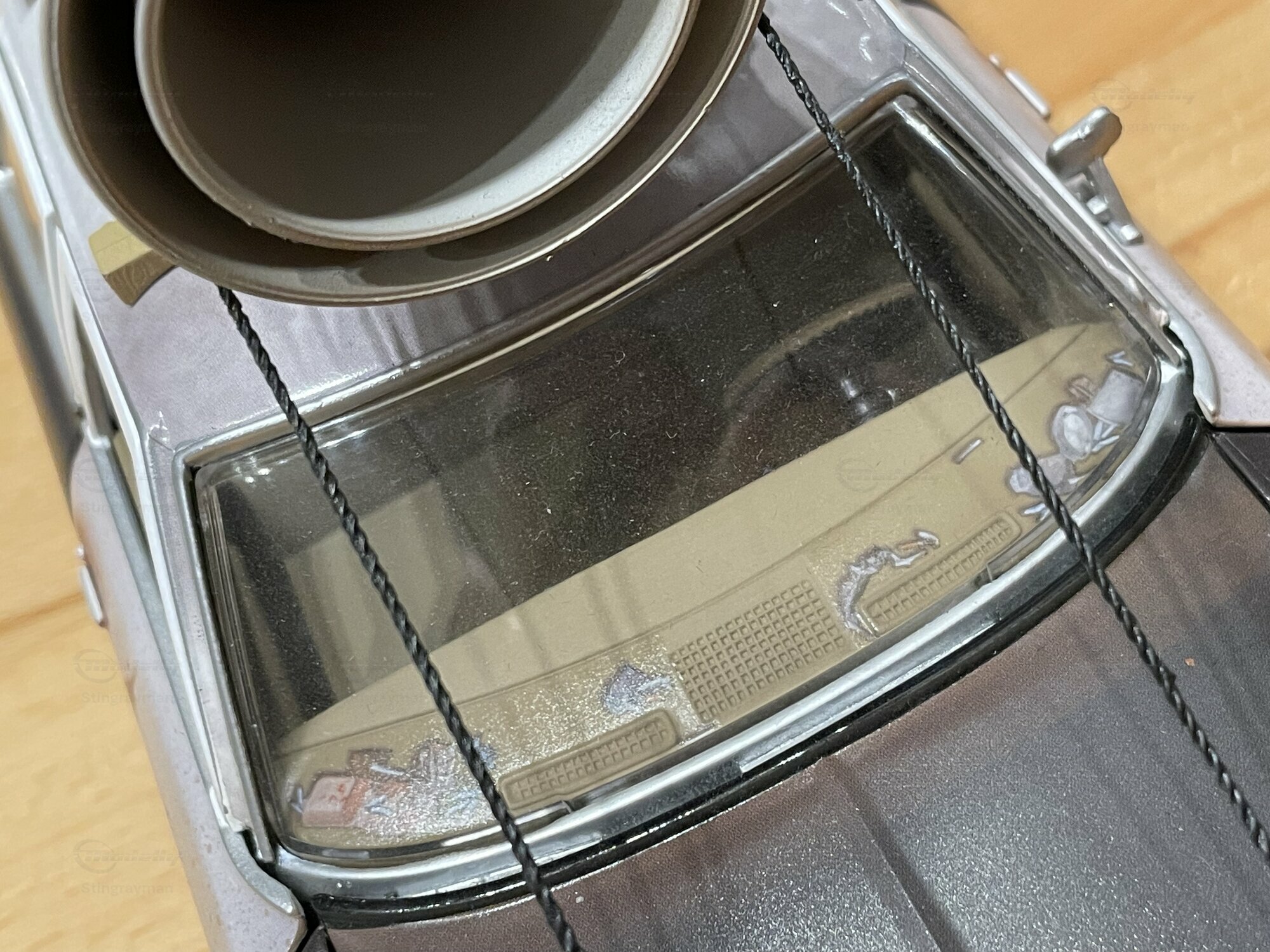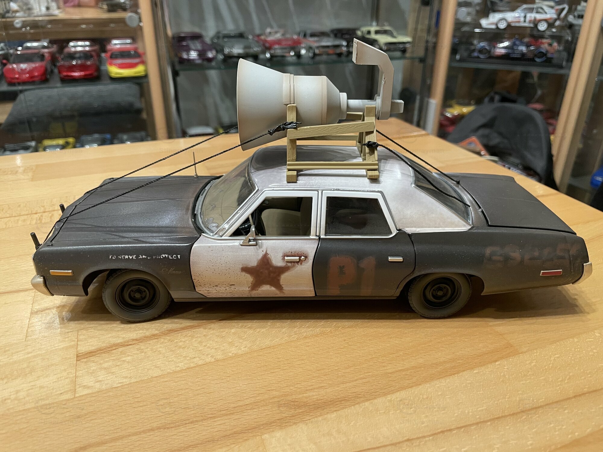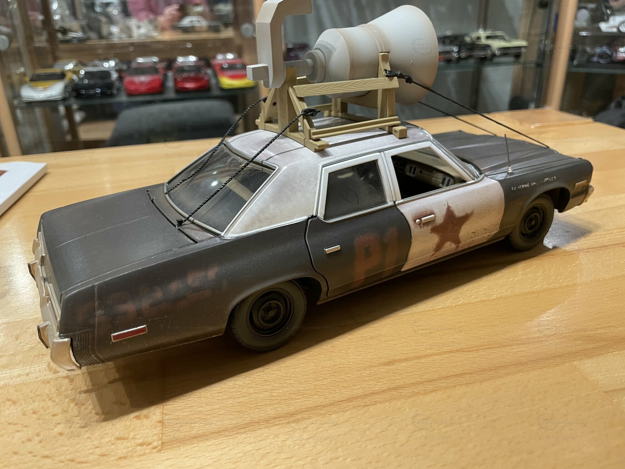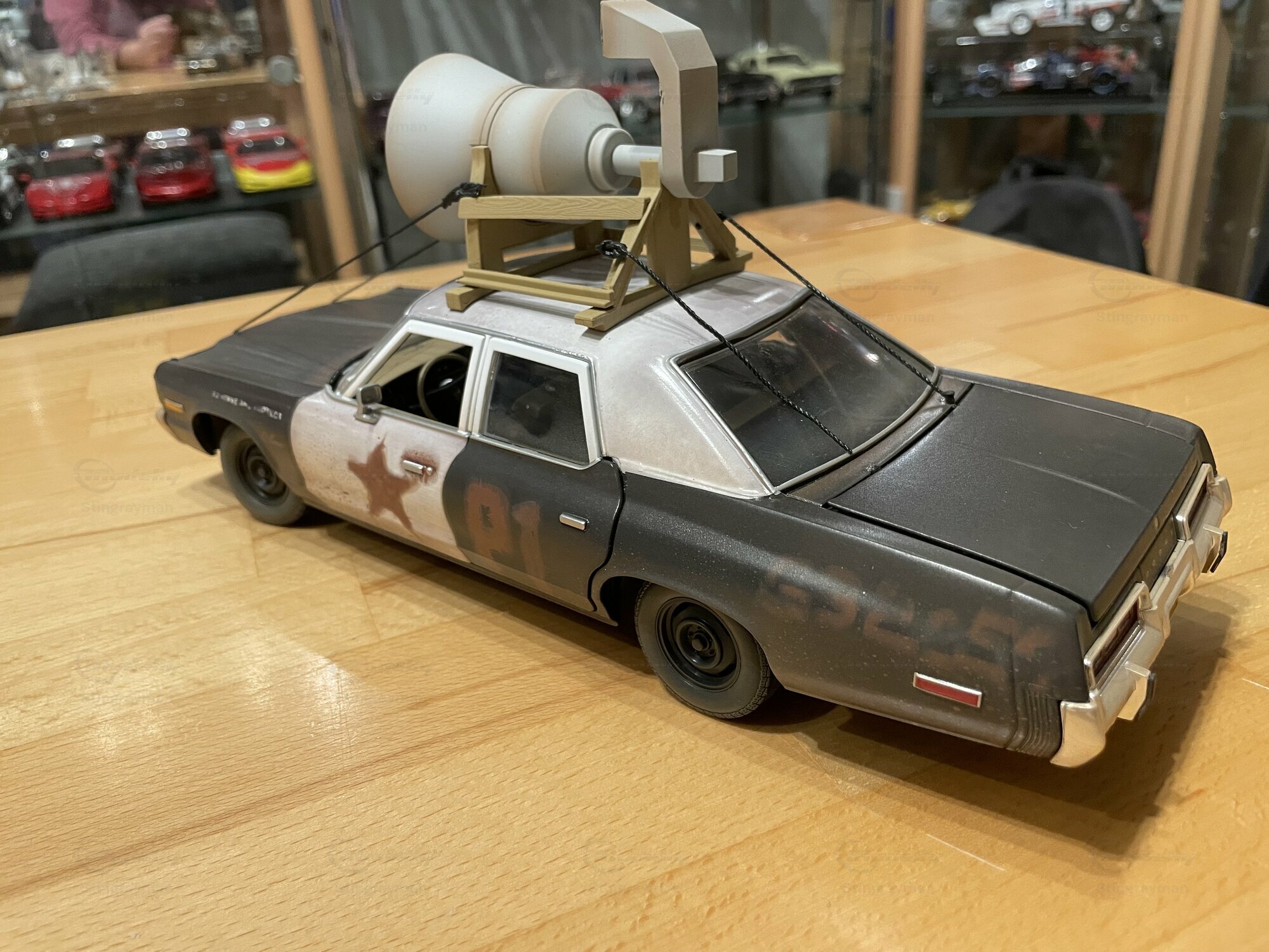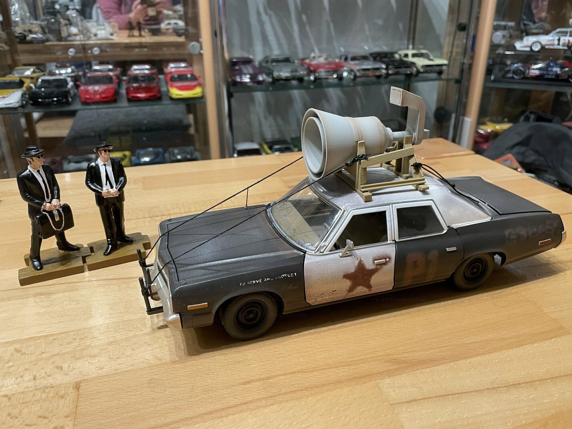 Die Lackierung und Beschriftung dieses Diecast‑Modells lehnt sich sichtbar an die Filmoptik der Bluesmobile an. Die Grundfarbe der Karosserie erscheint in einem dunklen, matt wirkenden Grauton; die vorderen Türen sind kontrastierend in einem helleren Weiß gehalten. Auf der Beifahrertür ist ein übermalter Sheriff‑Stern zu sehen, während am hinteren Kotflügel „P1“ beziehungsweise verwitterte Dienstkennungen angedeutet sind. An der vorderen Seitenwand ist der Slogan „To Serve and Protect“ als handschriftlich wirkende Aufschrift platziert. Die Stoßstangen wirken optisch wie unlackiertes Metall, was das Behörden‑Erscheinungsbild stützt. Der große Dachlautsprecher ist mit einem Winkel‑Träger auf vier Füßen montiert und über zwei Seile mit der Frontbefestigung verspannt – genau wie in den Filmszenen, in denen die Brüder durch die Straßen fahren und die anstehende Show bewerben. Im Modell sind die Schnüre, Knotenpunkte und der Schwenkrahmen detailliert aufgegriffen, was die Fotos besonders gut zeigen. Zwei Figuren, die die Filmcharaktere darstellen, stehen separat auf Steckbasen neben dem Auto; dies unterstreicht die thematische Zuordnung. Das Material wirkt sauber entgratet, die Fensterrahmen sind dünn bedruckt und die Spaltmaße der Türen sind gleichmäßig. Der generelle Eindruck ist stimmig und neutral umgesetzt, ohne übertriebene Glanzeffekte. Für Sammler ist interessant, dass es sich um ein Diecast‑Modell handelt, das die spezifische Variante der Bluesmobile mit Dachlautsprecher darstellt – eine Abweichung von der gängigen Version ohne Aufsatz. In der Vitrine von „Stingrayman“ ist das Modell vor einer Sammlung weiterer Sport‑ und Straßenwagen platziert; die Größe passt zu anderen Exponaten im Maßstab 1:18. Technisch passt das nachgebildete Vorbild: der Dodge Monaco Police Pursuit basierte auf dem C‑Body‑Fahrwerk, nutzte hintere Starrachse mit Blattfedern, vordere Einzelradaufhängung mit Drehstabfederung, eine verstärkte Kühlung und größere Alternatoren zur Versorgung der Polizeielektrik. Ab Modelljahr 1975 hielten Katalysatoren Einzug; die Nettoleistung des 440‑V8 sank leicht, blieb aber für Verfolgungen ausreichend. All diese Merkmale erklären, warum der Dodge Monaco für den Film als belastbares Arbeitsgerät ausgewählt wurde. Auch wenn keine spezifischen Tuningfirmen oder Felgenhersteller erkennbar sind, zeigt die Miniatur die Behördenkonfiguration mit Stahlrädern, schwarzer Lackierung der Radkappen und reduziertem Zierrat. Insgesamt steht hier ein sachlich umgesetztes Stück Film‑ und Automobilgeschichte in der Vitrine – ein Modell von Auto World, gefertigt im Maßstab 1:18 aus Diecast, das sich gut in thematische Sammlungen rund um den Dodge Monaco und die Bluesmobile einfügt.