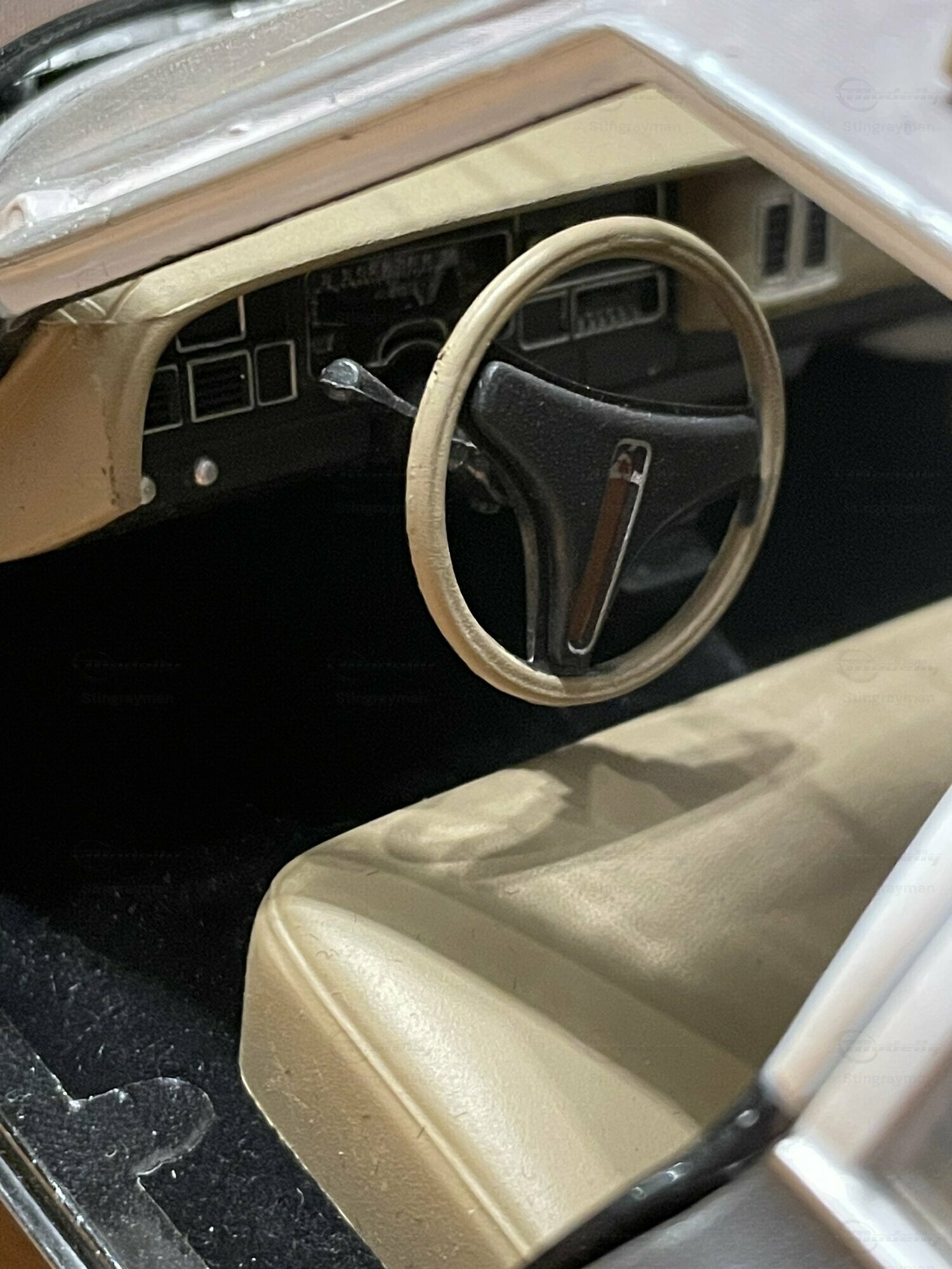 Die Fotos zeigen ein Modellauto im Maßstab 1:18 von Auto World, das zur Sammlung des Modelly‑Mitglieds „Stingrayman“ gehört. Der Hersteller setzt auf die Fertigung aus Diecast‑Metall; die Türen, Hauben und einige Anbauteile bestehen aus Metalldruckguss, was dem Modell ein realistisches Gewicht gibt und die Funktionalität typischer Diecast‑Modelle ermöglicht. Auffällig ist die Reproduktion des auf dem Dach montierten Megaphons samt Trägergestell und verspannten Halteleinen. Die Front weist den polizeitypischen Push‑Bumper auf, ergänzt um einen Suchscheinwerfer an der Fahrerseite. Die Räder sind als schlichte Stahlfelgen mit Polizeikappen nachgebildet; ein spezifischer Felgenhersteller ist bei der realen Vorlage nicht eindeutig zuzuordnen. Im Innenraum ist eine helle, utilitaristische Ausstattung erkennbar, passend zu einem Behördenfahrzeug dieser Zeit. Das Modellauto im Maßstab 1:18 von Auto World bildet die Abmessungen des Vorbilds stimmig ab und zeigt auf den Fotos stimmige Proportionen von Haubenhöhe, Dachlinie und Überhängen, wie sie der Dodge Monaco der dritten Generation besitzt.