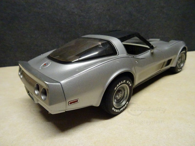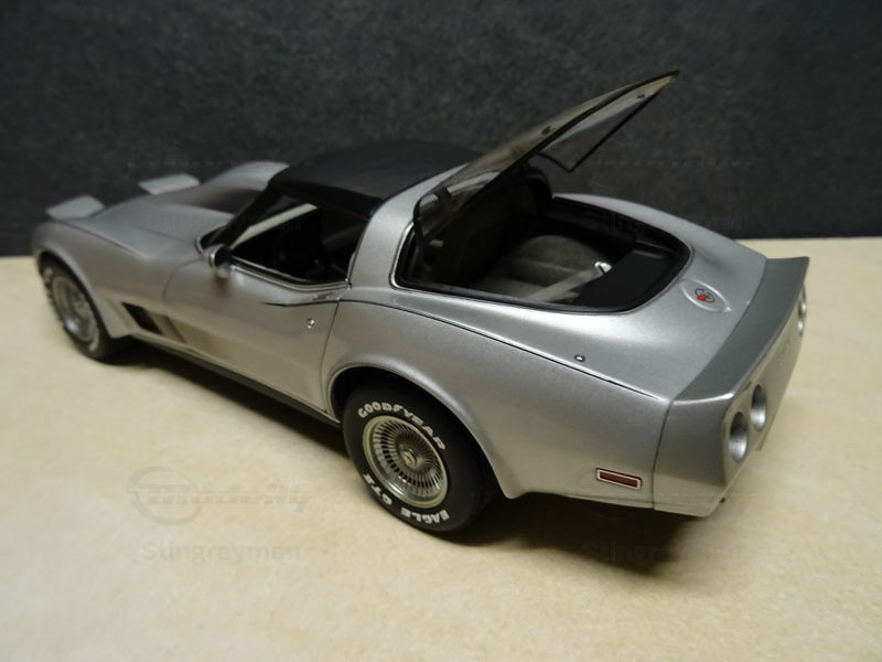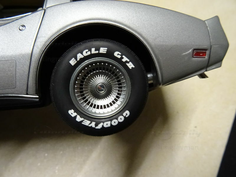 Die hier gezeigte Miniatur ist im Maßstab 1:18 von AUTOart Millennium gefertigt und besticht durch ihre Detailgenauigkeit. Hergestellt auf Basis des Materials Diecast, vermittelt sie einen realistischen Eindruck des Originals. Die metallic-silberne Lackierung des Modells ist nahezu identisch mit der exklusiven Farbe der 25th Anniversary Edition. Das zweifarbige Farbschema mit grauen Akzenten und der transparente Targa-Dachbereich sind originalgetreu nachgebildet. Die weißen Goodyear-Reifen mit markanter Beschriftung und die Speichenfelgen runden das gesamte Erscheinungsbild ab. Die präzise Verarbeitungsqualität zeigt sich auch in den kleinen Details wie den Corvette-Logos und den feinen Linien an den Seiten.