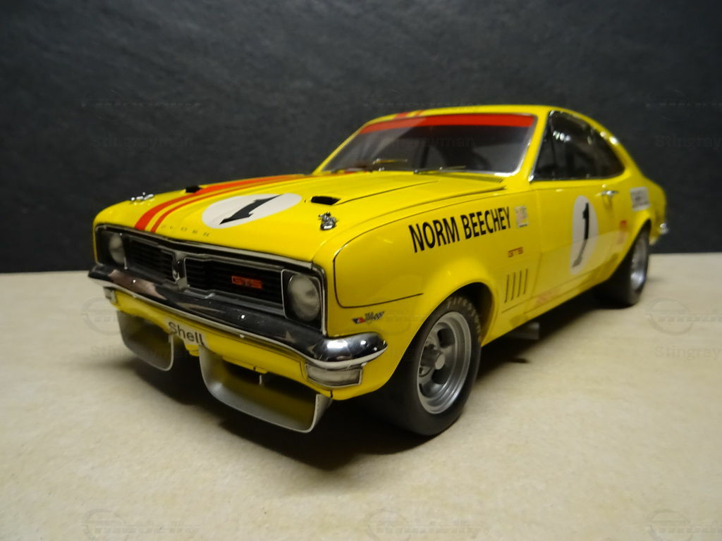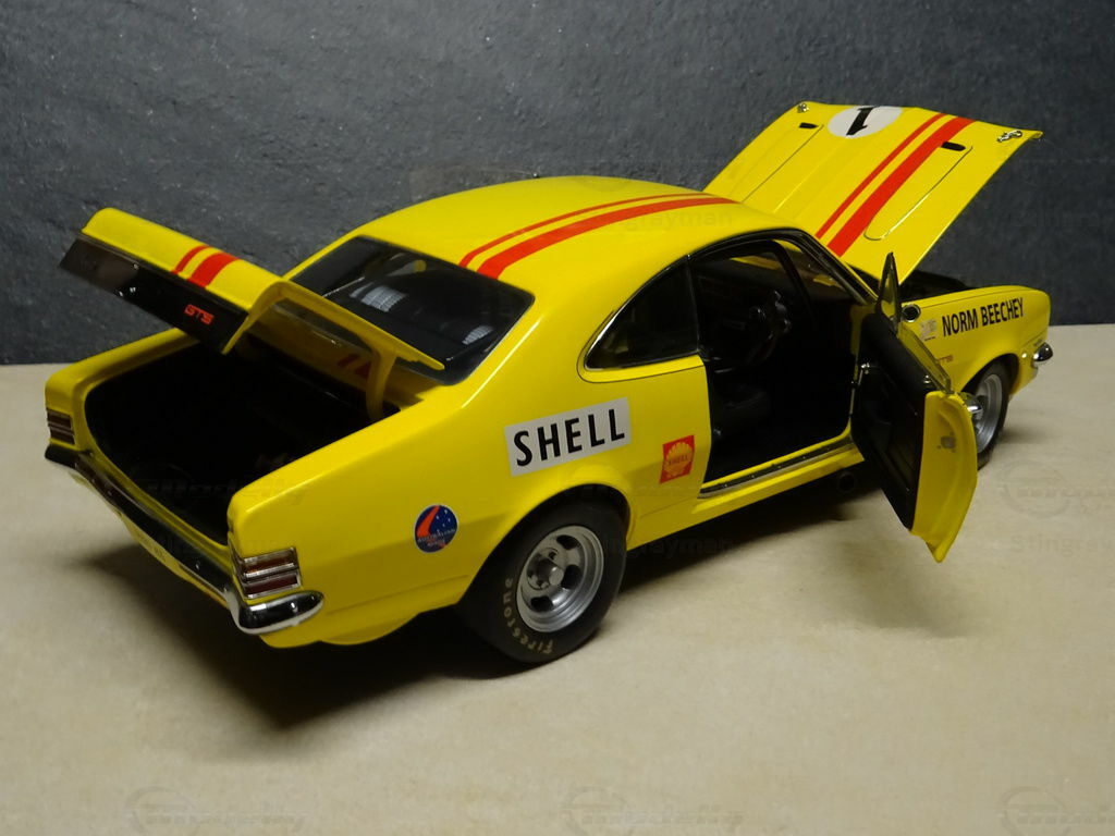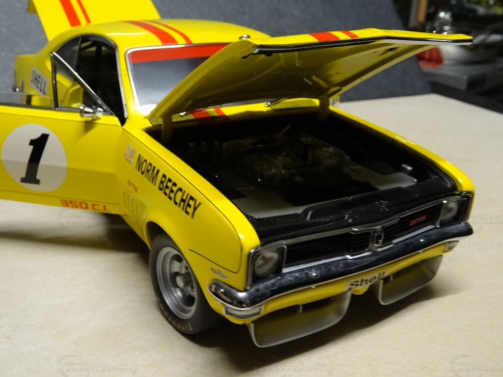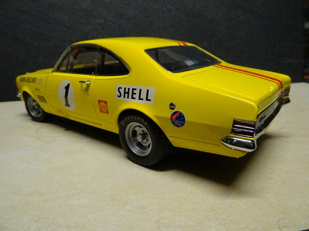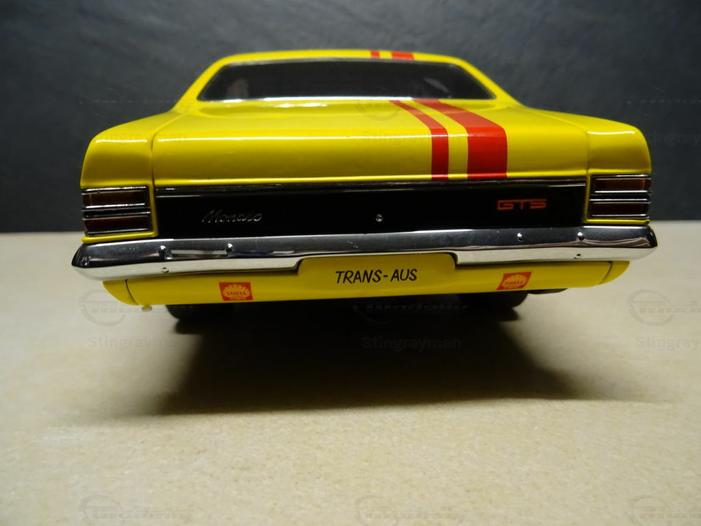 Dieses Modellauto im 1:18 Maßstab wurde von Classic Carlectables gefertigt und bildet den Holden Monaro HT detailgetreu nach. Das Modell ist aus Diecast-Material hergestellt und besticht durch seine hohe Detailtreue und Qualität. Auf den Fotos des Modells, welches in der Sammlung von Modelly Mitglied "Stingrayman" ist, sind viele präzise Details sichtbar, darunter die markante Frontpartie mit dem GTS-Emblem, detaillierte Felgen und der charakteristische Lack in Gelb mit roten Streifen und der Nummer 1. Jede kleine Nuance des Originals wurde akribisch nachgebildet, von den Scheinwerfern bis zu den Sponsorenaufklebern wie Shell und Repco.