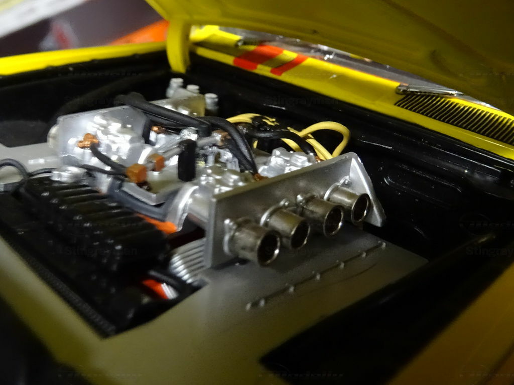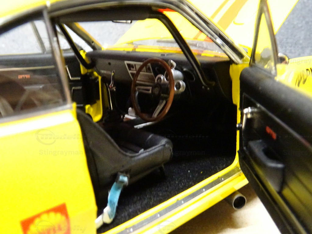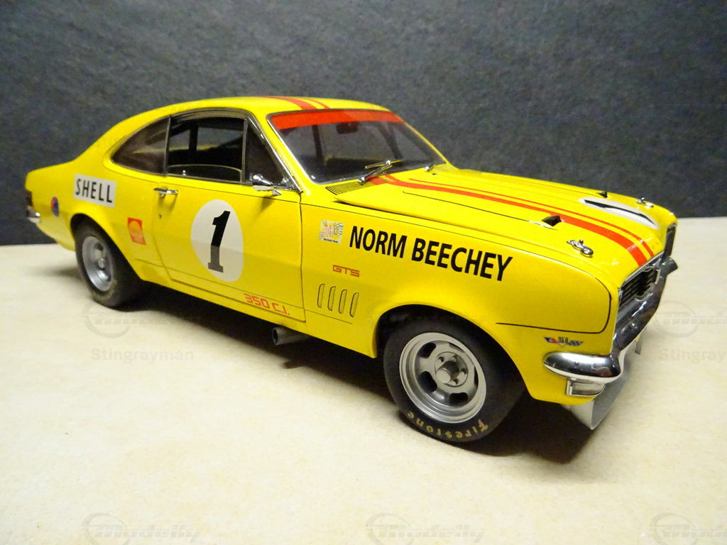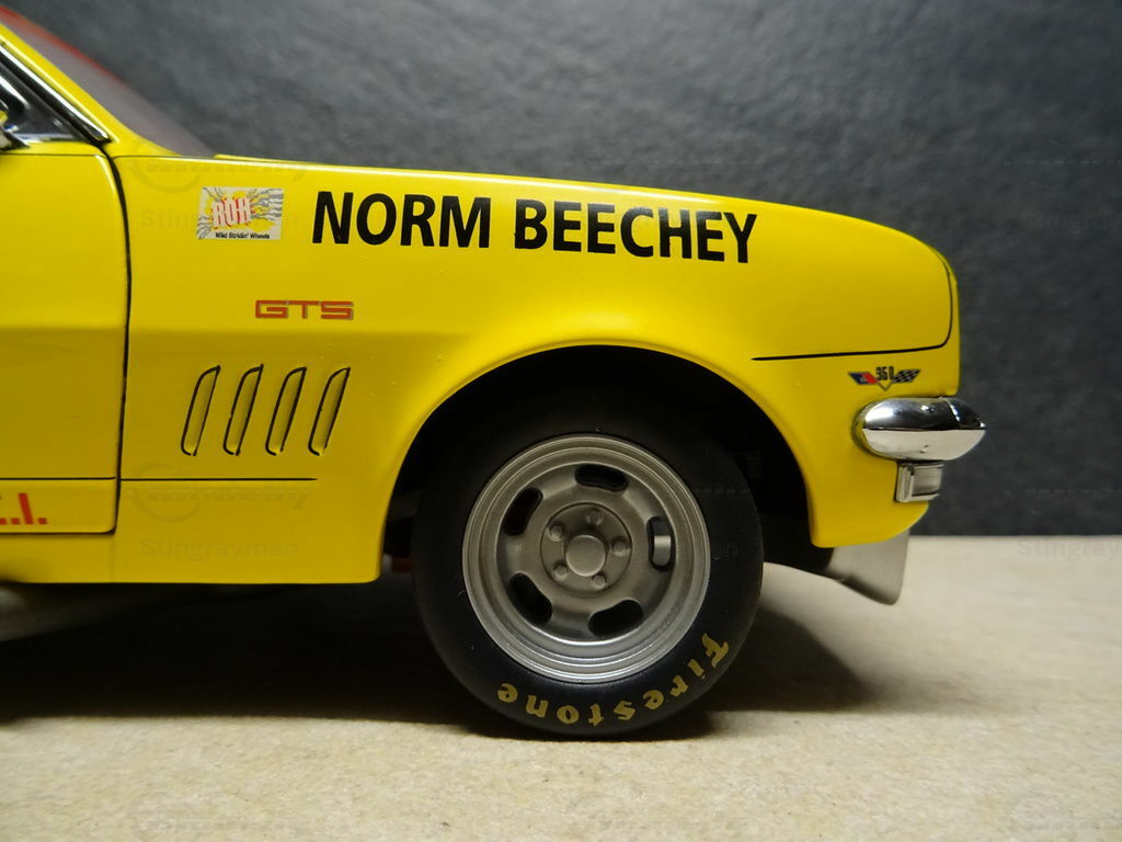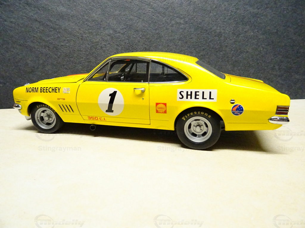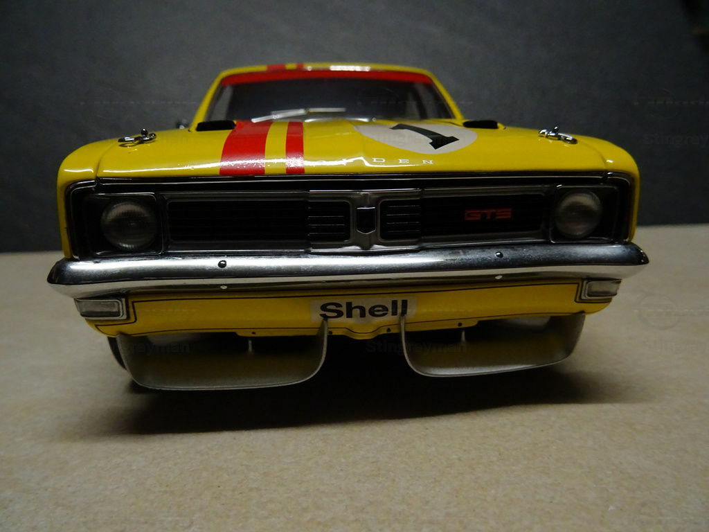 Dieses Modellauto im 1:18 Maßstab wurde von Classic Carlectables gefertigt und bildet den Holden Monaro HT detailgetreu nach. Das Modell ist aus Diecast-Material hergestellt und besticht durch seine hohe Detailtreue und Qualität. Auf den Fotos des Modells, welches in der Sammlung von Modelly Mitglied "Stingrayman" ist, sind viele präzise Details sichtbar, darunter die markante Frontpartie mit dem GTS-Emblem, detaillierte Felgen und der charakteristische Lack in Gelb mit roten Streifen und der Nummer 1. Jede kleine Nuance des Originals wurde akribisch nachgebildet, von den Scheinwerfern bis zu den Sponsorenaufklebern wie Shell und Repco.