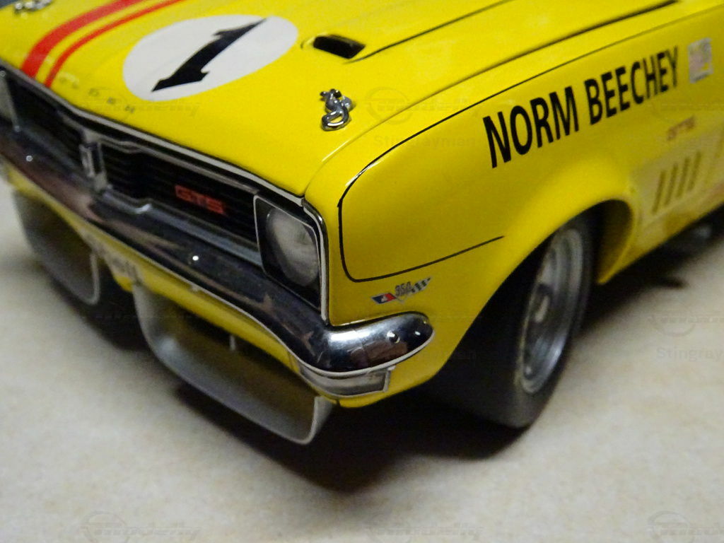 Der Monaro HT GTS im Modellformat, hergestellt von Classic Carlectables, hat einiges zu bieten. Die markante Lackierung in leuchtendem Gelb mit roten Streifen ist sofort erkennbar und verleiht dem Modell eine dynamische und sportliche Optik. Auffällig ist auch die Nummer 1 auf der Motorhaube, die an die Rennhistorie erinnert. Auf der Karosserie sind Sponsorenaufkleber wie Shell und Repco sorgfältig platziert. Diese Details verleihen dem Modell einen authentischen Look und wecken nostalgische Erinnerungen an die glorreichen Tage des Rennsports.