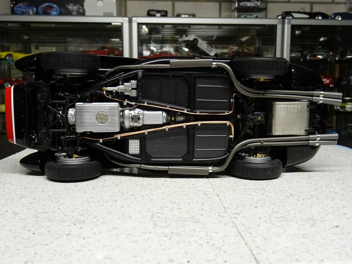 Die Lackierung und das Design des Ferrari 250 Testa Rossa "Pontoon Fender" Modells vom Hersteller CMC im Maßstab 1:18 sind außergewöhnlich detailliert. Das tiefschwarze Äußere, kombiniert mit roten Akzenten und den präzise nachgebildeten Speichenfelgen, verleiht dem Modell eine authentische und ansprechende Optik. Das Ferrari-Logo ist auf beiden Seiten des Wagens prominent platziert und unterstreicht die Identität dieses legendären Fahrzeugs. Die Startnummer "124" und die Sponsoren-Aufkleber, wie zum Beispiel die von Shell und Firestone, sind ebenfalls sorgfältig reproduziert, was die Authentizität weiter erhöht. Diese Miniatur ist ein Must-Have für jeden Modellautosammler.