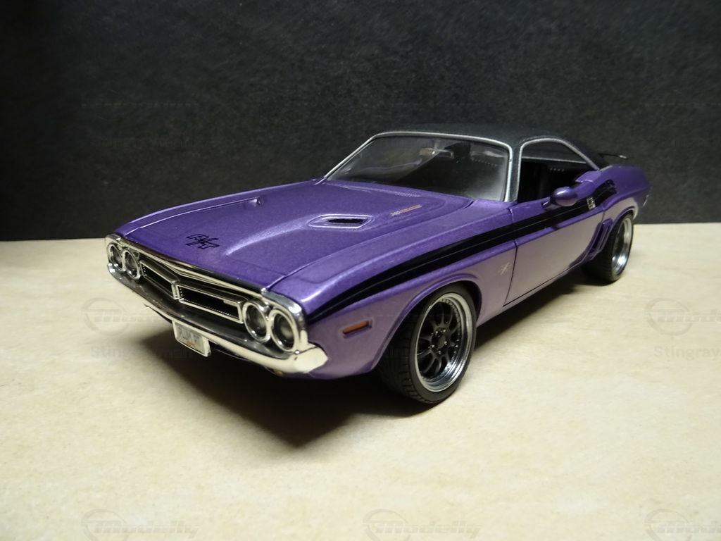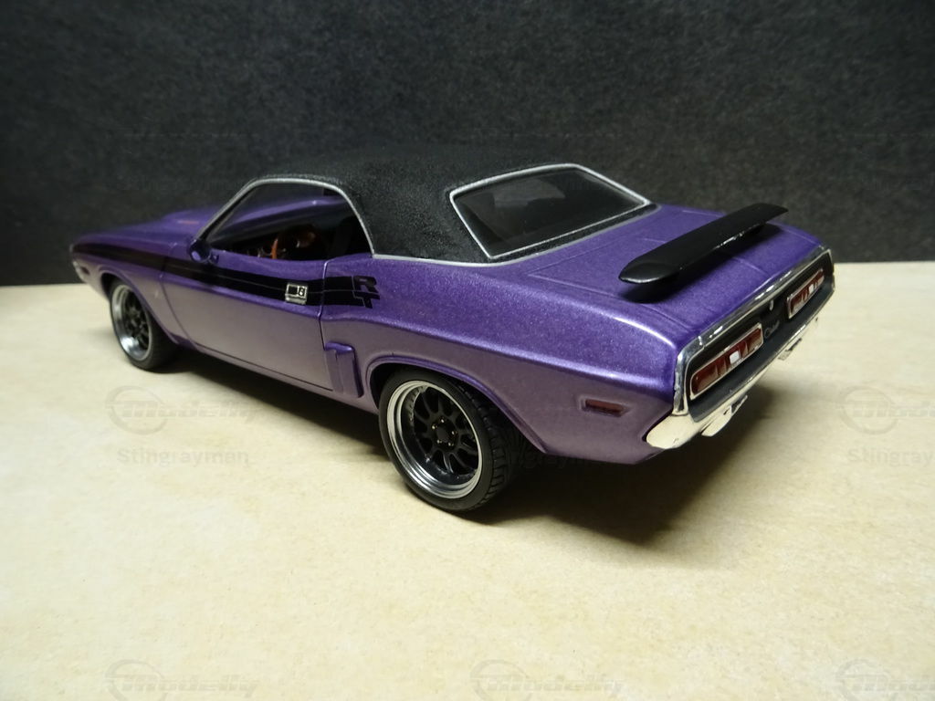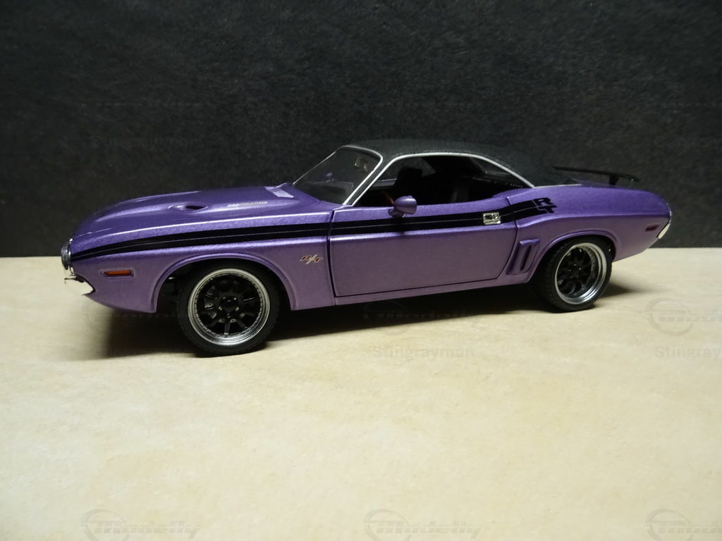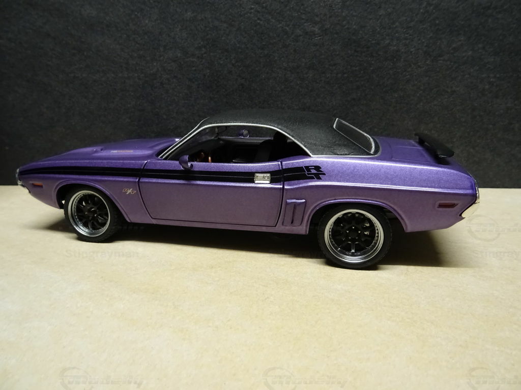 Das Modellauto, das in der Sammlung des Modelly-Mitglieds "Stingrayman" enthalten ist, beeindruckt mit einer auffälligen Lackierung in einem satten Lila-Ton. Diese besondere Farbgebung nennt sich "Plum Crazy Purple", eine der legendären Farben von Dodge, die das aggressive Design des Fahrzeugs noch weiter betont. Außerdem sind schwarze Zierstreifen entlang der Seiten des Fahrzeugs zu sehen, die das sportliche Design des Originals widerspiegeln. Das Modell ist weiterhin durch spezielle, nicht originale Räder gekennzeichnet, die ihm eine persönliche Note verleihen. Auf der Motorhaube und an den Seiten befinden sich dezente „R/T“-Badges, die auf die Hochleistungsvariante hinweisen. Die glänzenden Chromdetails an den Stoßfängern, den Türgriffen und dem Kühlergrill steigern den visuellen Reiz dieses Modells noch weiter.