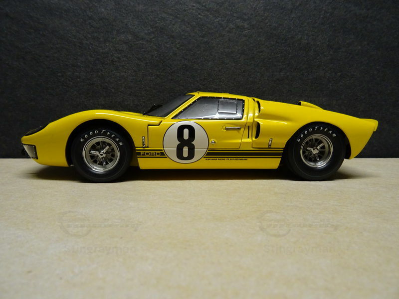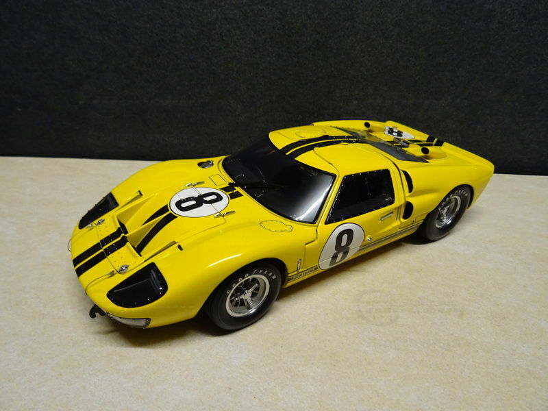 Das hier gezeigte Modellauto im Maßstab 1:18, hergestellt von Exoto Racing Legends, ist eine detailgetreue Nachbildung des Ford GT40 Mk2, basierend auf dem Material Diecast. Die auffallende gelbe Lackierung mit schwarzen Streifen fängt die Essenz des Originals perfekt ein. Es handelt sich um ein Modell aus der Sammlung des Modelly-Mitglieds "Stingrayman". Die schwarze Rennnummer „8“ und die Sponsorenaufkleber von Goodyear sind authentisch nachgebildet und verleihen dem Modell ein realistisches Aussehen. Des Weiteren sind die präzise nachgebildeten Felgen und die detaillierten Scheinwerfer hervorzuheben.