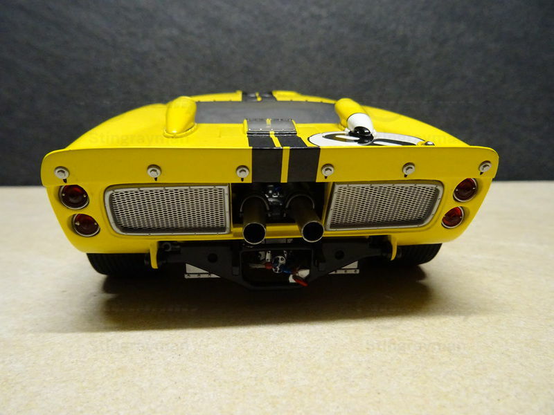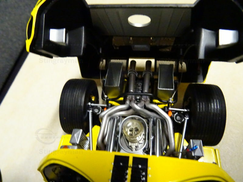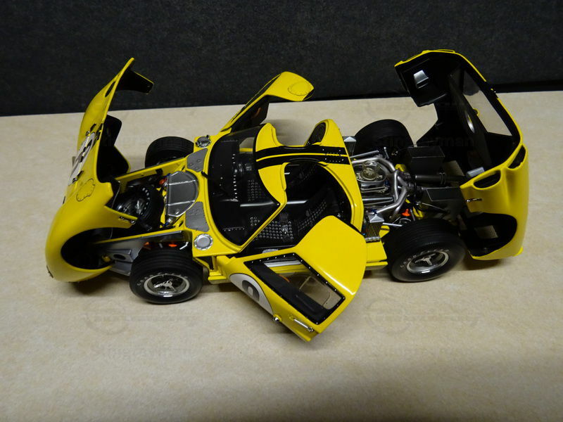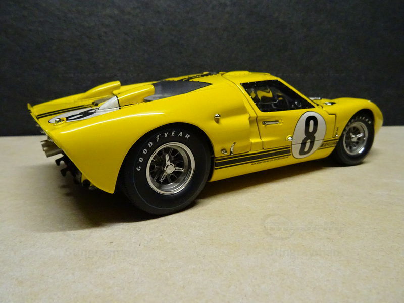 Das Modellauto besticht durch die farbliche Gestaltung und die Detailtreue. Die gelbe Grundfarbe mit den scharfen schwarzen Linien erzeugt einen auffälligen Kontrast und hebt die dynamische Form des Fahrzeugs hervor. Jedes Detail, von den fein strukturierten Lüftungsöffnungen bis hin zu den radialen Reifen von Goodyear, ist sorgfältig ausgearbeitet. Im Heckbereich sind die Auspuffrohre und der Diffusor originalgetreu nachgebildet. Diese Nachbildung im Maßstab 1:18 ist eine wahre Augenweide für Modellauto-Sammler und Liebhaber des historischen Motorsports.