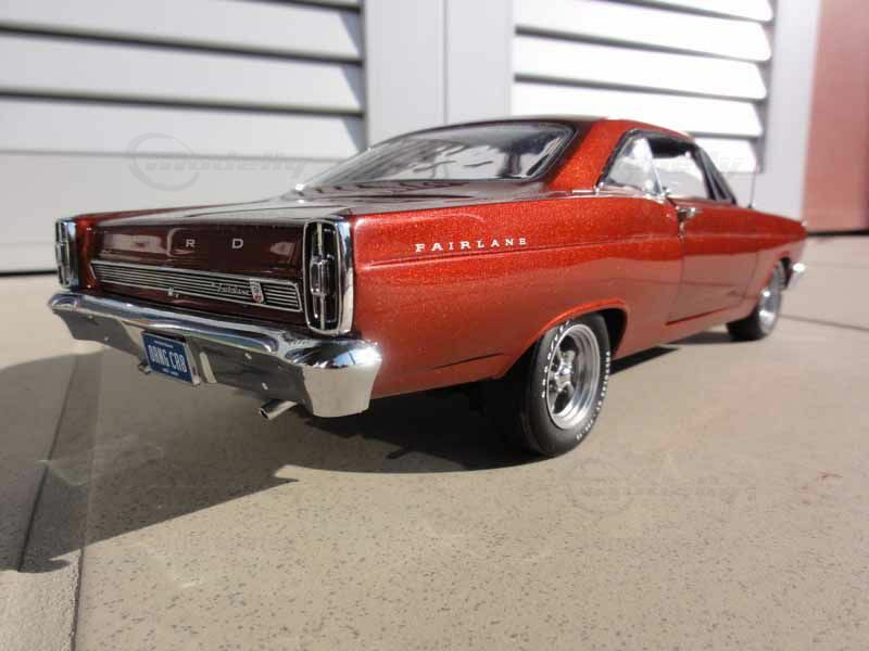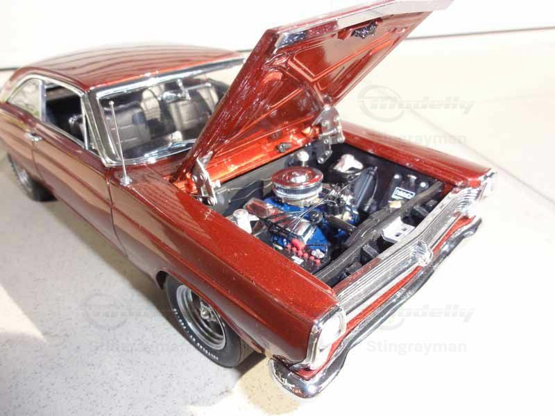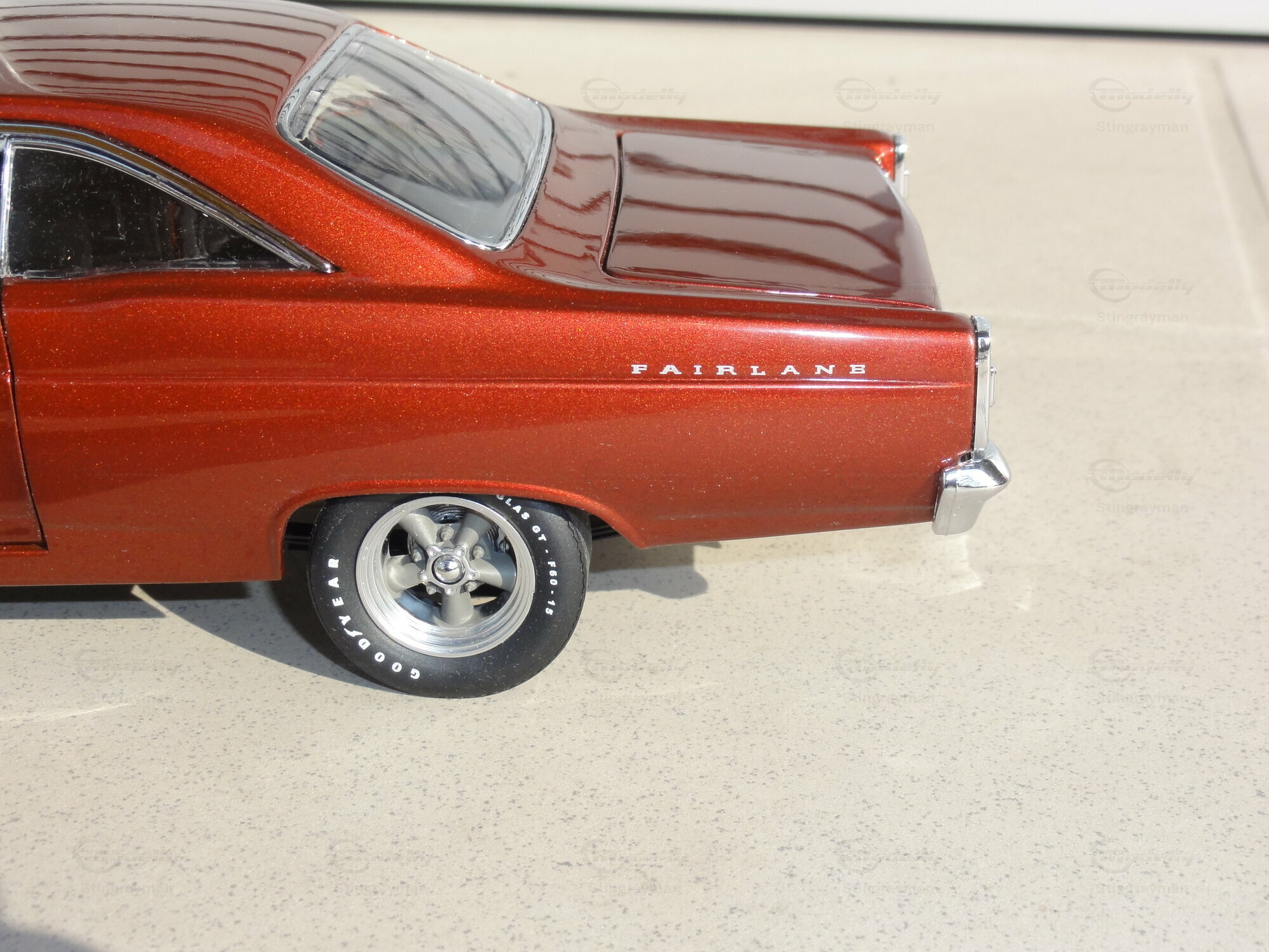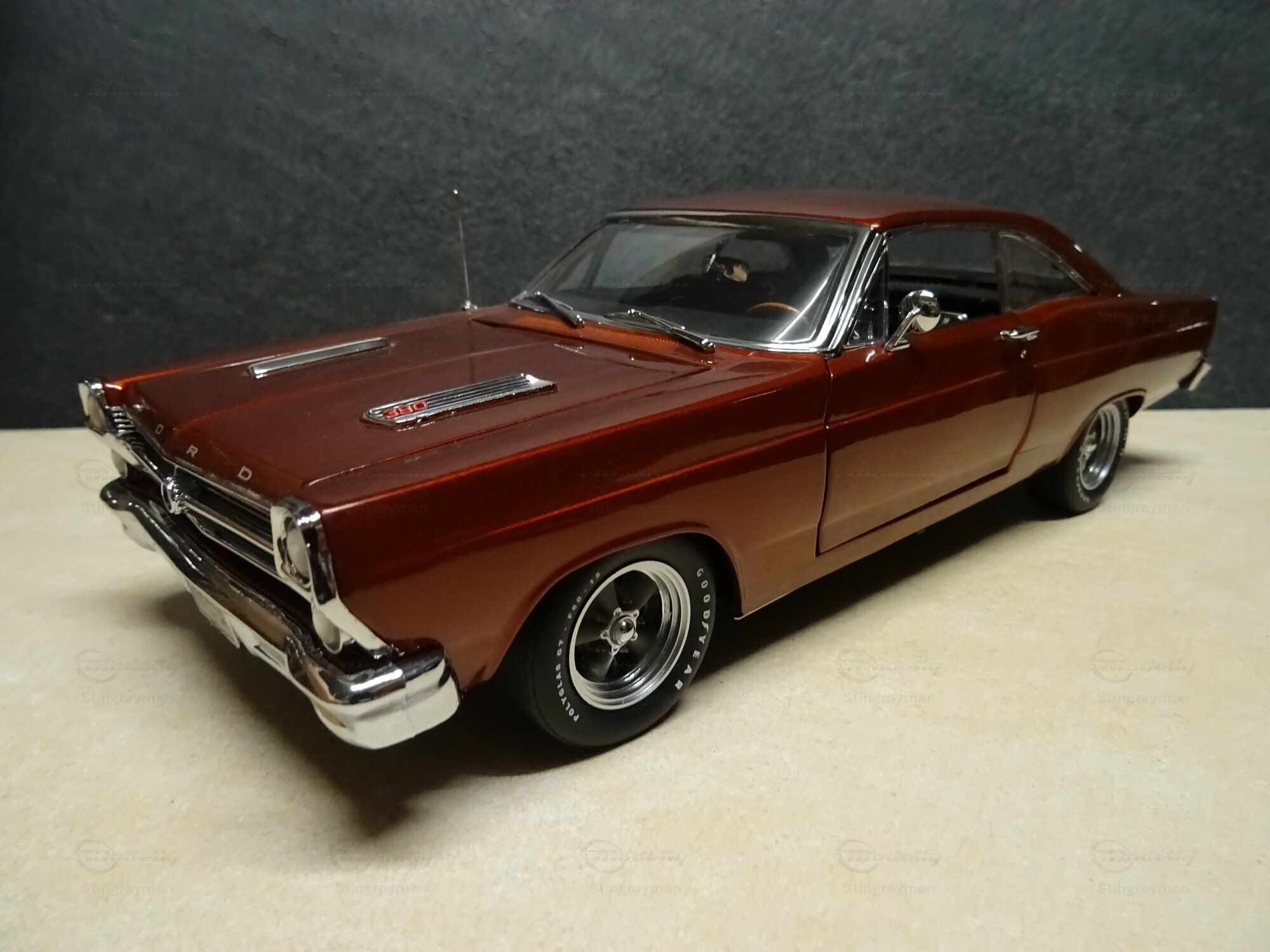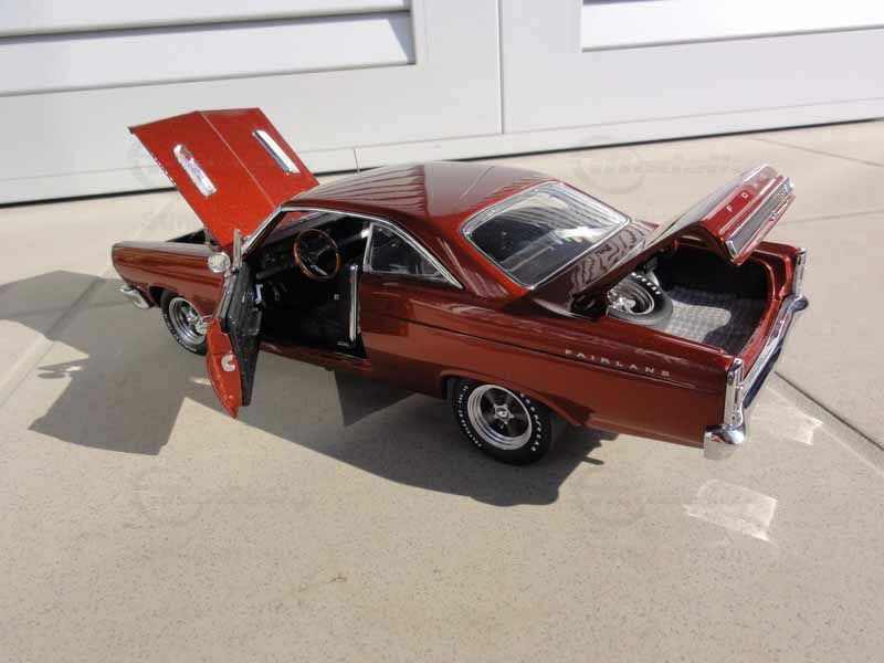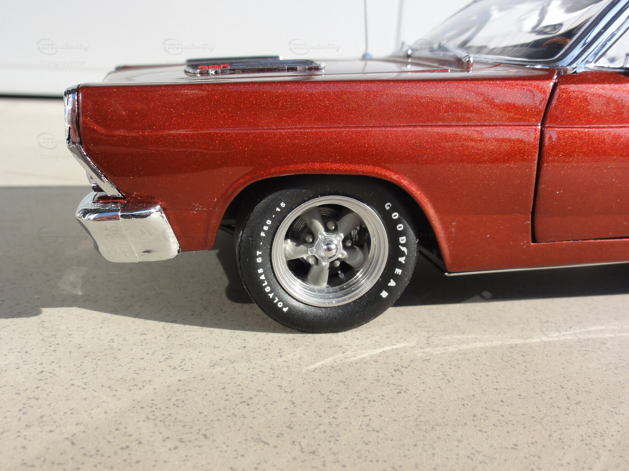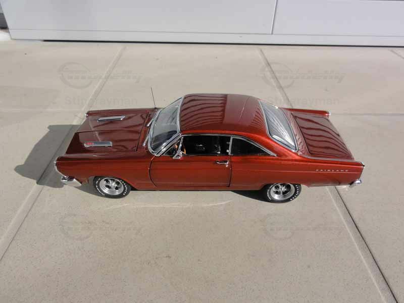 Das Modellauto im Maßstab 1:18, hergestellt von GMP, ist eine präzise Nachbildung des Ford Fairlane. Dieses Modell ist Teil der Sammlung von Modelly-Mitglied "Stingrayman". Es zeichnet sich durch eine detailreiche Verarbeitung aus, darunter funktionierende Türen, eine öffnende Motorhaube und ein detailliertes Interieur. Die roten Lackierung mit einem leicht metallischen Glanz verleiht dem Modell einen authentischen Look. Zudem sind auf der Karosserie die originalen Schriftzüge und Embleme sorgfältig reproduziert. Die Felgen des Modells scheinen von einem renommierten Hersteller, möglicherweise American Racing, zu stammen und tragen wesentlich zur Gesamtoptik bei.