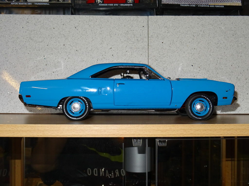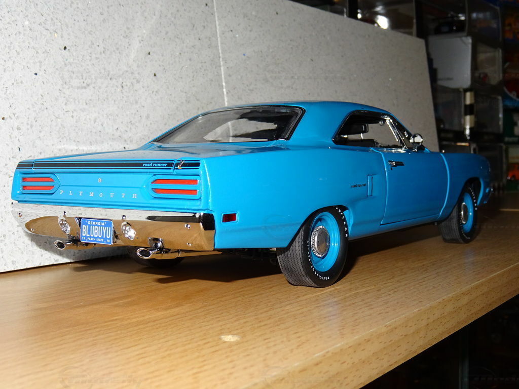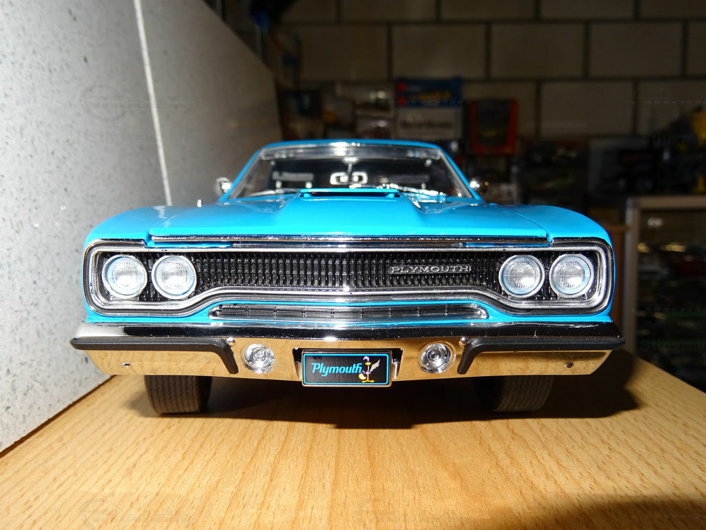 Das hier dargestellte Miniaturmodell des Plymouth Road Runner in 1:18 Scale wurde von GMP hergestellt und gehört zur Sammlung von Modelly-Mitglied "Stingrayman". Das Modell ist aus Diecast-Material und punktet mit detaillierter Verarbeitung und Authentizität. Auffällig ist die blaue Lackierung des Modells, die sorgfältig aufgetragen wurde und die Konturen und Designelemente des Originals realistisch wiedergibt. Die Frontansicht zeigt die Fahrzeugfront mit den charakteristischen Doppelscheinwerfern und dem markanten Kühlergrill, die den aggressiven Look der zweiten Generation des Plymouth Road Runner widerspiegeln. Auf der Seite des Modells sind die präzise proportionierte Form und die korrekt nachgebildeten Details der Radkästen und Räder ebenfalls gut zu sehen. Die Räder sind markant gestaltet und unterstreichen die sportliche Optik des Fahrzeugs.