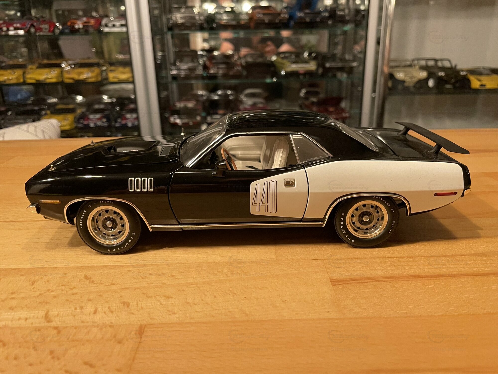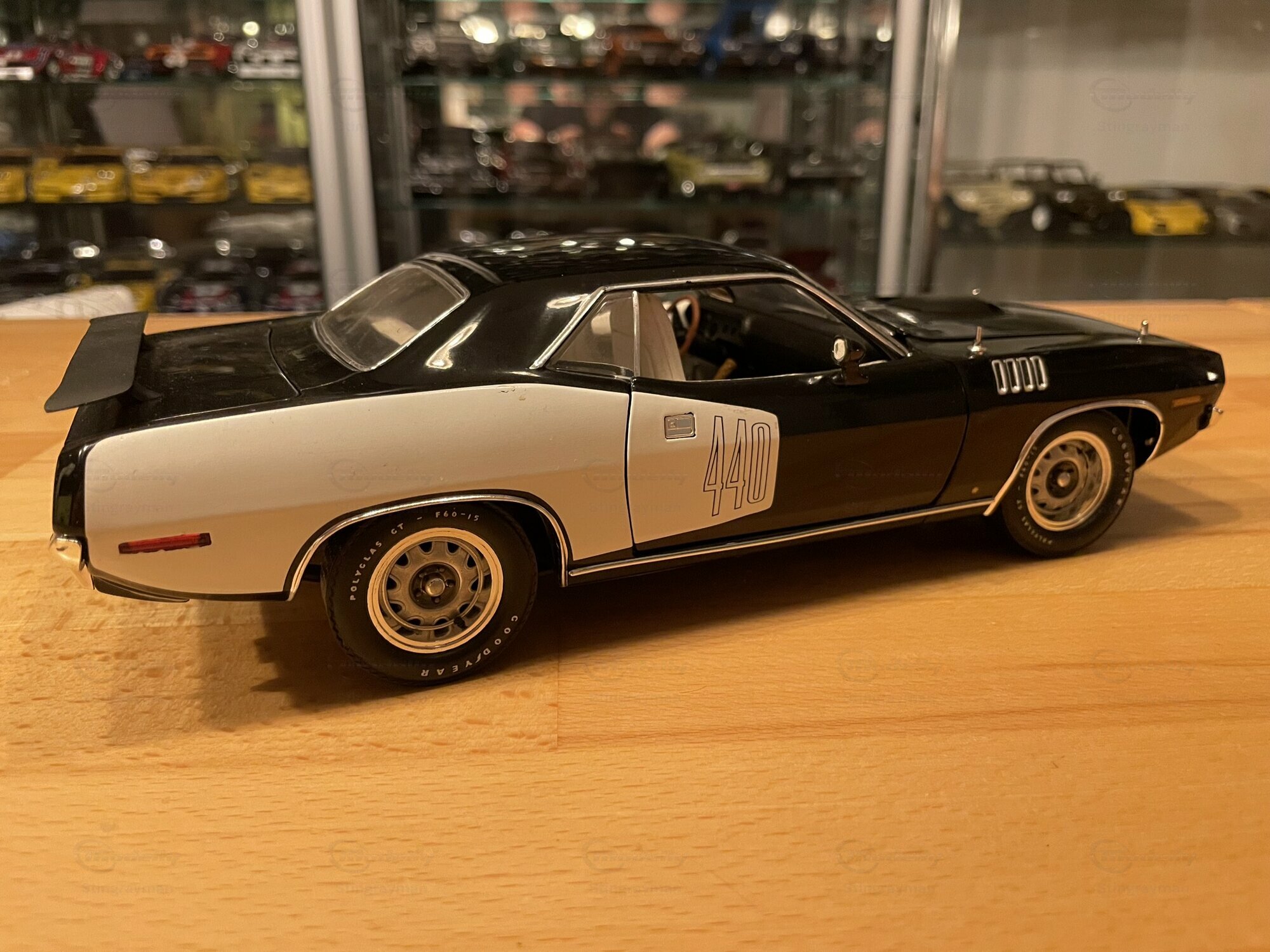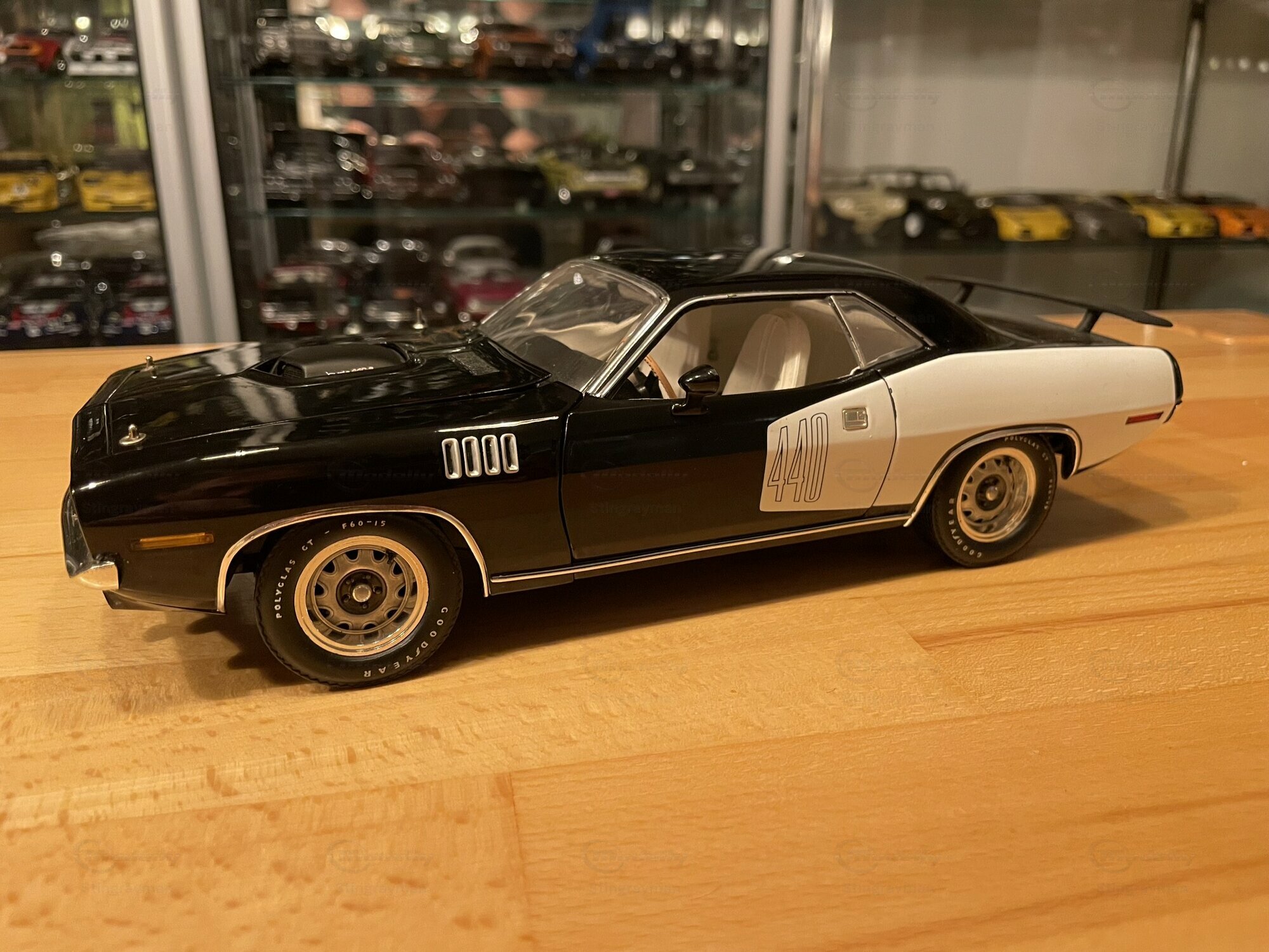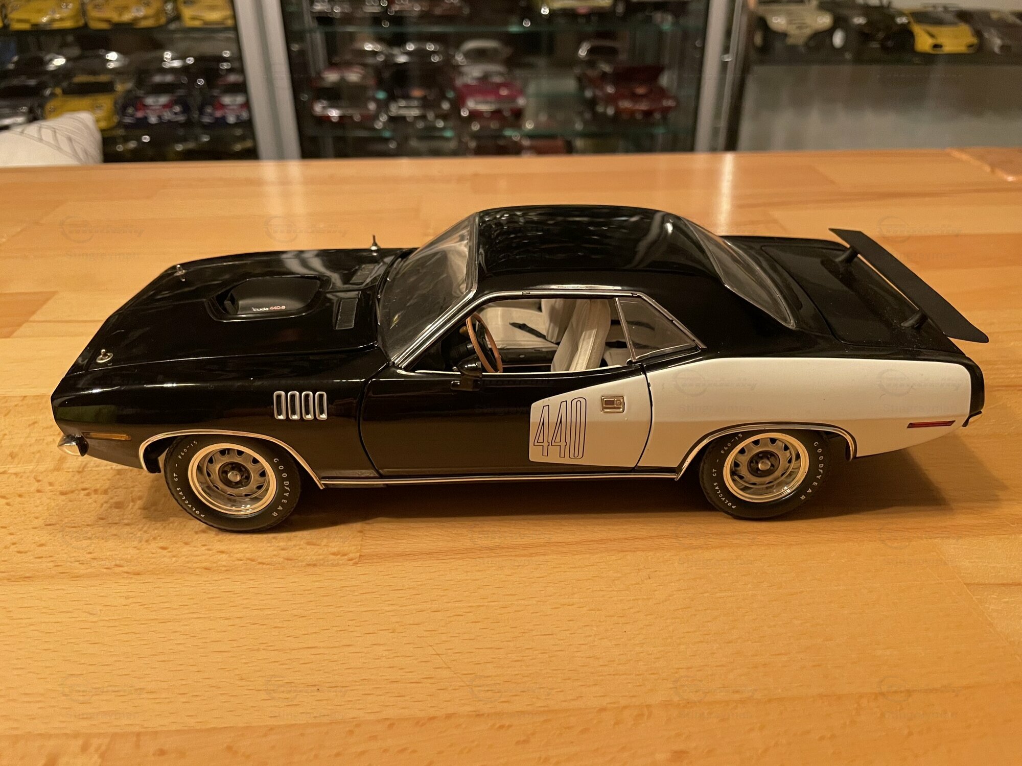 Das hier gezeigte Modellauto ist im Maßstab 1:18 von Highway 61 gefertigt und aus hochwertigem Diecast-Material hergestellt. In der Sammlung von Modelly-Mitglied "Stingrayman" zeigt das Modell sorgfältige Details, darunter eine detaillierte Motorhaube und Innenausstattung, die den originalen Plymouth Barracuda akkurat widerspiegeln. Die Lackierung des Modells ist in einem markanten Schwarz-Weiß-Farbmuster gehalten, mit dem "440"-Emblem, das den leistungsstarken Motor des Originals hervorhebt. Die Reifen tragen den Schriftzug "Goodyear Polyglas GT", was der Authentizität des Modells zusätzliche Tiefe verleiht. Der charakteristische Heckspoiler und die Belüftungsschlitze auf der Motorhaube und den Kotflügeln heben die sportliche Optik des Modells hervor.