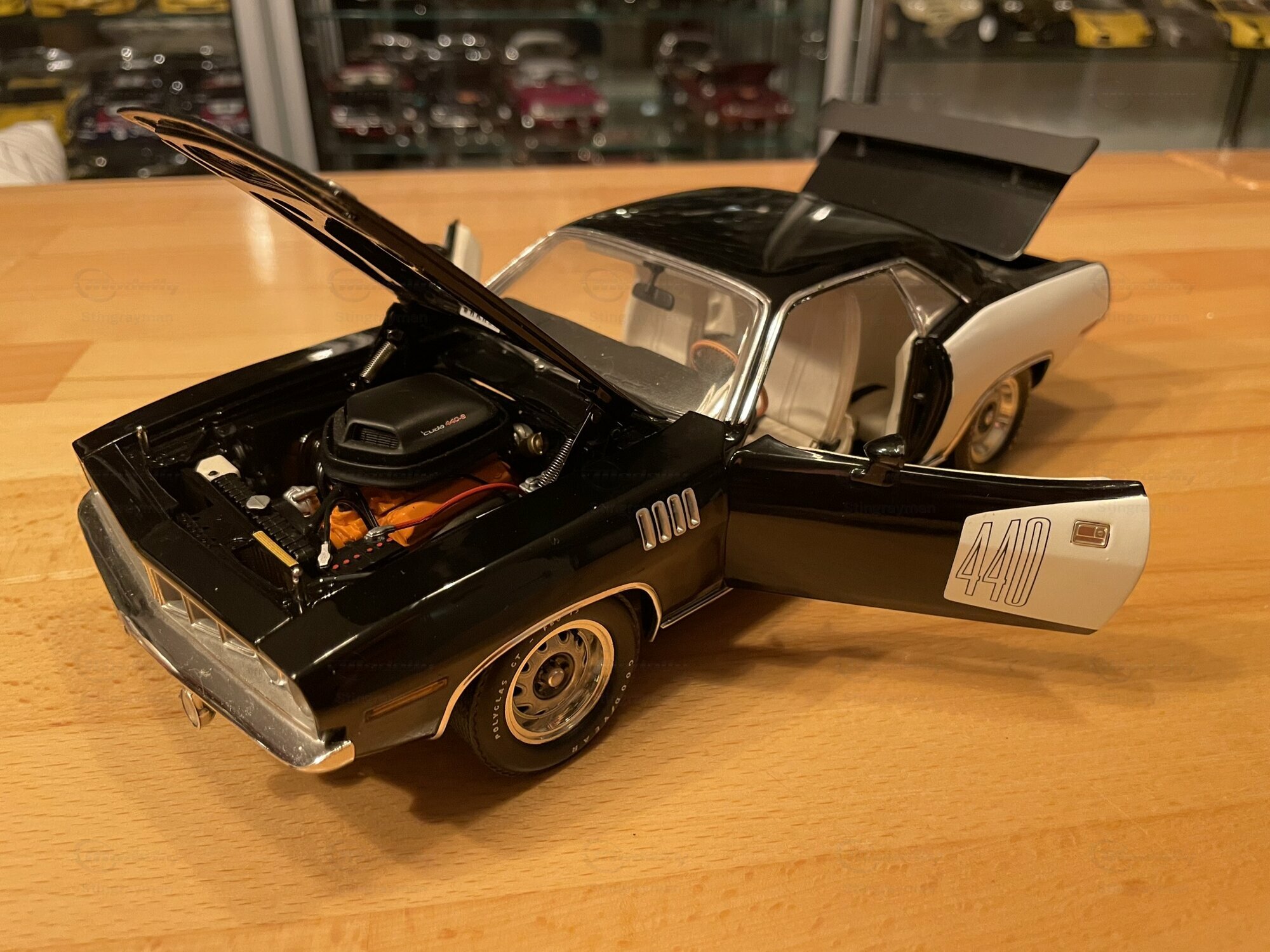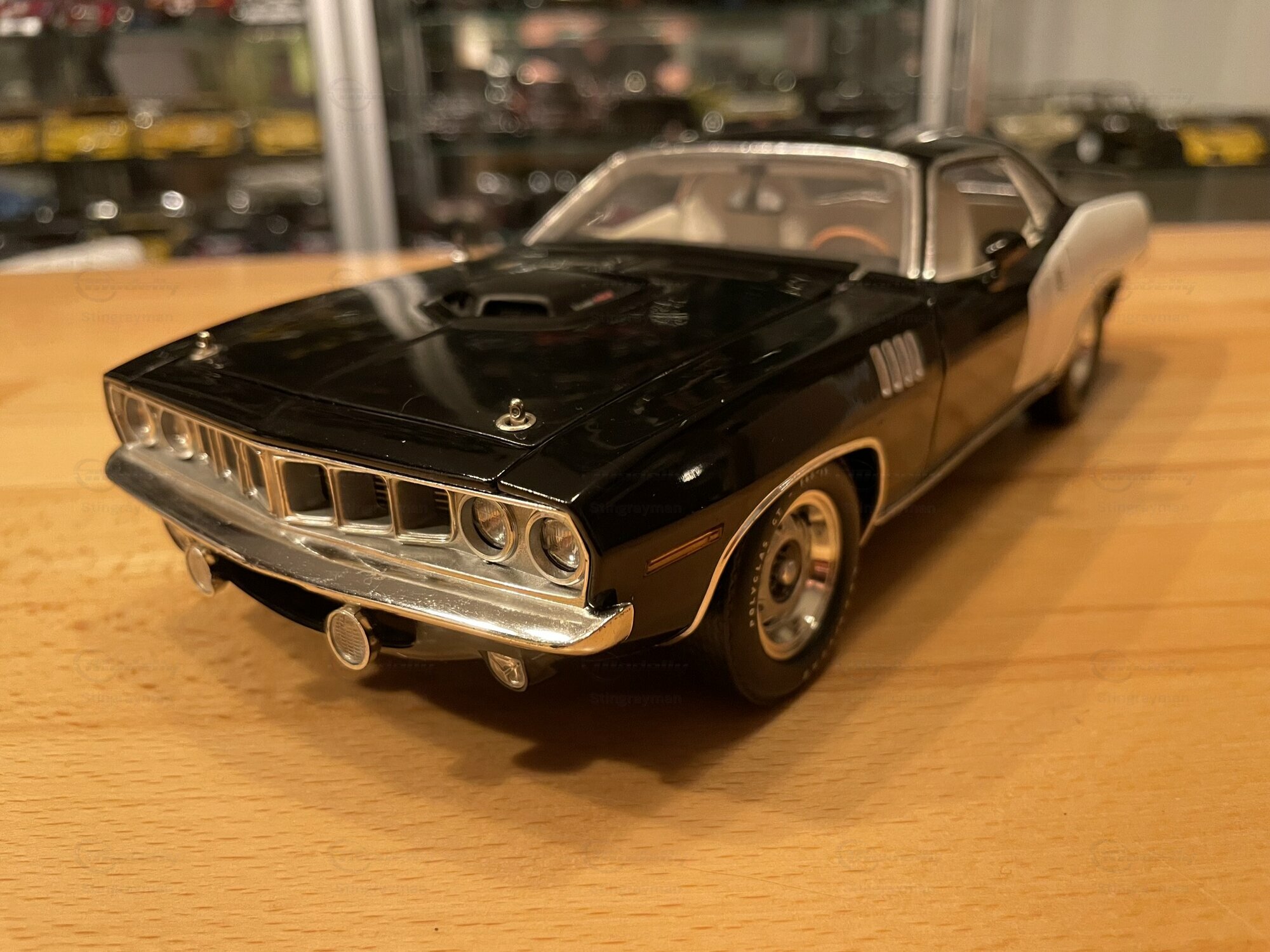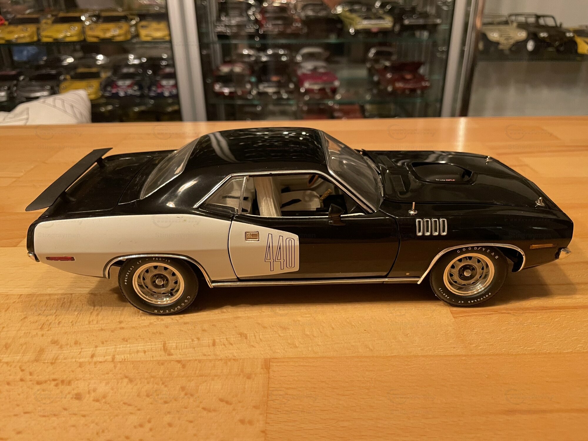 Das hier gezeigte Modellauto ist im Maßstab 1:18 von Highway 61 gefertigt und aus hochwertigem Diecast-Material hergestellt. In der Sammlung von Modelly-Mitglied "Stingrayman" zeigt das Modell sorgfältige Details, darunter eine detaillierte Motorhaube und Innenausstattung, die den originalen Plymouth Barracuda akkurat widerspiegeln. Die Lackierung des Modells ist in einem markanten Schwarz-Weiß-Farbmuster gehalten, mit dem "440"-Emblem, das den leistungsstarken Motor des Originals hervorhebt. Die Reifen tragen den Schriftzug "Goodyear Polyglas GT", was der Authentizität des Modells zusätzliche Tiefe verleiht. Der charakteristische Heckspoiler und die Belüftungsschlitze auf der Motorhaube und den Kotflügeln heben die sportliche Optik des Modells hervor.