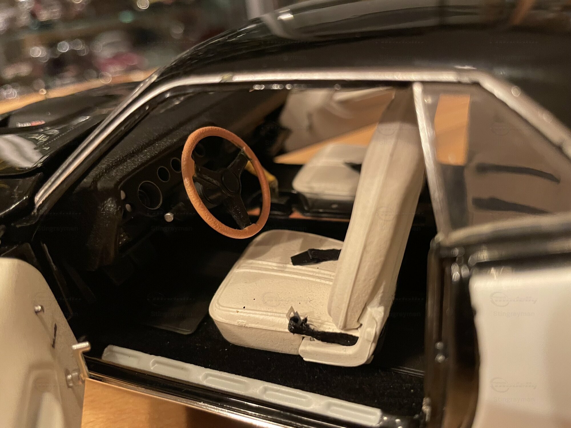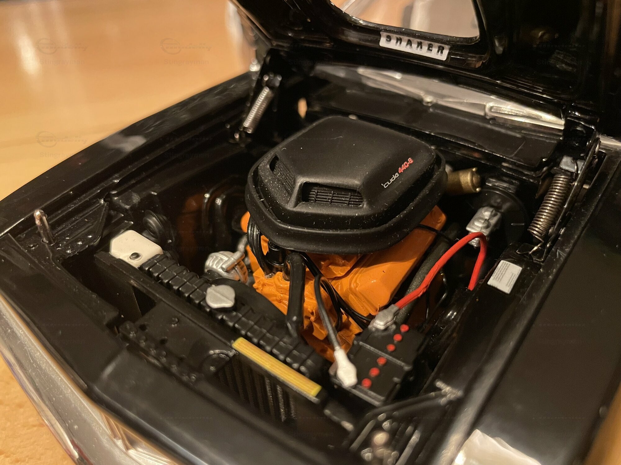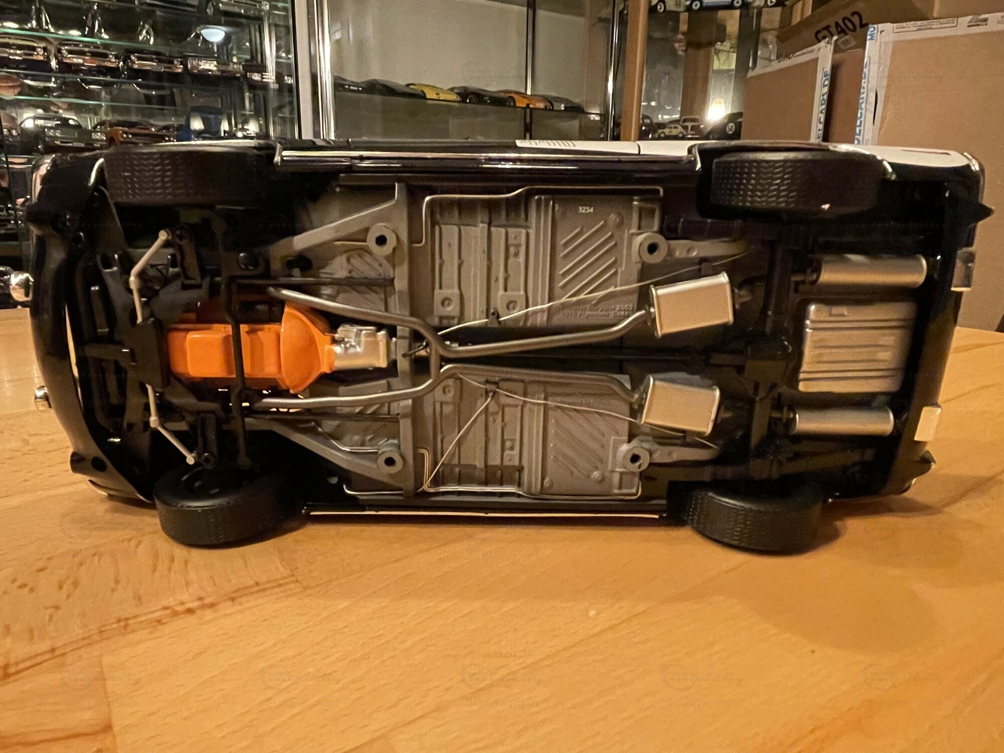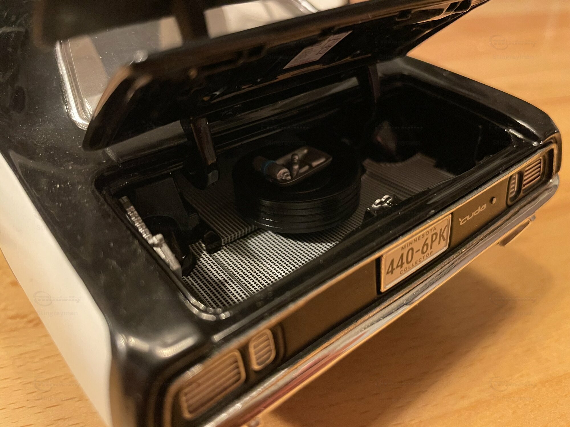 Das hier gezeigte Modellauto ist im Maßstab 1:18 von Highway 61 gefertigt und aus hochwertigem Diecast-Material hergestellt. In der Sammlung von Modelly-Mitglied "Stingrayman" zeigt das Modell sorgfältige Details, darunter eine detaillierte Motorhaube und Innenausstattung, die den originalen Plymouth Barracuda akkurat widerspiegeln. Die Lackierung des Modells ist in einem markanten Schwarz-Weiß-Farbmuster gehalten, mit dem "440"-Emblem, das den leistungsstarken Motor des Originals hervorhebt. Die Reifen tragen den Schriftzug "Goodyear Polyglas GT", was der Authentizität des Modells zusätzliche Tiefe verleiht. Der charakteristische Heckspoiler und die Belüftungsschlitze auf der Motorhaube und den Kotflügeln heben die sportliche Optik des Modells hervor.