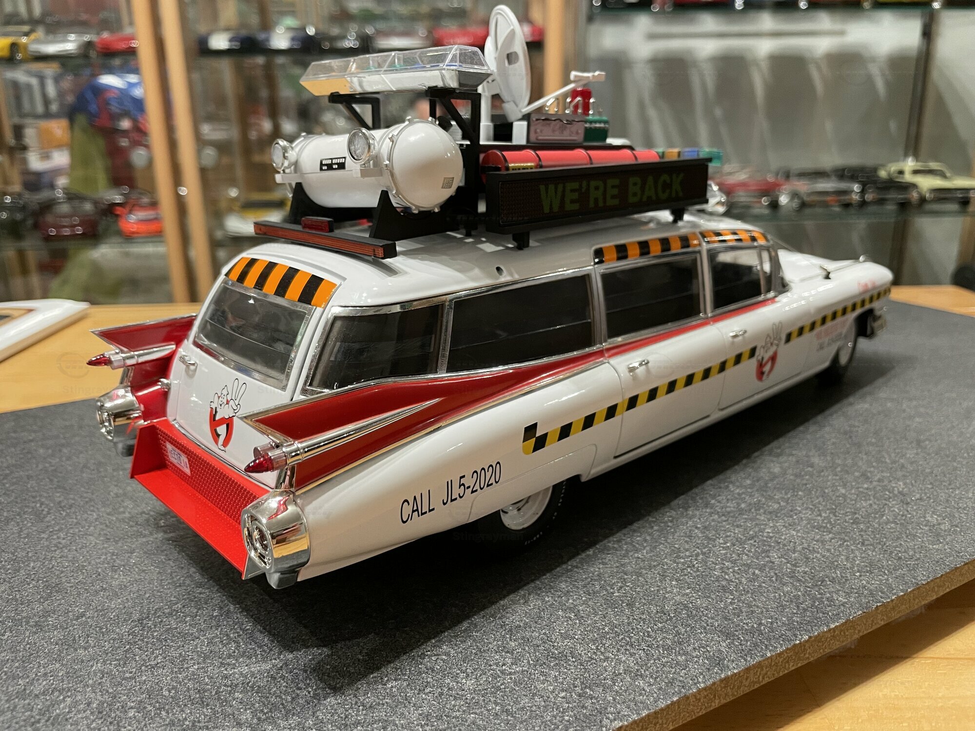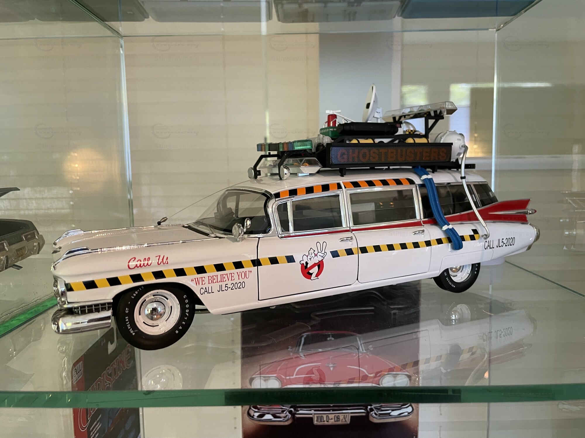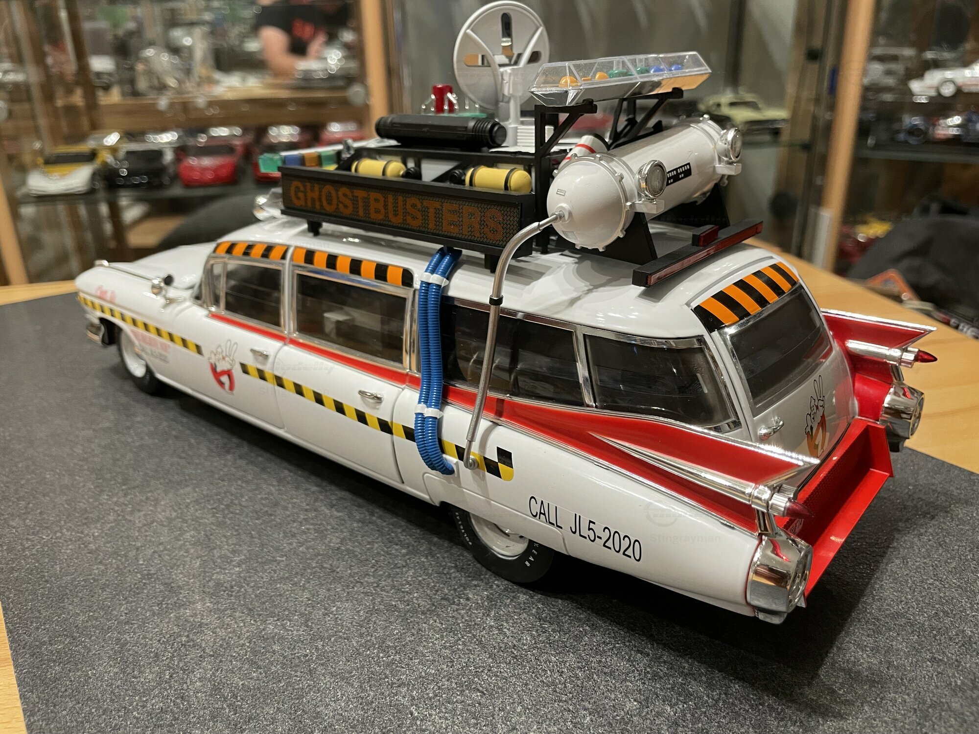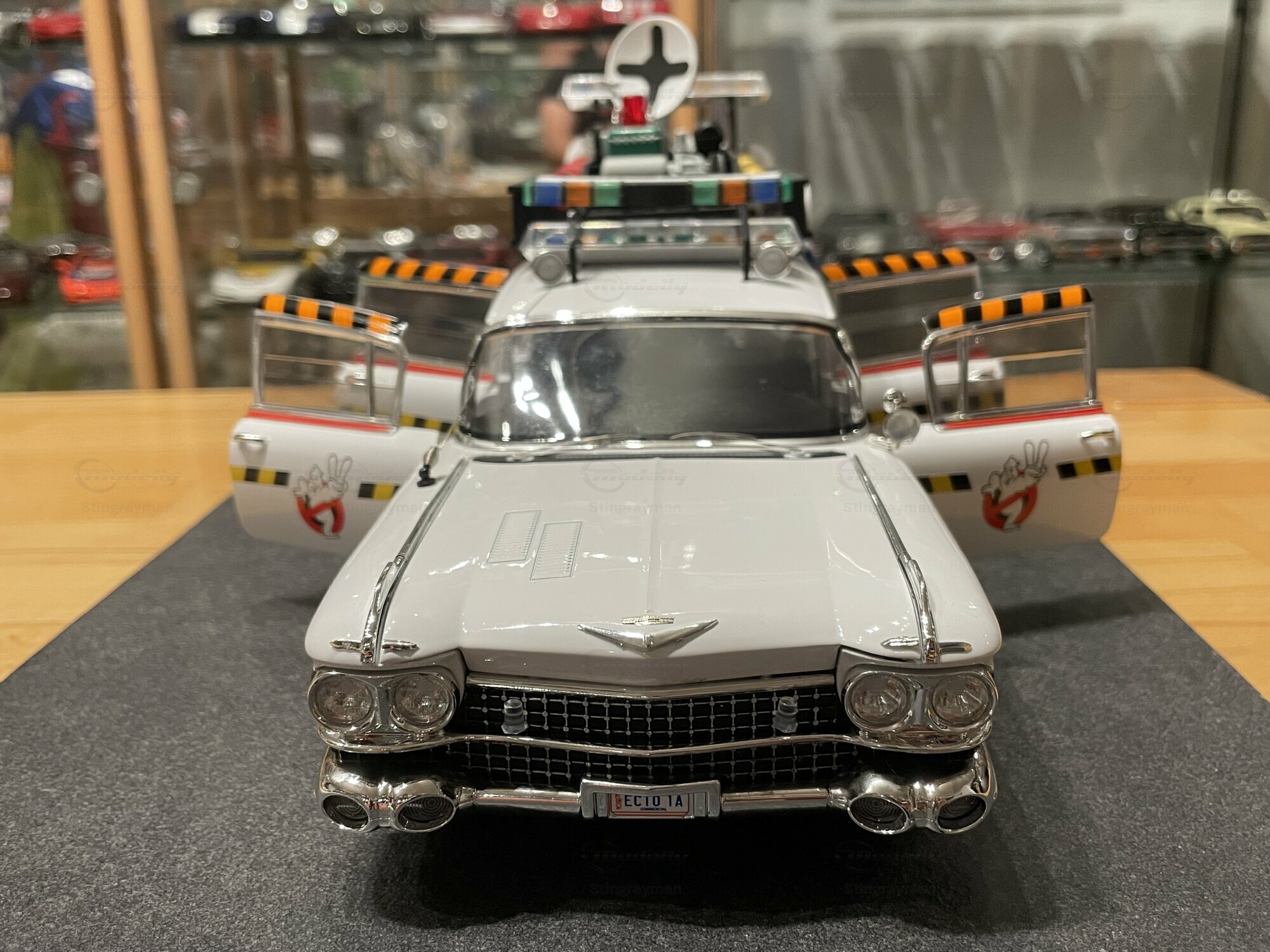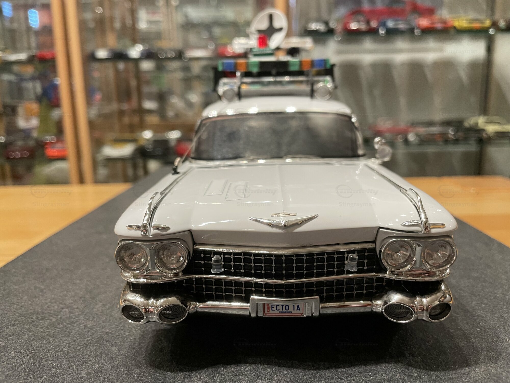 Für viele Sammler ist der ECTO-1A vor allem wegen seiner eigenständigen Beschriftung und der im Film verwendeten Zusatzausrüstung interessant. Die Miniatur von Hot Wheels Elite bildet diese Erkennungsmerkmale sichtbar nach: Die Dachkonstruktion mit radarähnlicher Scheibe, die farblich abgesetzten Kabel und Kästen sowie die transluzenten Lichtbalken erzeugen den typischen Gerätemix des ECTO-1A. Die Lackierung in Weiß mit roten Akzenten harmoniert mit der großflächigen Chromausstattung des 1959er Cadillac, wozu Front- und Heckstoßfänger, Fensterrahmen und die langen seitlichen Zierleisten zählen. Besonders prägnant sind die spitz auslaufenden vorderen Kotflügel und die langen Heckflossen, die in dieser Generation von Cadillac die Formensprache prägten. Das Modell zeigt auf der linken Seite die Figurenplatzierung der Geisterjäger besonders gut; auf den Fotos in Stingraymans Vitrine stehen passende Figuren davor, was den Maßstab realistisch unterstreicht. Während der ECTO-1A im Film als rollende Werbefläche fungierte, spiegelt das Modell diese Funktion anhand der feinen Tampondrucke und der großen Matrix-Tafel wider. Sammler sollten beim Handling die filigranen Dachteile und Antennen beachten; die Druckgusskarosserie verleiht zwar Stabilität, die Anbauten sind jedoch klein dimensioniert. In einer Sammlung mit Filmfahrzeugen lässt sich das Modell gut neben dem Vorgänger ECTO-1 oder anderen Cadillac-Umsetzungen der Jahre 1959–1960 platzieren. Wer technische Hintergründe schätzt, findet in den Dimensionen und dem V8-Antrieb der Cadillac-Basis einen Beleg dafür, warum das Filmteam genau dieses Fahrgestell auswählte: Platzangebot, Tragfähigkeit und die ikonische Form machten den ECTO-1A möglich.