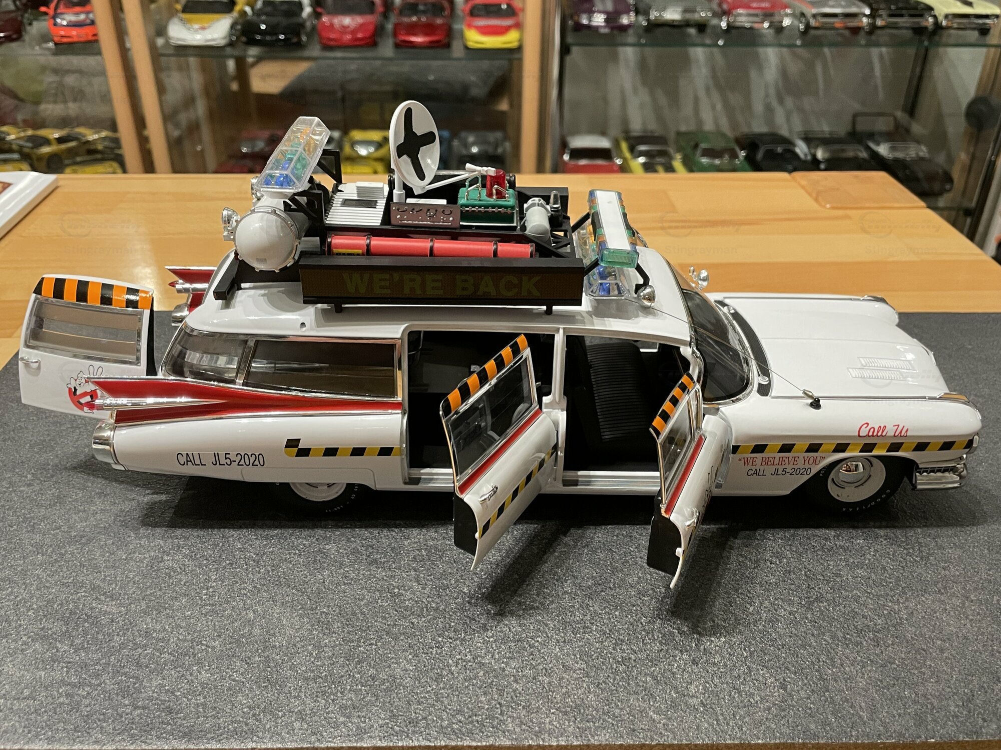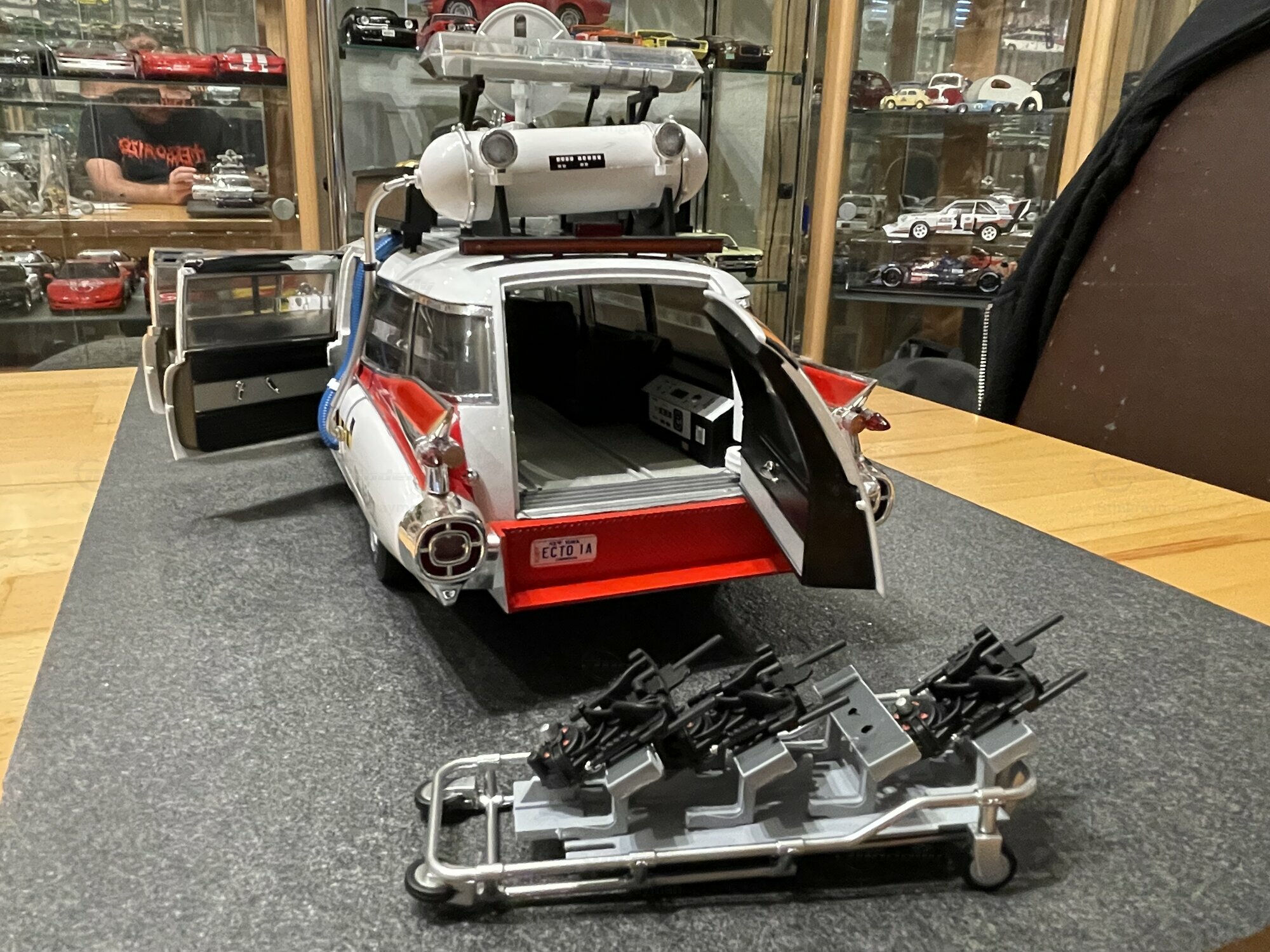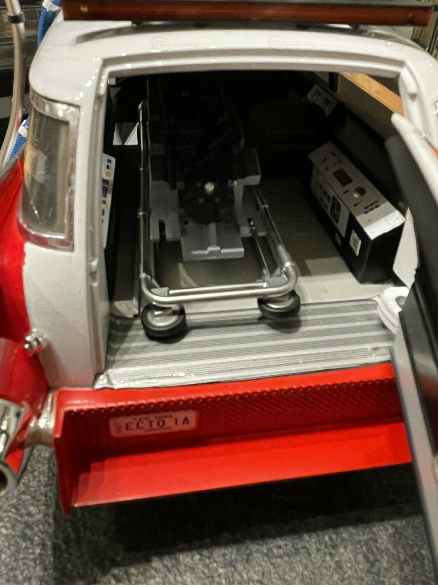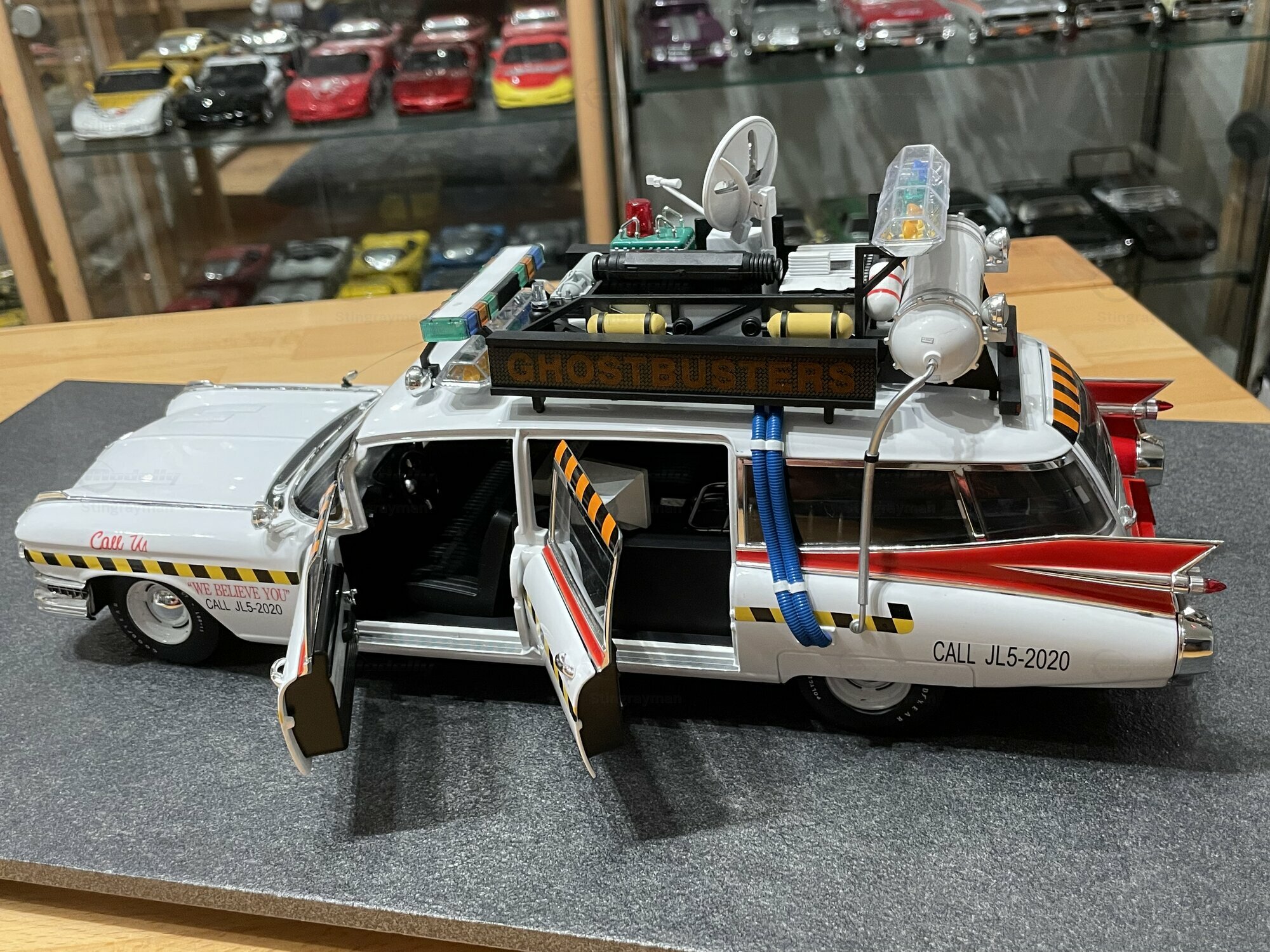 Für viele Sammler ist der ECTO-1A vor allem wegen seiner eigenständigen Beschriftung und der im Film verwendeten Zusatzausrüstung interessant. Die Miniatur von Hot Wheels Elite bildet diese Erkennungsmerkmale sichtbar nach: Die Dachkonstruktion mit radarähnlicher Scheibe, die farblich abgesetzten Kabel und Kästen sowie die transluzenten Lichtbalken erzeugen den typischen Gerätemix des ECTO-1A. Die Lackierung in Weiß mit roten Akzenten harmoniert mit der großflächigen Chromausstattung des 1959er Cadillac, wozu Front- und Heckstoßfänger, Fensterrahmen und die langen seitlichen Zierleisten zählen. Besonders prägnant sind die spitz auslaufenden vorderen Kotflügel und die langen Heckflossen, die in dieser Generation von Cadillac die Formensprache prägten. Das Modell zeigt auf der linken Seite die Figurenplatzierung der Geisterjäger besonders gut; auf den Fotos in Stingraymans Vitrine stehen passende Figuren davor, was den Maßstab realistisch unterstreicht. Während der ECTO-1A im Film als rollende Werbefläche fungierte, spiegelt das Modell diese Funktion anhand der feinen Tampondrucke und der großen Matrix-Tafel wider. Sammler sollten beim Handling die filigranen Dachteile und Antennen beachten; die Druckgusskarosserie verleiht zwar Stabilität, die Anbauten sind jedoch klein dimensioniert. In einer Sammlung mit Filmfahrzeugen lässt sich das Modell gut neben dem Vorgänger ECTO-1 oder anderen Cadillac-Umsetzungen der Jahre 1959–1960 platzieren. Wer technische Hintergründe schätzt, findet in den Dimensionen und dem V8-Antrieb der Cadillac-Basis einen Beleg dafür, warum das Filmteam genau dieses Fahrgestell auswählte: Platzangebot, Tragfähigkeit und die ikonische Form machten den ECTO-1A möglich.