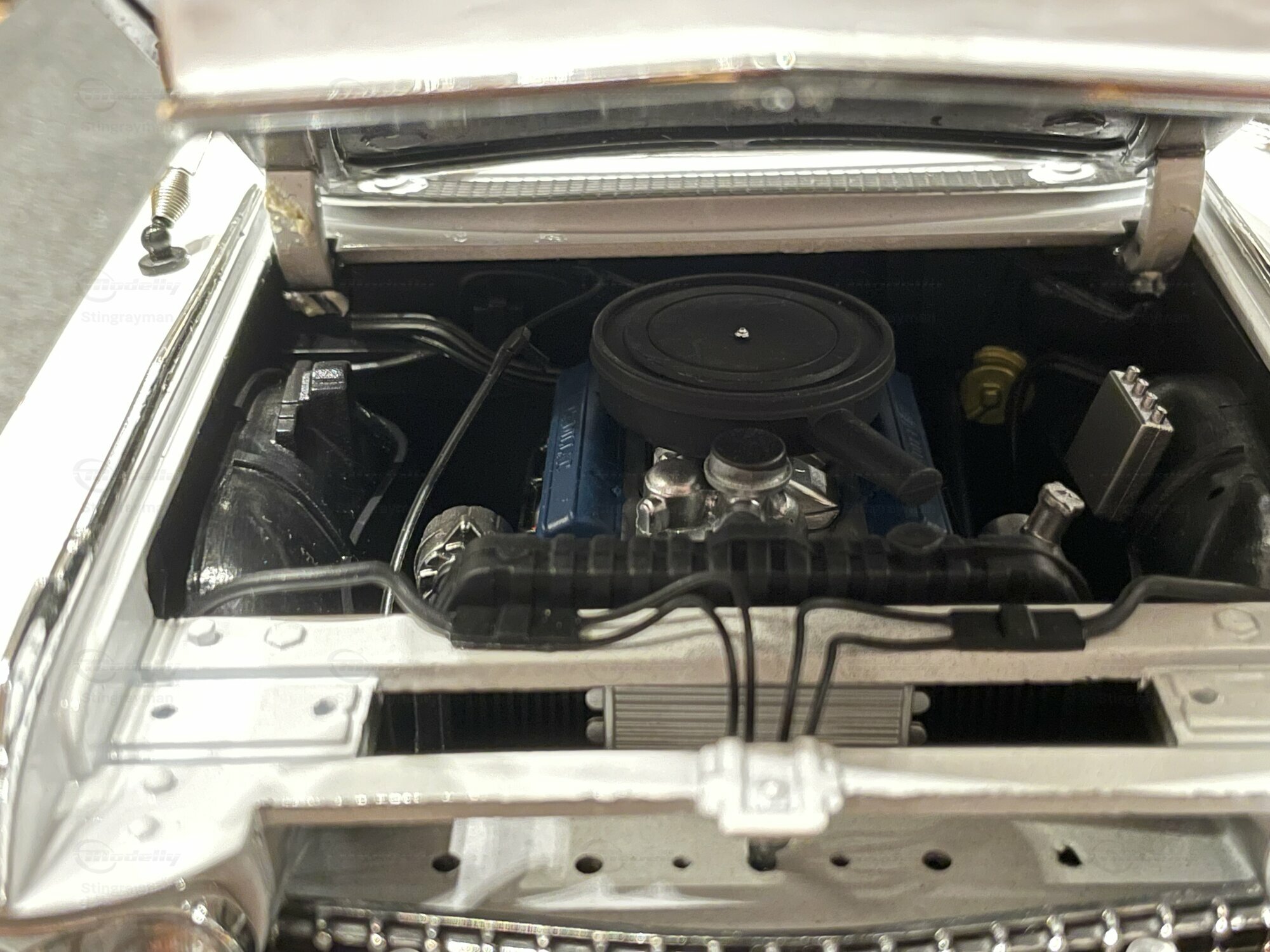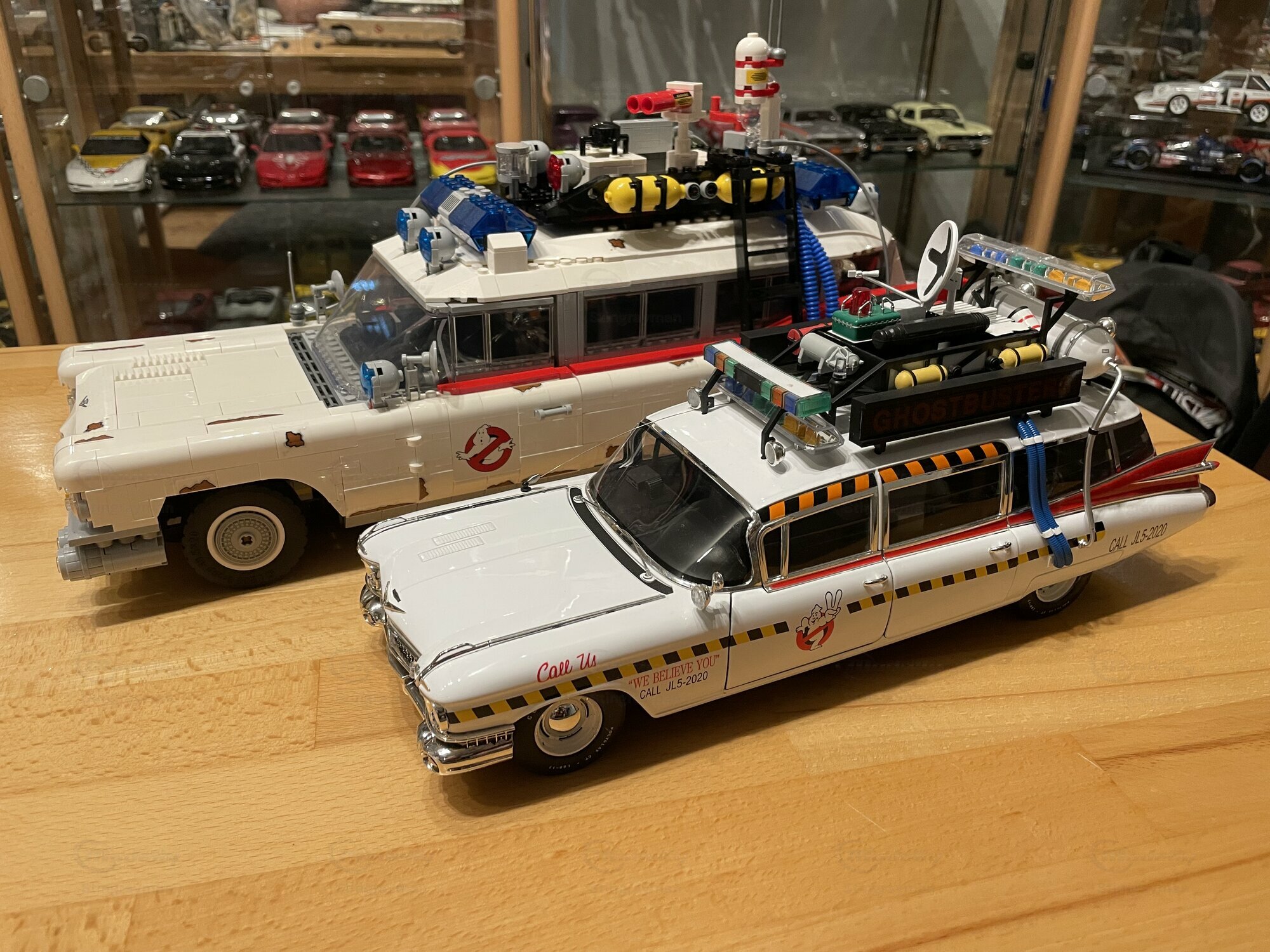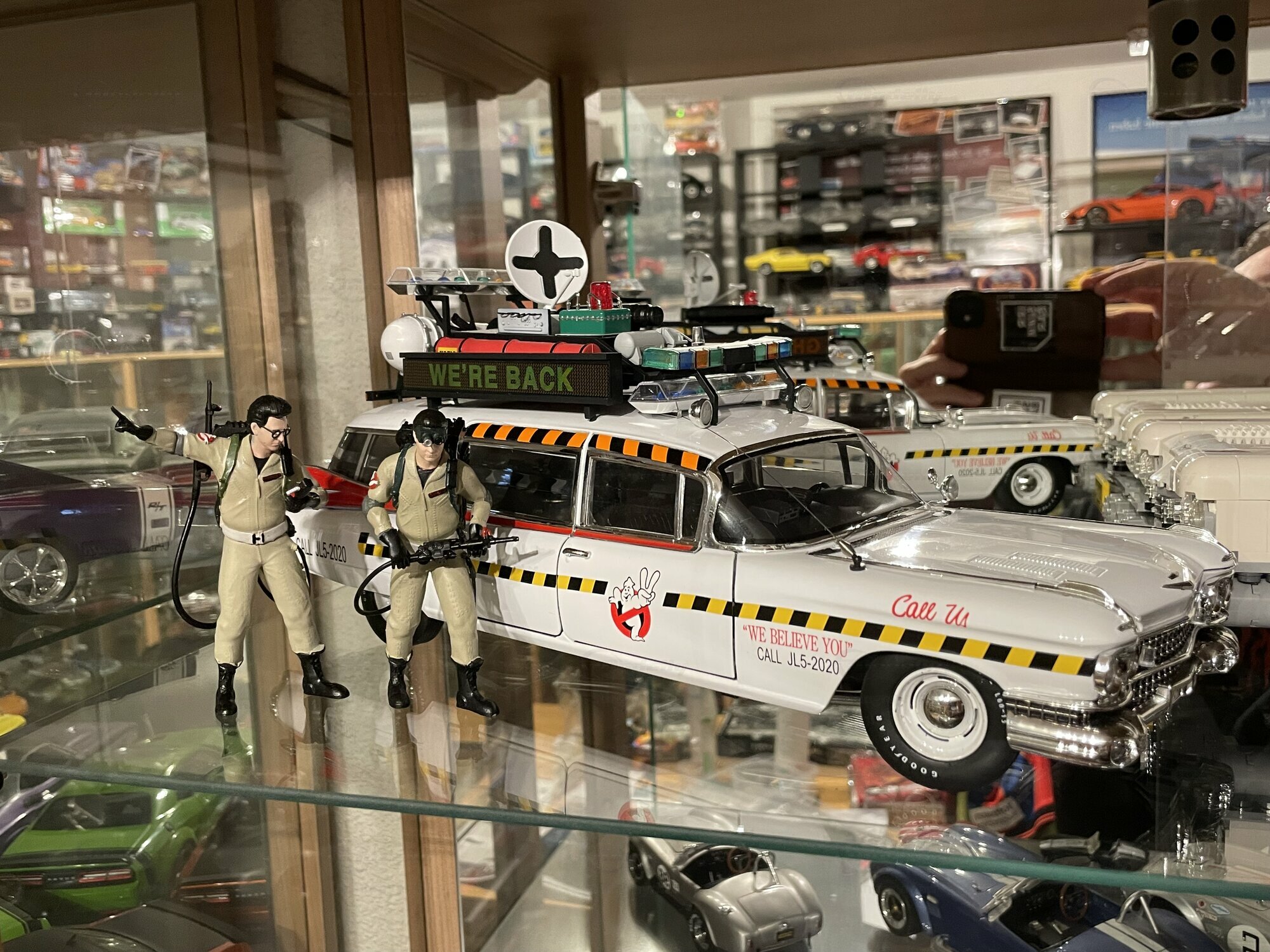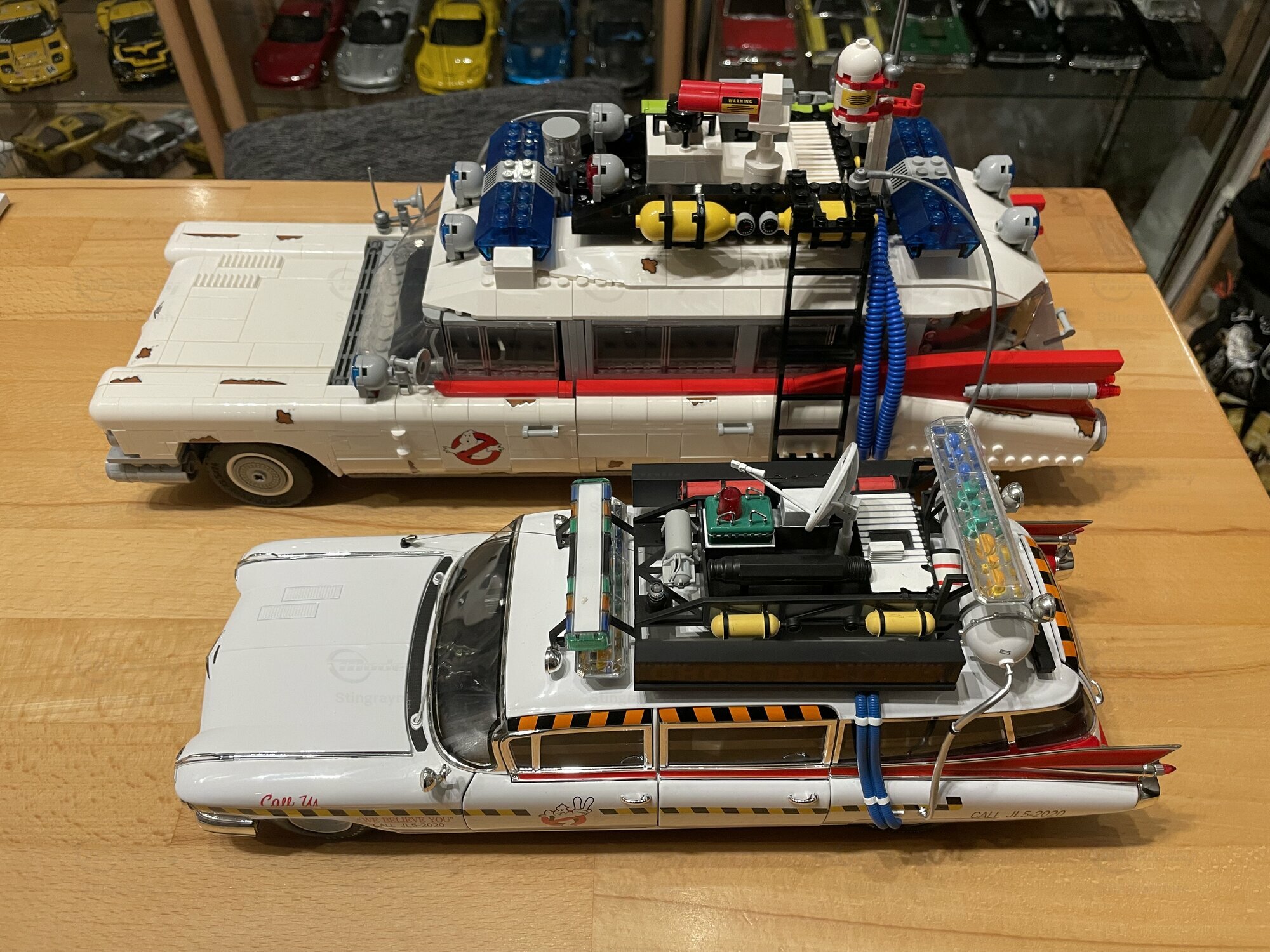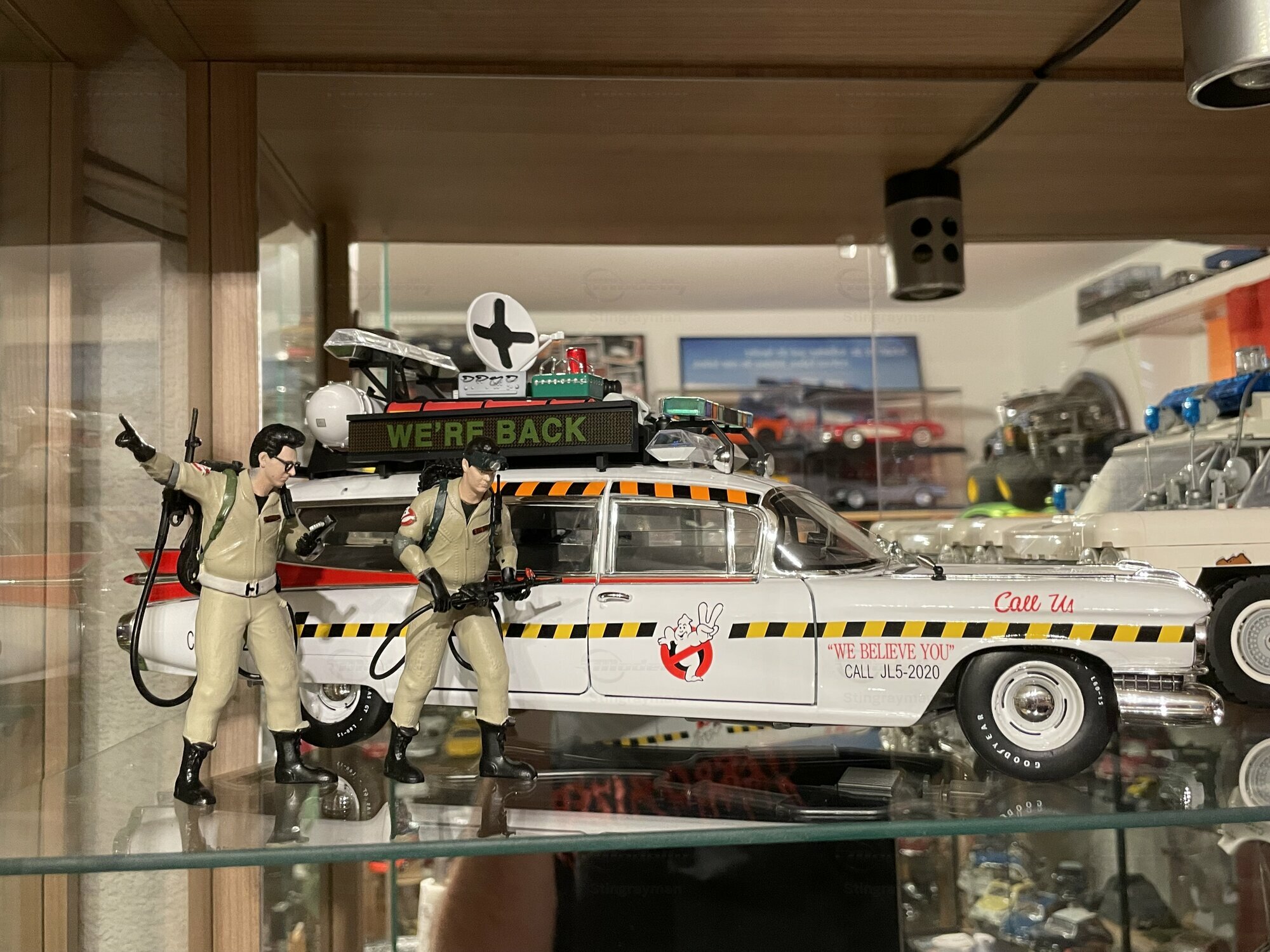 Für viele Sammler ist der ECTO-1A vor allem wegen seiner eigenständigen Beschriftung und der im Film verwendeten Zusatzausrüstung interessant. Die Miniatur von Hot Wheels Elite bildet diese Erkennungsmerkmale sichtbar nach: Die Dachkonstruktion mit radarähnlicher Scheibe, die farblich abgesetzten Kabel und Kästen sowie die transluzenten Lichtbalken erzeugen den typischen Gerätemix des ECTO-1A. Die Lackierung in Weiß mit roten Akzenten harmoniert mit der großflächigen Chromausstattung des 1959er Cadillac, wozu Front- und Heckstoßfänger, Fensterrahmen und die langen seitlichen Zierleisten zählen. Besonders prägnant sind die spitz auslaufenden vorderen Kotflügel und die langen Heckflossen, die in dieser Generation von Cadillac die Formensprache prägten. Das Modell zeigt auf der linken Seite die Figurenplatzierung der Geisterjäger besonders gut; auf den Fotos in Stingraymans Vitrine stehen passende Figuren davor, was den Maßstab realistisch unterstreicht. Während der ECTO-1A im Film als rollende Werbefläche fungierte, spiegelt das Modell diese Funktion anhand der feinen Tampondrucke und der großen Matrix-Tafel wider. Sammler sollten beim Handling die filigranen Dachteile und Antennen beachten; die Druckgusskarosserie verleiht zwar Stabilität, die Anbauten sind jedoch klein dimensioniert. In einer Sammlung mit Filmfahrzeugen lässt sich das Modell gut neben dem Vorgänger ECTO-1 oder anderen Cadillac-Umsetzungen der Jahre 1959–1960 platzieren. Wer technische Hintergründe schätzt, findet in den Dimensionen und dem V8-Antrieb der Cadillac-Basis einen Beleg dafür, warum das Filmteam genau dieses Fahrgestell auswählte: Platzangebot, Tragfähigkeit und die ikonische Form machten den ECTO-1A möglich.