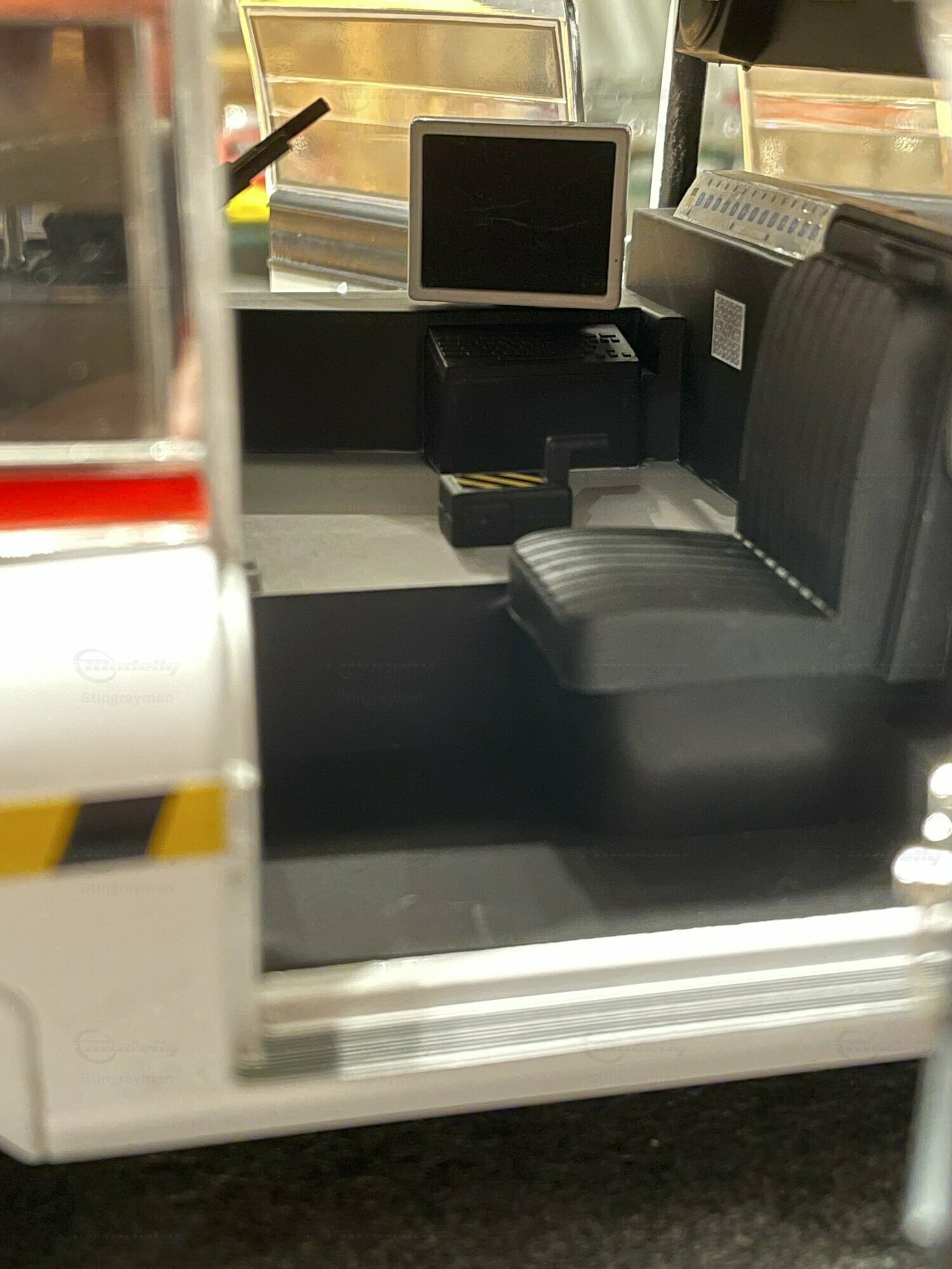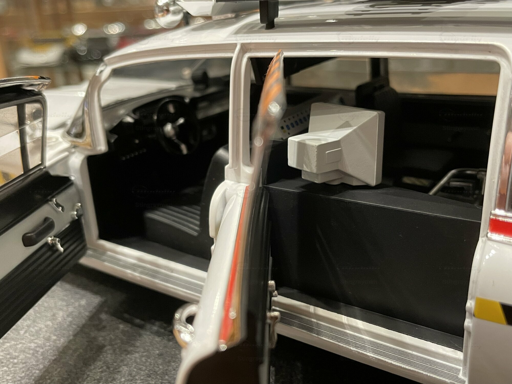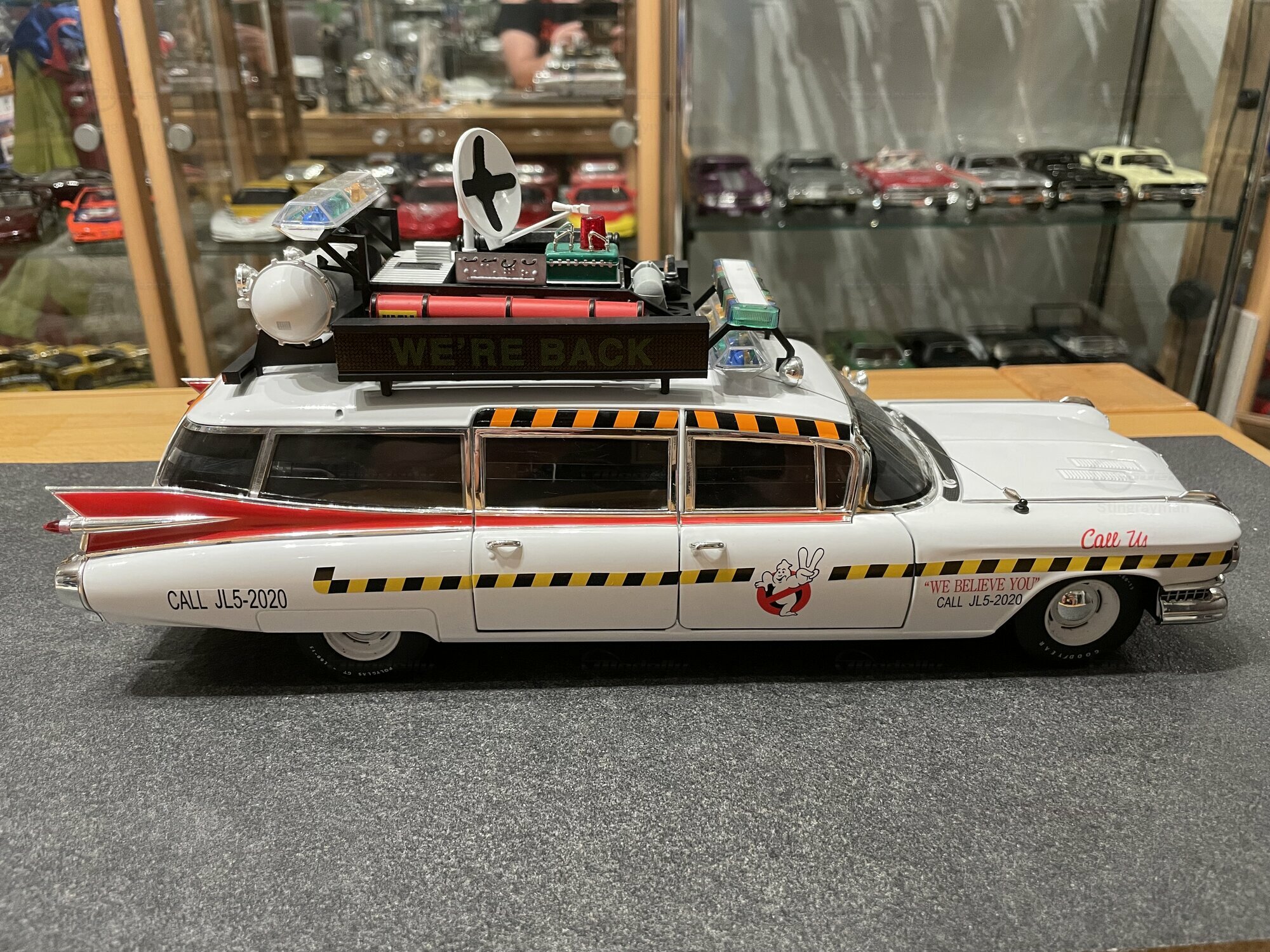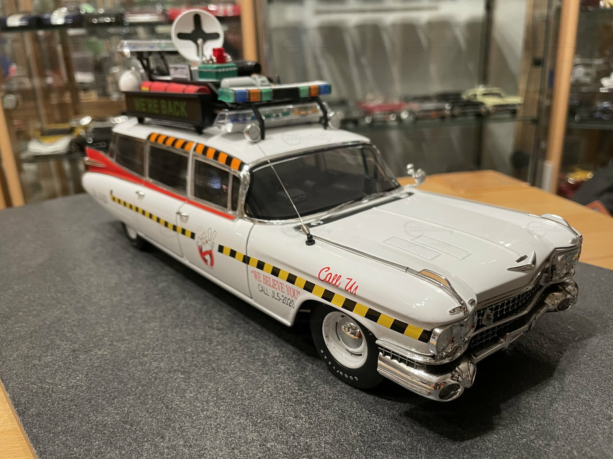 Die hier gezeigte Miniatur gehört zur Sammlung des Modelly-Mitglieds „Stingrayman“ und stellt den ECTO-1A als vielseitig detailliertes Diecast-Modell dar. Es handelt sich um ein Modellauto im Maßstab 1:18, gefertigt von Hot Wheels Elite. Die Fotos zeigen die weiße Grundlackierung mit sauber aufgedruckten gelb-schwarzen Warnstreifen und den roten Zierlinien entlang der Gürtellinie. Das „Call Us“-Schriftbild an den vorderen Türen, das „WE BELIEVE YOU“ mit der historischen Rufnummer sowie das Ghostbusters-II-Logo mit ausgestreckten zwei Fingern sind scharf umgesetzt. Auf dem Dach sitzt der typische Gerätekäfig mit farbigen Staukisten, roter Rundumleuchte, transparenter Lichtleiste, Lautsprecherhörnern und der Matrix-Anzeige „WE’RE BACK“. Seitlich findet sich die blaue Leiter, außerdem sind Schläuche und Antennen nachgebildet. Die vordere Partie zeigt den groß dimensionierten Cadillac-Chromgrill, Stoßfängerhörner, Doppelscheinwerfer und die langen Chromzierleisten der Motorhaube. Gummibereifung mit „Goodyear“-Beschriftung und korrekt proportionierte Radkappen runden den Eindruck ab. Der Innenraum ist dunkel gehalten; Lenkrad, Sitzbänke, Armaturentafel und die hinteren Ausbauten sind über die Fenster einsehbar. Mehrere Öffnungsteile, fein eingesetzte Scheibenwischer und separate Türgriffe sind gut erkennbar. Diese Miniatur ist als Druckguss gefertigt, also auf die klassische „diecast“-Bauweise ausgelegt, wodurch Karosseriekanten und Chromteile massiv und stabil wirken. Zur Einordnung für Sammler nochmals der klare Hinweis: Es handelt sich um ein Modellauto im Maßstab 1:18, hergestellt von Hot Wheels Elite.