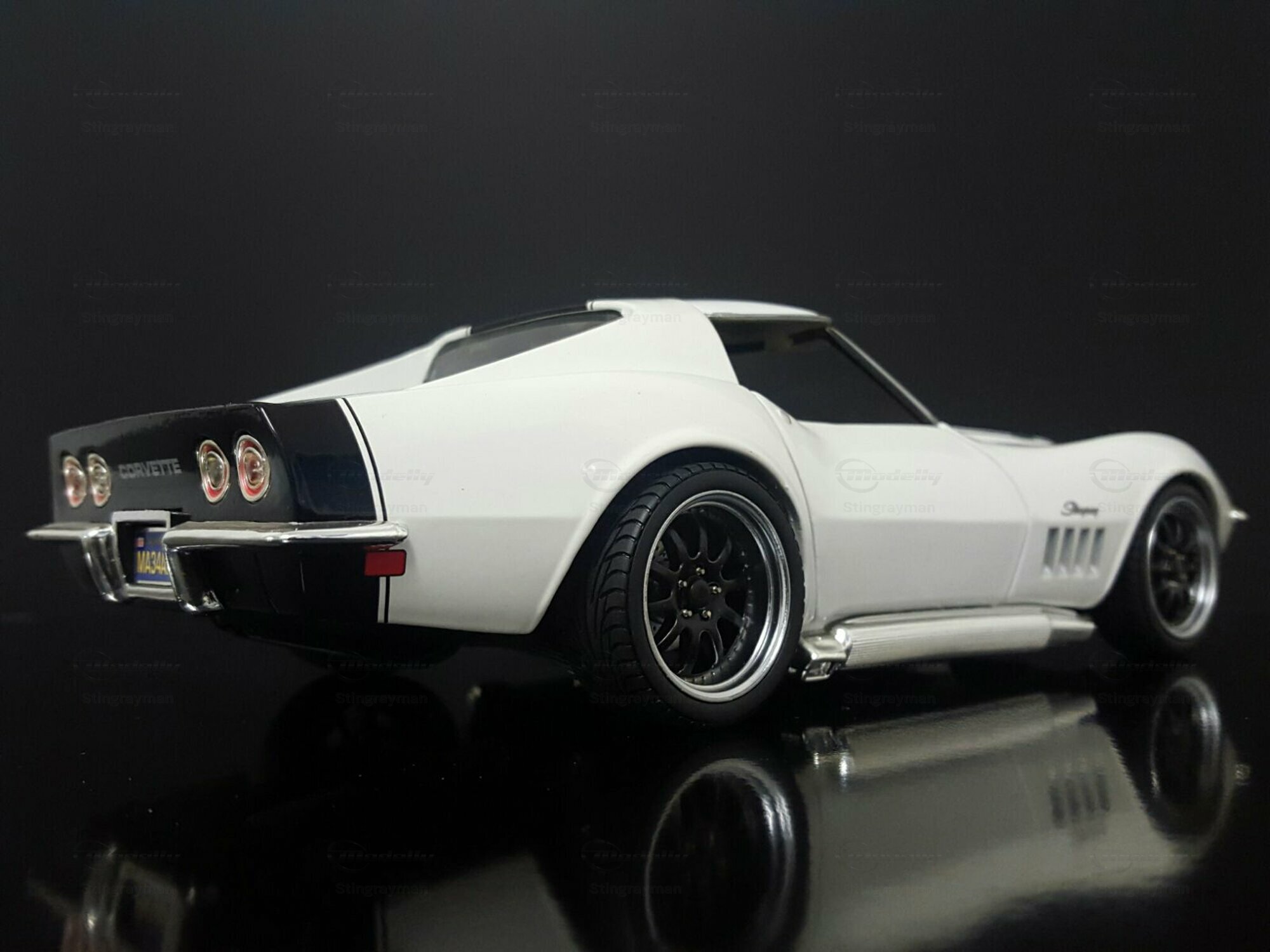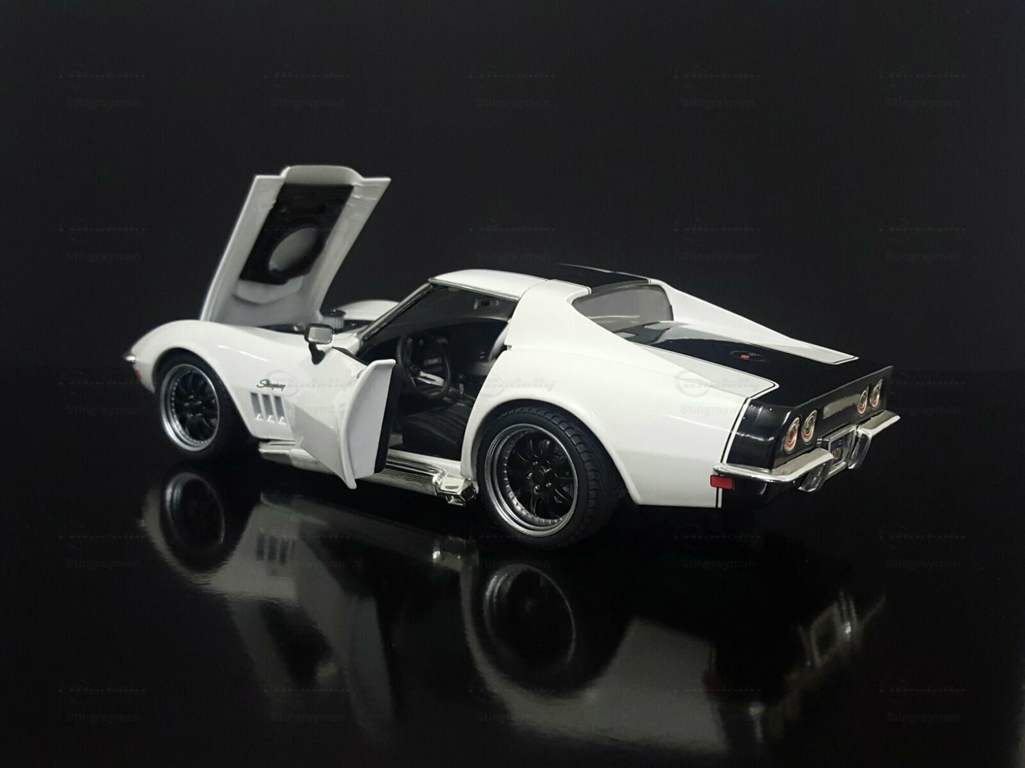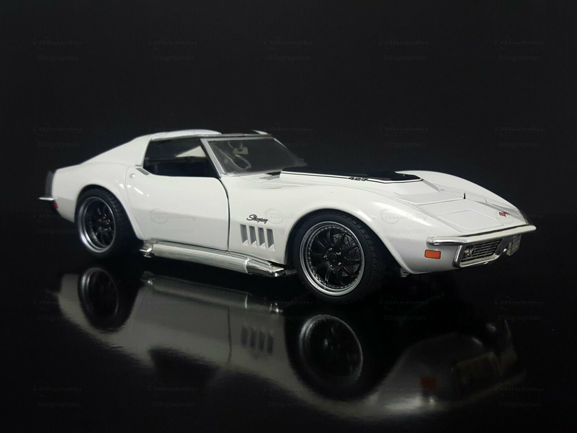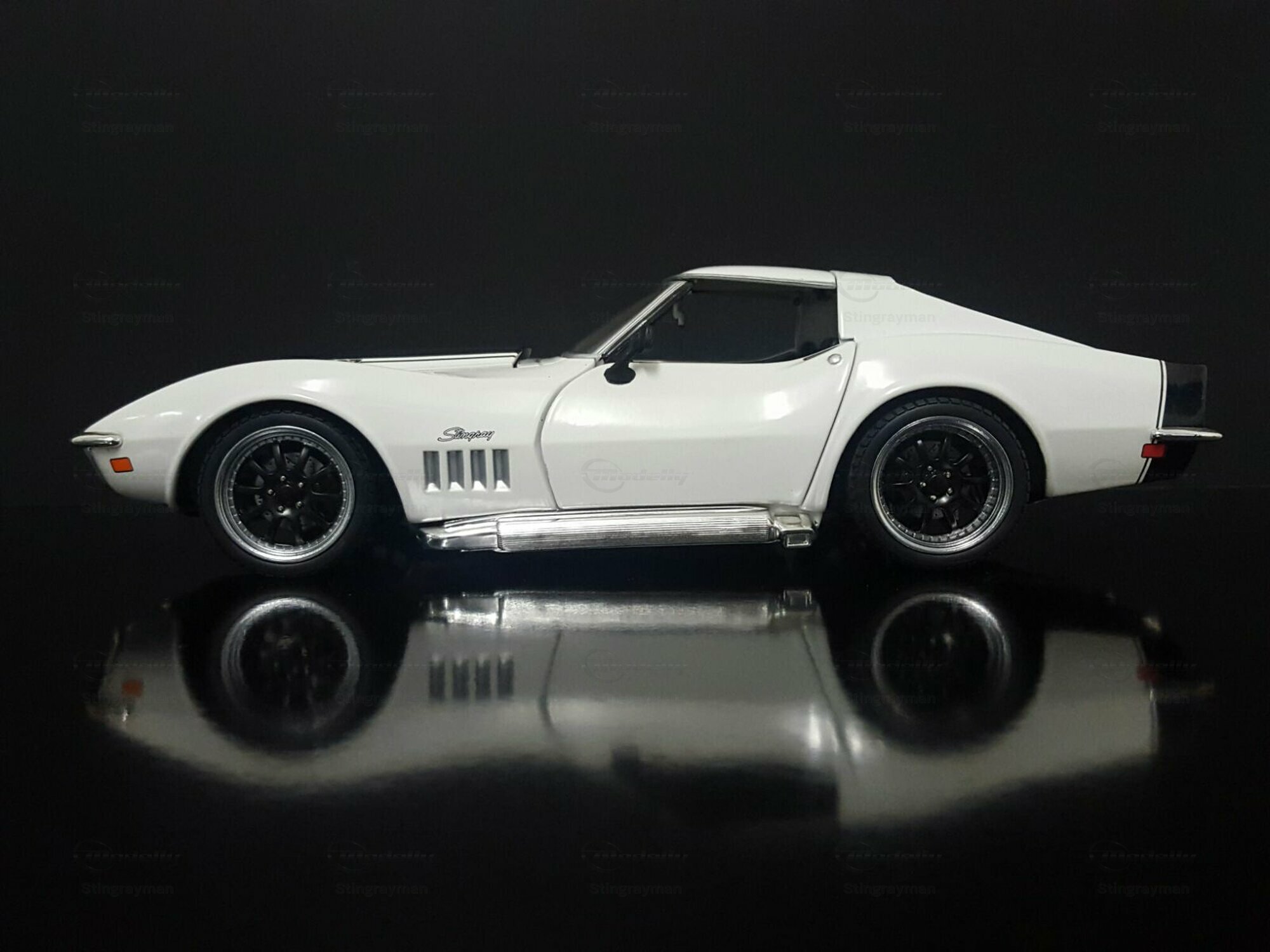 Wichtiger Hinweis für Sammler: Das hier gezeigte Exponat ist ein modifiziertes Einzelstück und stellt nicht das serienmäßige Produkt von Hot Wheels dar. Die Basis ist ein Modellauto im Maßstab 1:18, gefertigt aus Diecast-Metall. Es befindet sich in der Sammlung des Modelly-Mitglieds „Stingrayman“. Bereits auf den Fotos fällt die weiß lackierte Karosserie mit dezent schwarzer Motorhaubenapplikation und schwarzem Heckabschluss ins Auge. Seitliche Sidepipes sind silbern abgesetzt und folgen dem unteren Schwellerverlauf. Die Räder wurden individuell gegen schwarze, mehrteilige Mehrspeichenfelgen mit polierter Außenkante getauscht; ein klar erkennbarer Felgenhersteller ist anhand der Bilder nicht bestimmbar, die Dimensionen wirken gegenüber der Serienausstattung vergrößert. Das ergibt eine straffere Optik mit geringerer Bodenfreiheit. Der Schriftzug „Stingray“ sitzt korrekt hinter den vorderen Radläufen, ebenso die dreifachen Kiemenöffnungen. Vorn trägt das Modell die schmalen Stoßfängerhörner, hinten sind die vier runden Rückleuchten sowie die angedeutete Stoßstange sichtbar. Die Innenausstattung wirkt komplett schwarz, mit T‑Top‑Trenner und klassischem Zweispeichenlenkrad. Auch die Scheinwerferklappen sind geschlossen dargestellt. Das Modellauto von Hot Wheels im Maßstab 1:18 zeigt dadurch eine stimmige, klare Interpretation des Vorbilds, die Modifikationen – besonders Räder und Heckgestaltung – verändern jedoch den Gesamteindruck gegenüber dem ursprünglichen Serienmodell. Das Material Diecast sorgt für spürbare Stabilität und präzise Gravuren an Haube, Türen und Klappen.