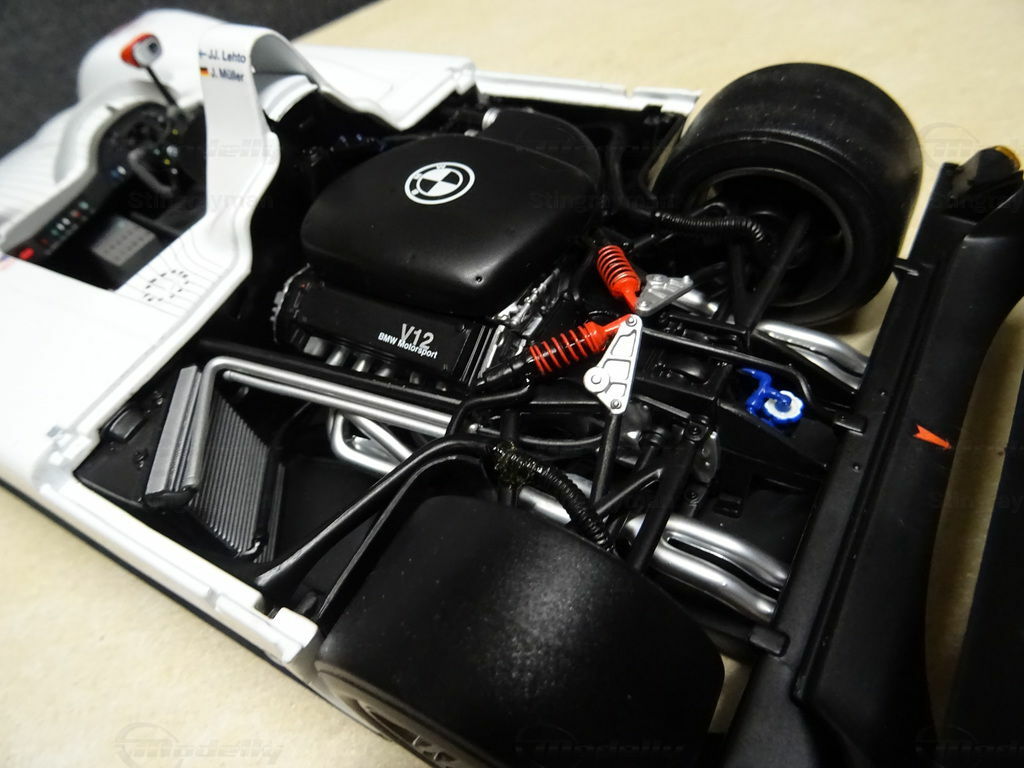 Das Design des BMW V12 LMR ist sowohl funktional als auch ästhetisch. Die Lackierung in weiß mit schwarzen Akzenten und die Logos der Sponsoren wie Michelin und Original BMW Teile sorgen für einen authentischen Look. Die Startnummer 42 und die Nationalflaggen auf dem Fahrzeug verleihen der Miniatur einen hohen Wiedererkennungswert. Die technischen Merkmale des Originals, wie der leistungsstarke V12-Motor und das fortschrittliche Fahrwerk, wurden in der Modellversion detailgetreu beschrieben, auch wenn sie nicht funktional sind. Damit wird dem Sammler ein umfassendes und realistisches Bild des originalen Rennwagens geboten.