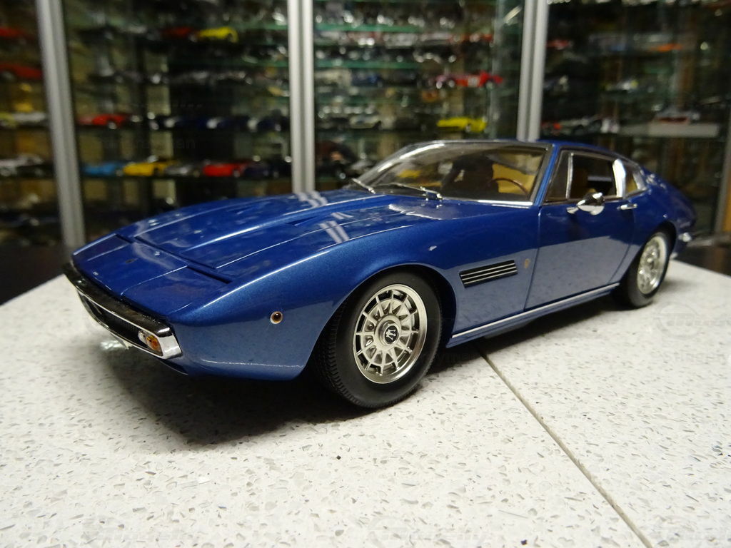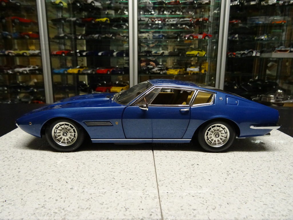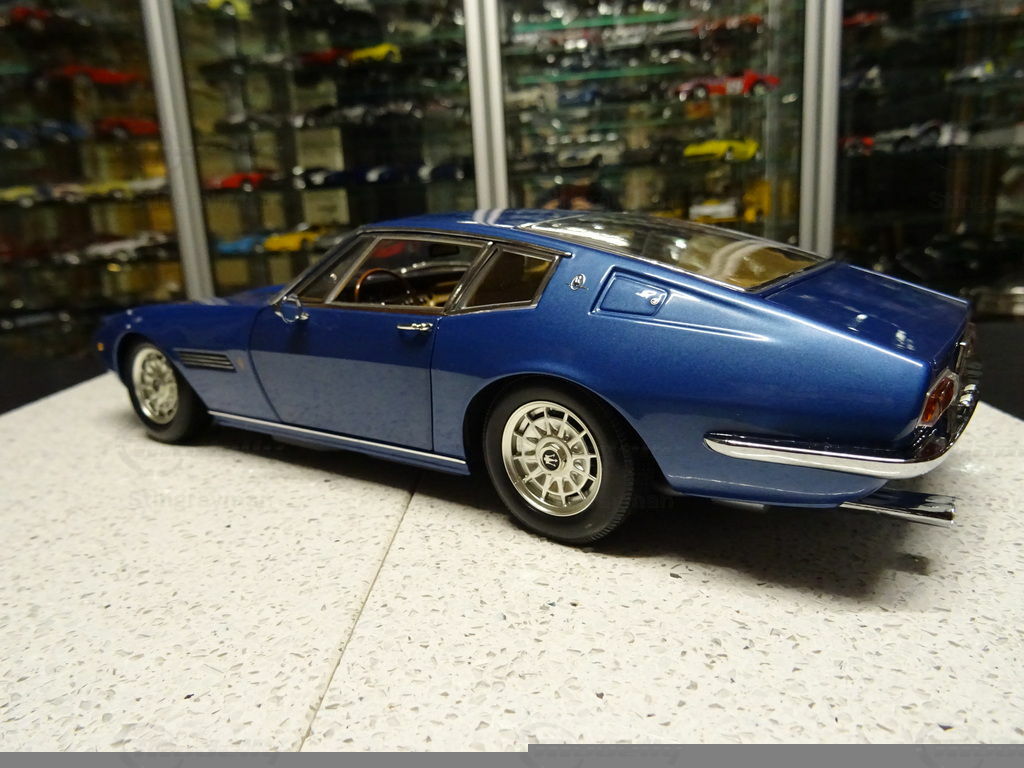 Das hier gezeigte Modellauto im Maßstab 1:18 von Minichamps repräsentiert den Maserati Ghibli Coupé eindrucksvoll. Dieses Modell ist aus dem Material Diecast gefertigt und überzeugt durch eine hohe Detailtreue. Das Sammlermodell aus der Sammlung von Modelly Mitglied "Stingrayman" zeigt den Ghibli in einem tiefen, glänzenden Blau, das die Eleganz und den klassischen Stil des Originals widerspiegelt. Die klare Linienführung, die markanten Lüftungsschlitze an den Seiten und die Maserati-Badges sind exakt nachgebildet. Die Türgriffe und die Radkappen sind verchromt, was der Miniatur zusätzlichen Glanz verleiht.
