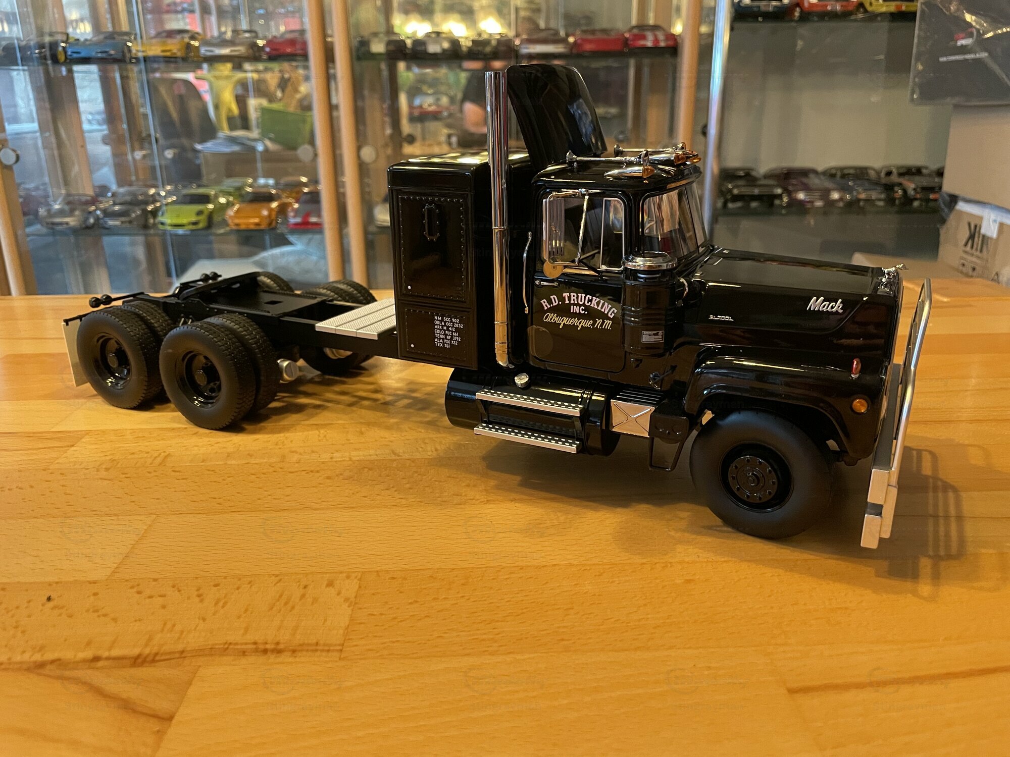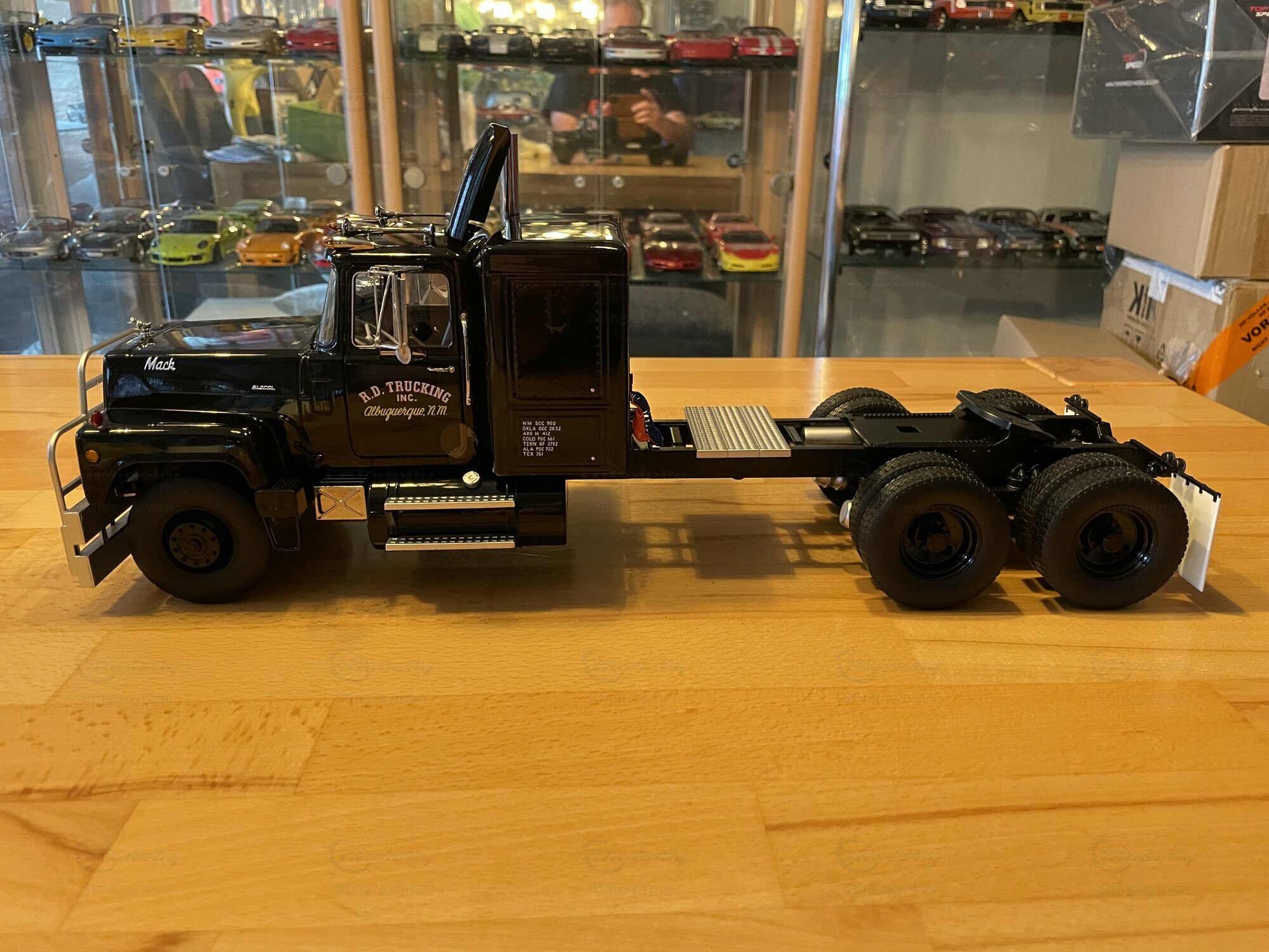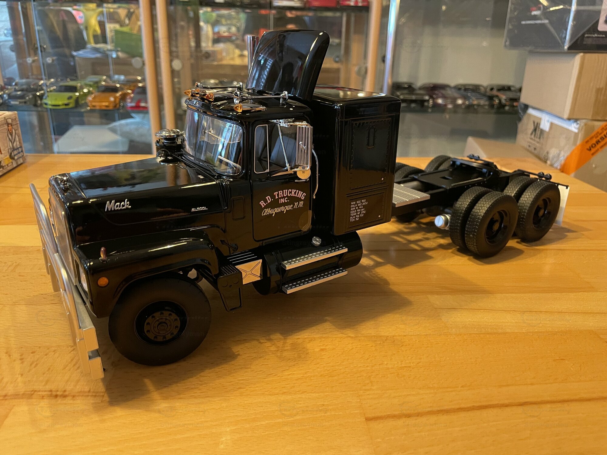Der MACK RL 700L verfügt über einen leistungsstarken Motor, der mit einer 350 PS starken Einheit ausgestattet ist, und bietet damit eine beeindruckende Zugkraft für Langstreckenfahrten. Das Fahrzeug besitzt eine klassische Cab-Over-Engine-Konfiguration, was ihm eine kompakte Silhouette und maximale Ladefläche bei minimaler Gesamtfahrzeuglänge verleiht. Die technischen Merkmale umfassen auch eine hochbelastbare Radaufhängung und eine dreiachsige Konfiguration für zusätzliche Stabilität. Die Lackierung in dem schwarzen, glänzenden Farbton unterstreicht das mächtige Erscheinungsbild dieses Trucks und erinnert an die filmische Darstellung des "Rubber Duck".
