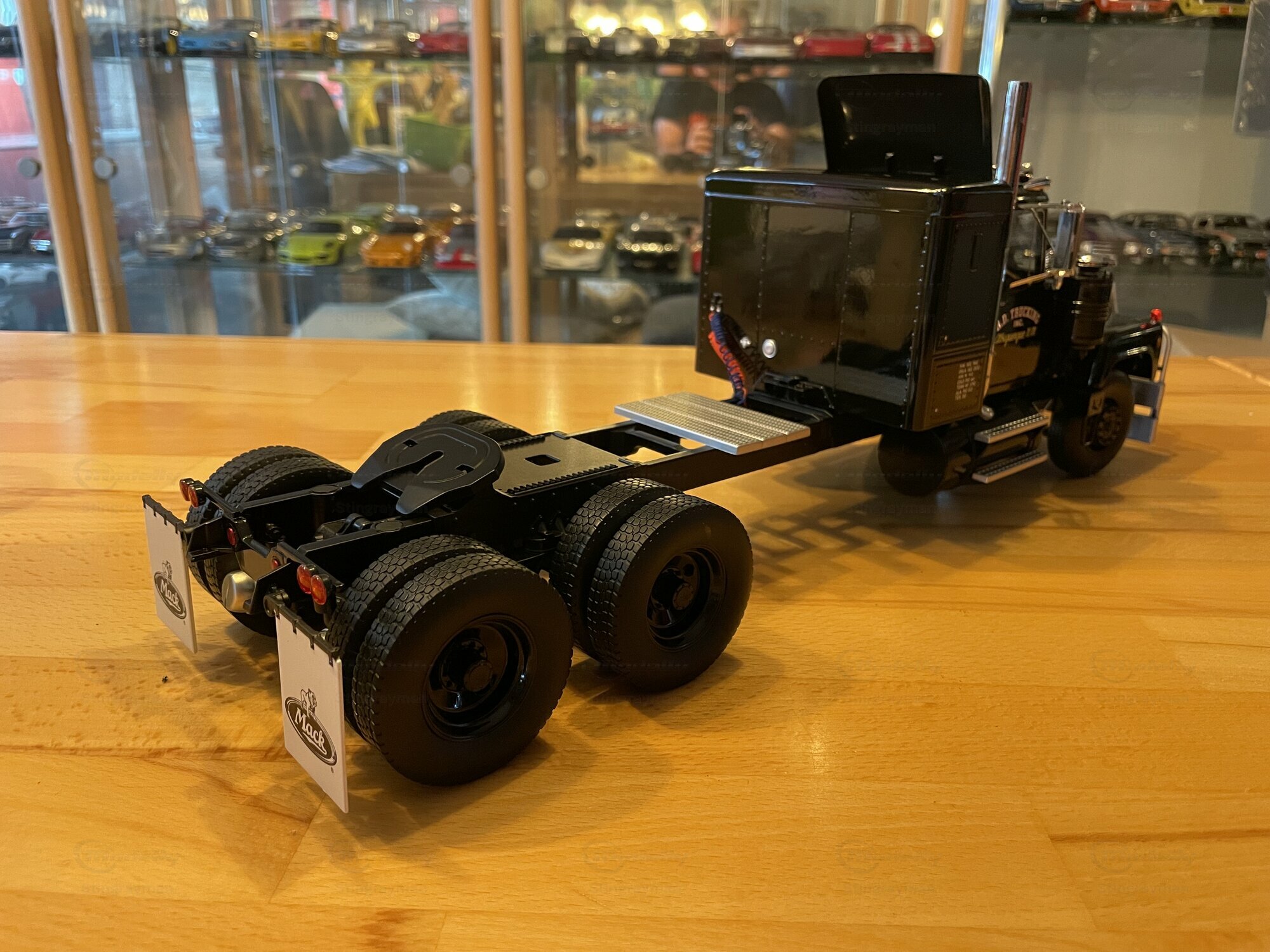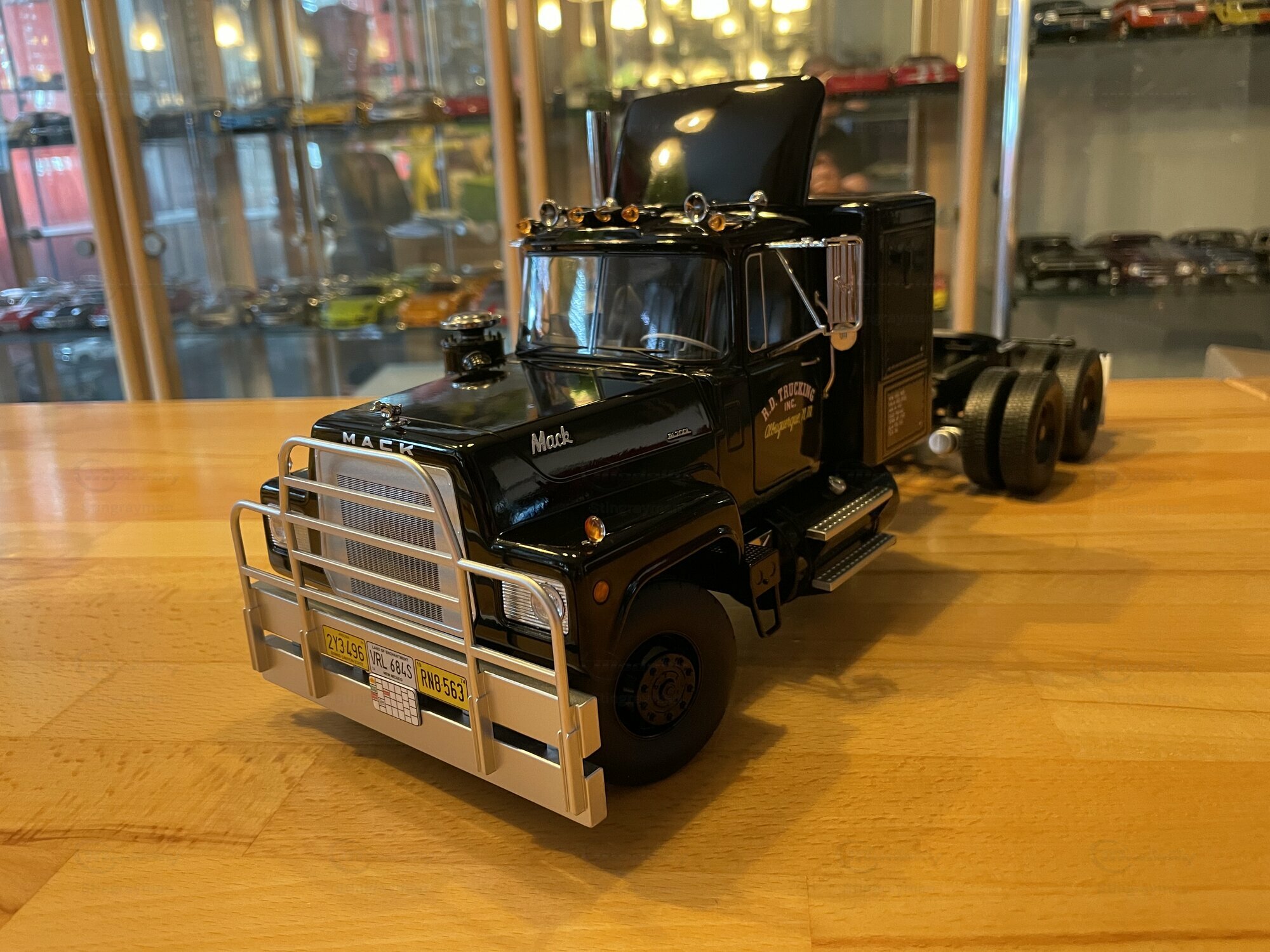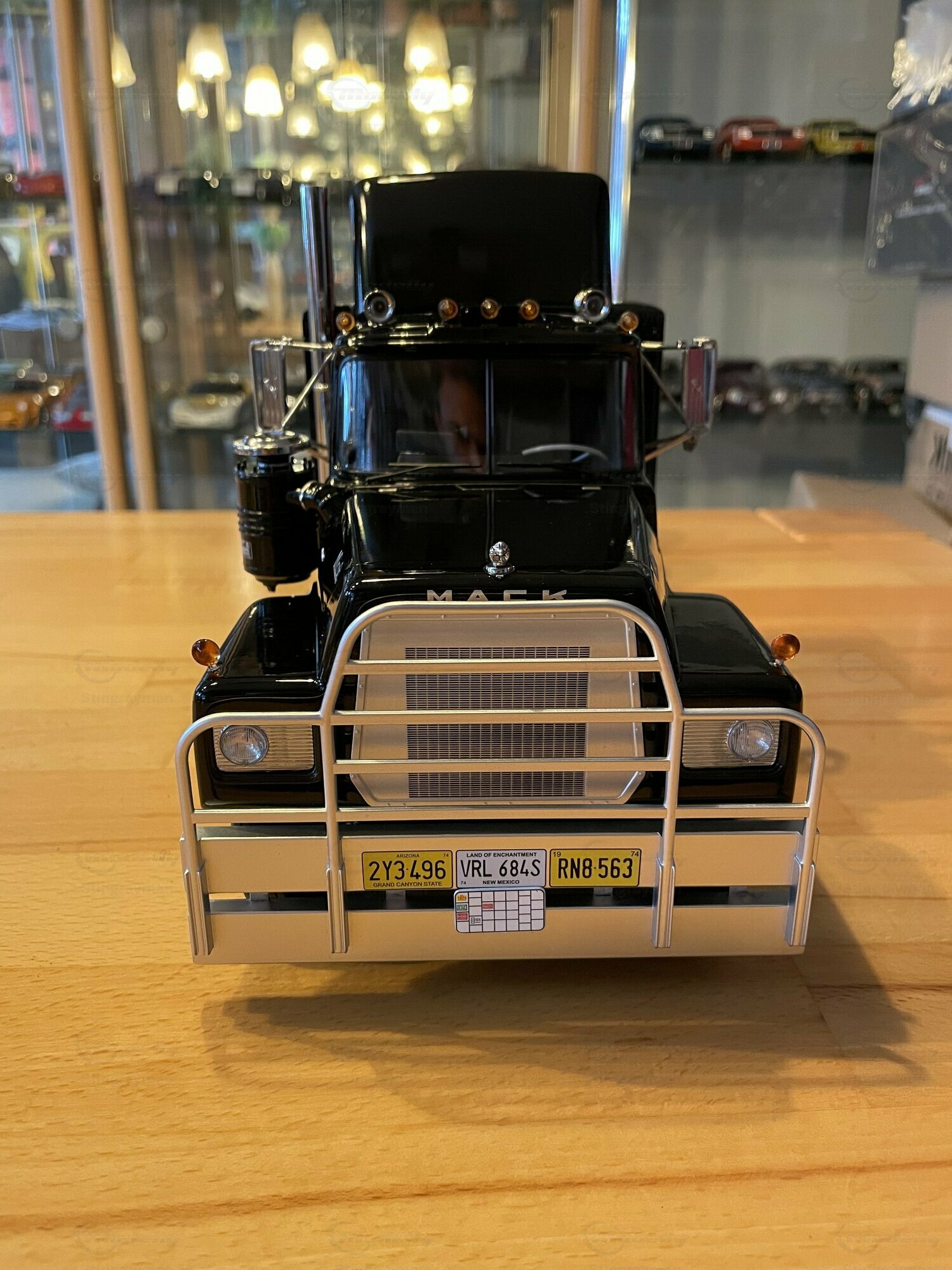 Der MACK RL 700L verfügt über einen leistungsstarken Motor, der mit einer 350 PS starken Einheit ausgestattet ist, und bietet damit eine beeindruckende Zugkraft für Langstreckenfahrten. Das Fahrzeug besitzt eine klassische Cab-Over-Engine-Konfiguration, was ihm eine kompakte Silhouette und maximale Ladefläche bei minimaler Gesamtfahrzeuglänge verleiht. Die technischen Merkmale umfassen auch eine hochbelastbare Radaufhängung und eine dreiachsige Konfiguration für zusätzliche Stabilität. Die Lackierung in dem schwarzen, glänzenden Farbton unterstreicht das mächtige Erscheinungsbild dieses Trucks und erinnert an die filmische Darstellung des "Rubber Duck".