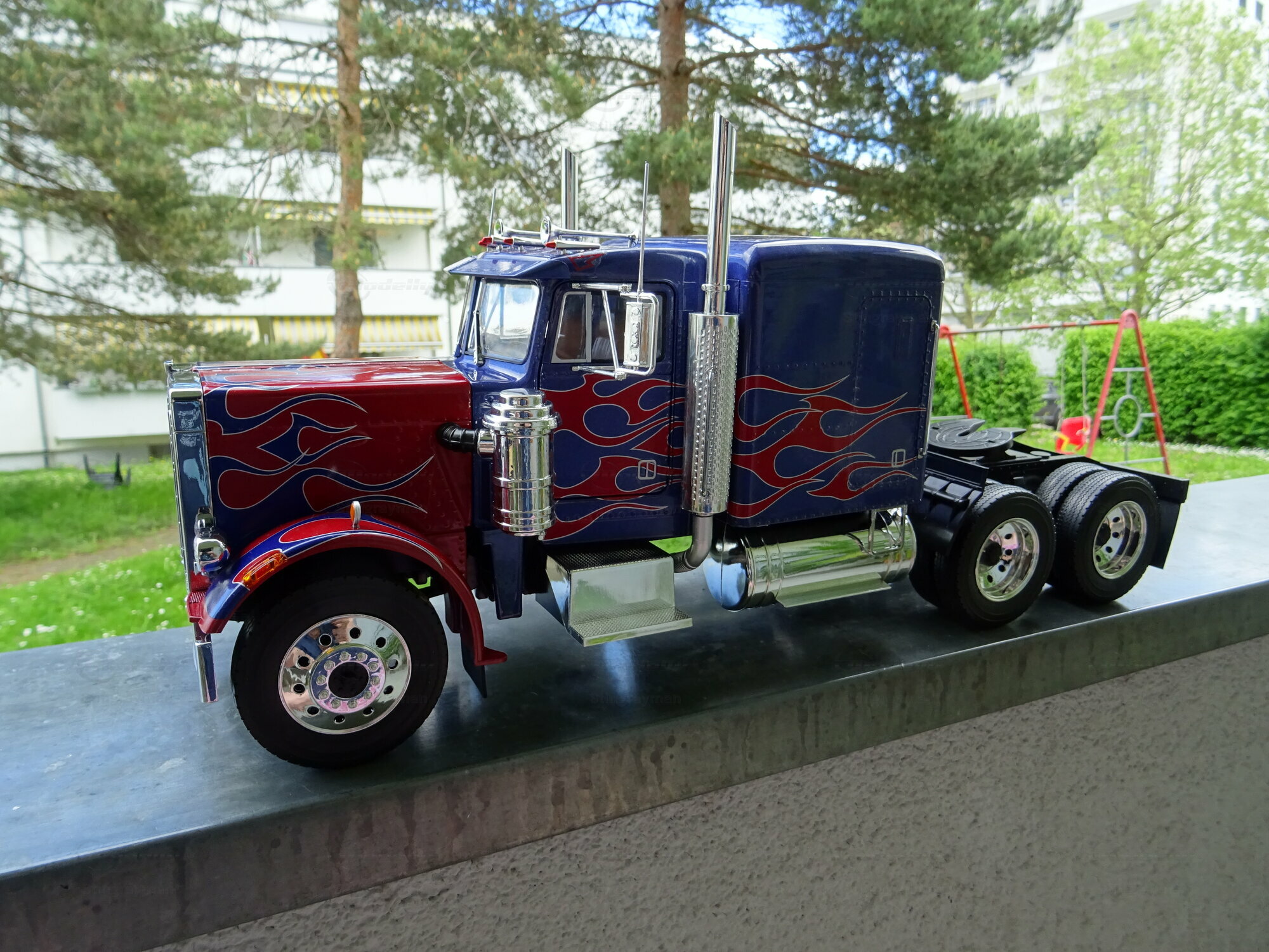 Die Farbgebung dieser 1:18 Miniatur von Road Kings fällt sofort ins Auge. Das Modell ist in einem tiefen Blauton lackiert, ergänzt durch leuchtend rote Flammengrafiken, die dem Fahrzeug eine dynamische Erscheinung verleihen. Das Wechselspiel von Blau und Rot wird durch Chromteile wie die Auspuffrohre, Spiegel und den charakteristischen Kühlergrill vervollständigt. Die Radkappen und Felgen glänzen ebenfalls in Chrom, was den luxuriösen und kraftvollen Auftritt des Trucks unterstreicht. Die kantigen Formen des Führerhauses und der Motorhaube bleiben dem Original treu, und die fein gearbeiteten Scheinwerfer runden das detailgetreue Erscheinungsbild ab. Diese Merkmale machen die Miniatur besonders ansprechend und geben einen authentischen Eindruck vom Original.