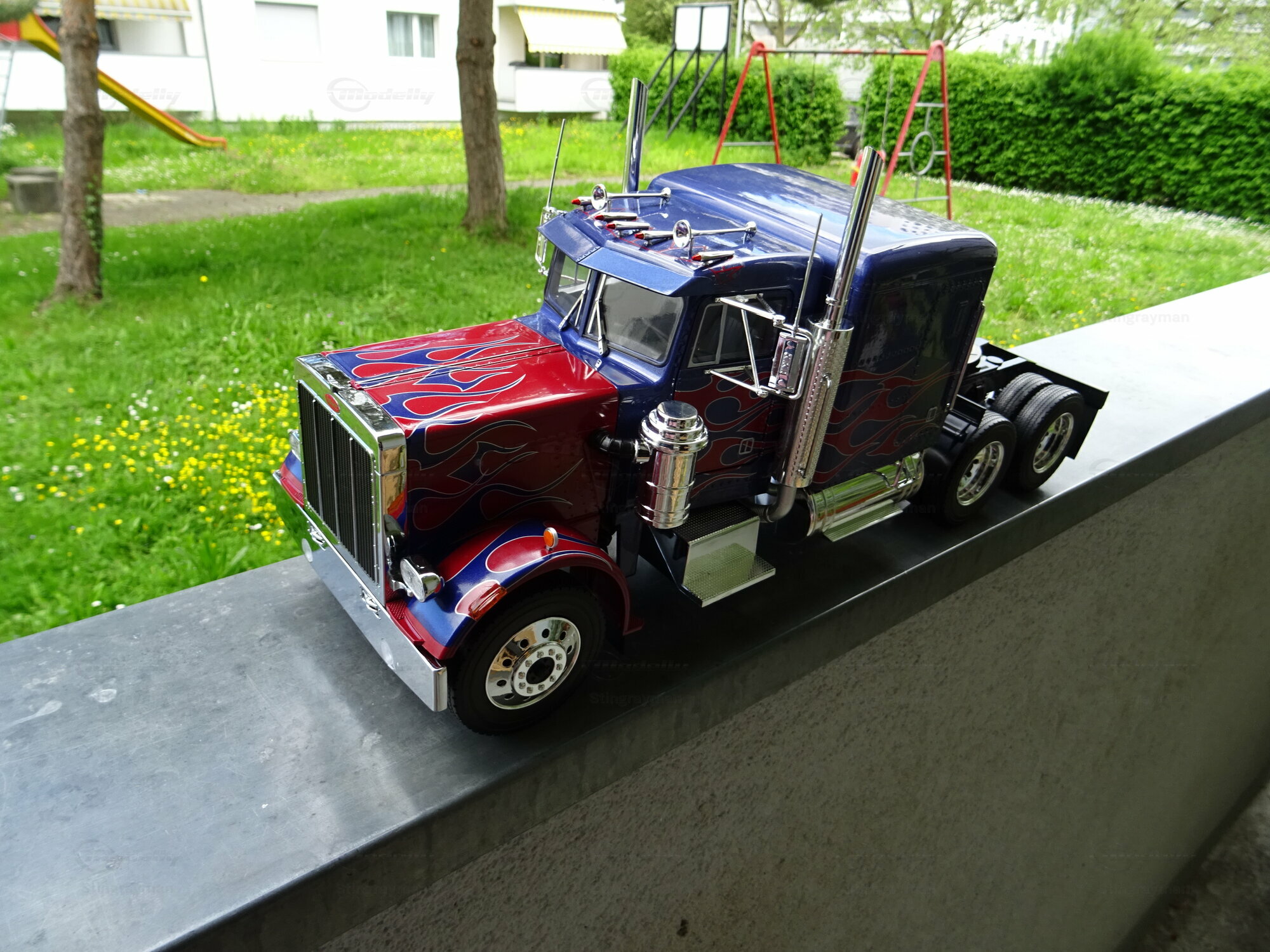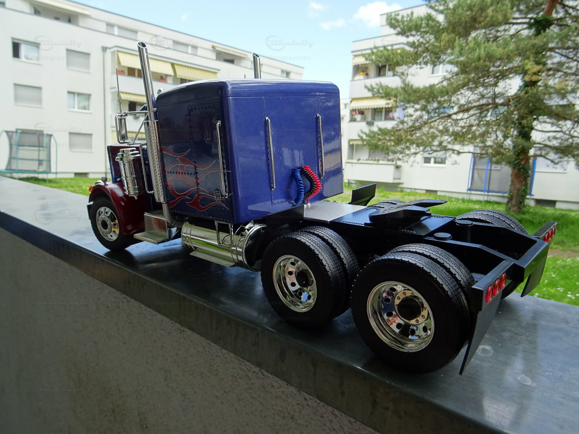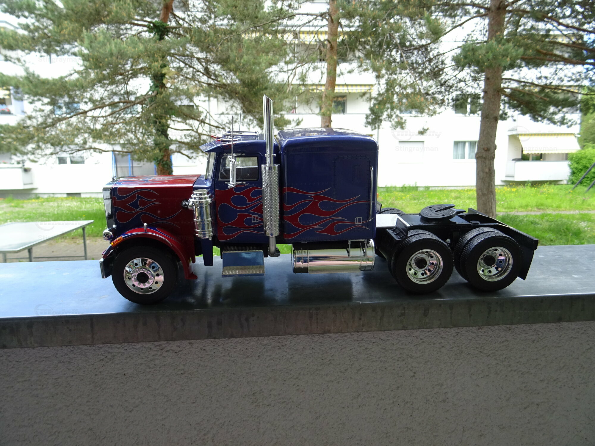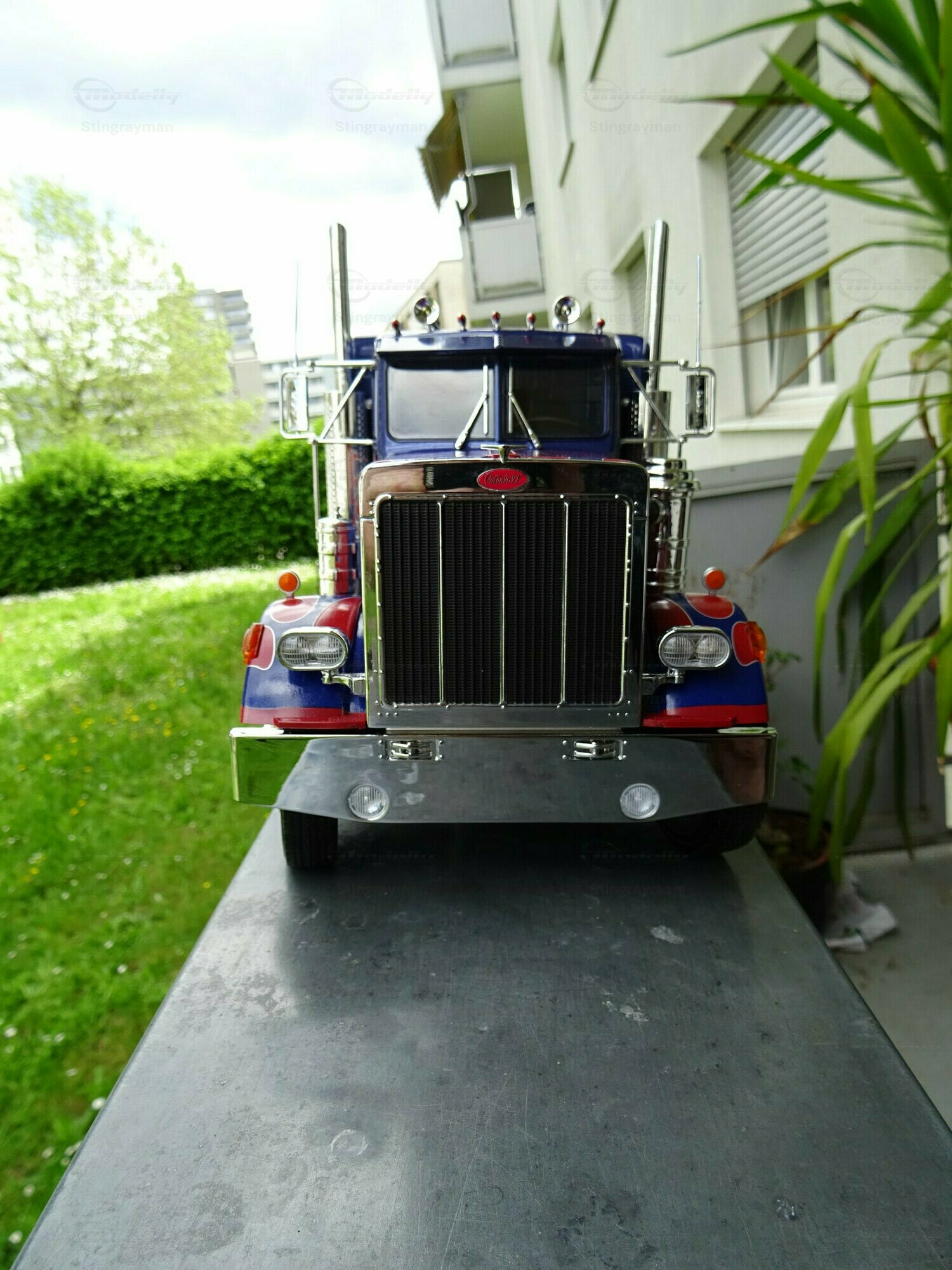 Die Miniatur des Peterbilt 359, die hier im Maßstab 1:18 von Road Kings dargestellt wird, ist ein exquisites Beispiel für die Liebe zum Detail und die Handwerkskunst, die in die Modellherstellung einfließt. Gefertigt aus Diecast-Material, überzeugt das Modell durch seine Stabilität und präzise Fertigung. Mit einer Länge von etwa 30 Zentimetern und einer detailgenauen Nachbildung des Originals eignet sich diese Miniatur sowohl für Sammler als auch für Liebhaber von Nutzfahrzeugen. Auf den Fotos, die vom Modelly-Mitglied "Stingrayman" zur Verfügung gestellt wurden, ist die Sorgfalt deutlich zu erkennen, mit der die Markierungen und Embleme platziert wurden. Klar sichtbar sind die typischen Peterbilt Abzeichen an der Front und den Seiten, die für Authentizität sorgen.