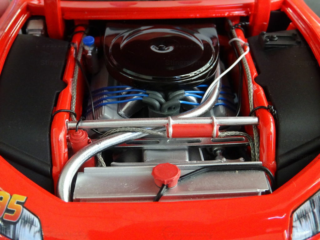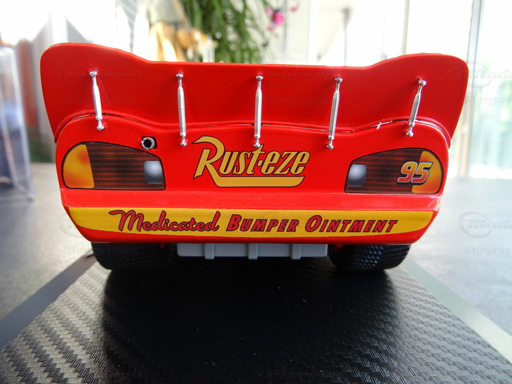 Lightning McQueen ist technisch ein NASCAR-Rennwagen aus der Zeit um das Jahr 2006. Seine technischen Merkmale umfassen einen hochleistungsfähigen V8-Motor und ein Chassis, das für Geschwindigkeit und Präzision bei hohen Geschwindigkeiten ausgelegt ist. Ein bemerkenswertes Detail ist sein leichter Aluminiumrahmen, der seine Rennleistung maximiert. Der Wagen besitzt aerodynamische Formen und eine markante Lackierung, die sowohl Schnelligkeit als auch Stil symbolisiert. Bemerkenswert sind auch die stilisierten Sponsors-Aufkleber auf Lightning McQueen, darunter berühmte Marken wie Rust-eze und Dinoco, die dem Fahrzeug einen zusätzlichen Charme verleihen.