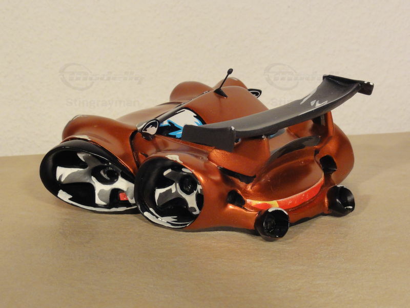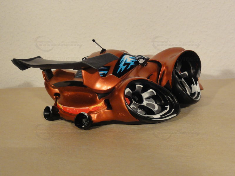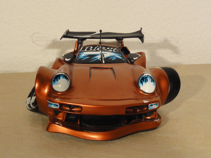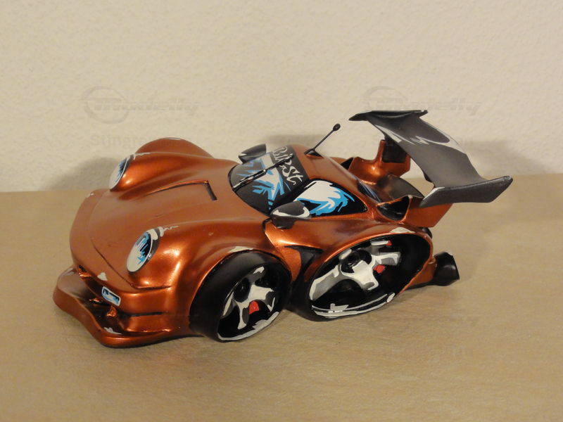 Auffällig an dem von Speed Freaks hergestellten Modell im 1:24 Maßstab ist die besondere Lackierung. Das Modell zeigt eine markante Bronze-Farbe mit kontrastierenden Farbakzenten an den Scheiben und Lufteinlässen, was dem Auto einen dynamischen und modernen Look verleiht. Das rote und weiße Muster auf den Reifen fügt dem gesamten Erscheinungsbild eine künstlerische Note hinzu. Zudem ist das Modell umfangreich detailliert, von den aerodynamischen Formen bis hin zum hochwertigen Spoiler, was es zu einem besonderen Sammlerstück macht. Sowohl die großen Rückspiegel als auch die peppigen Farbakzente überzeugen.
