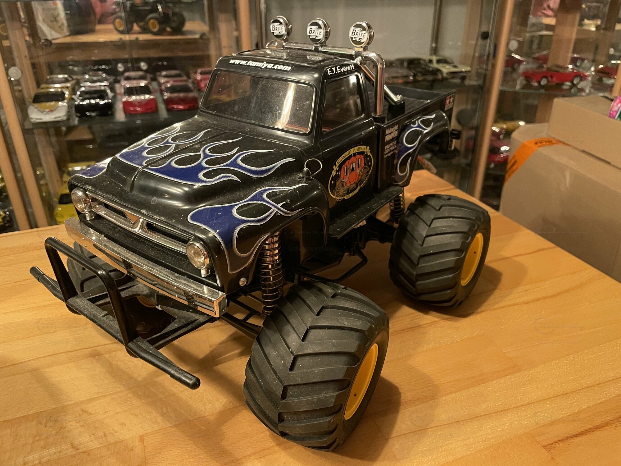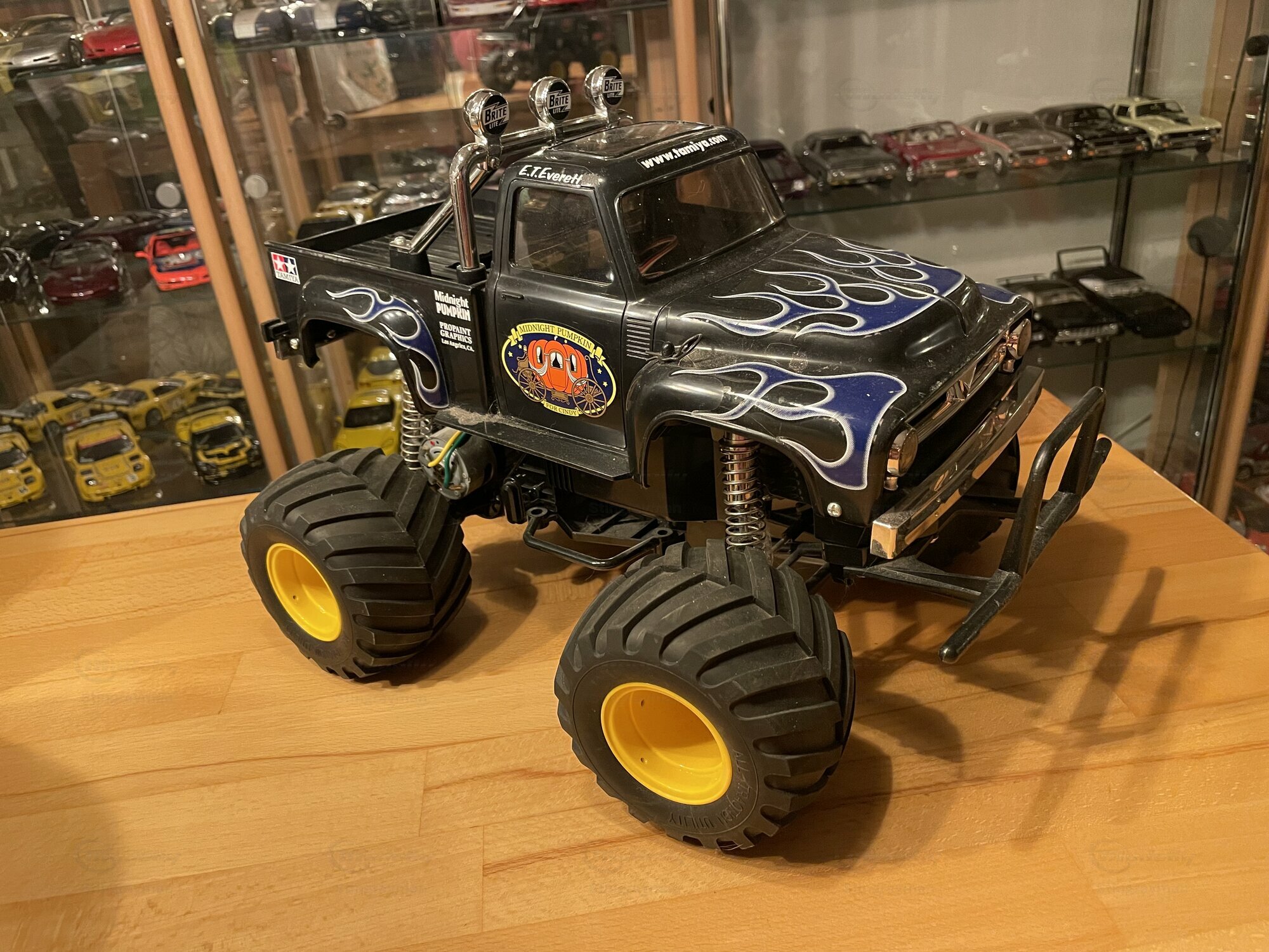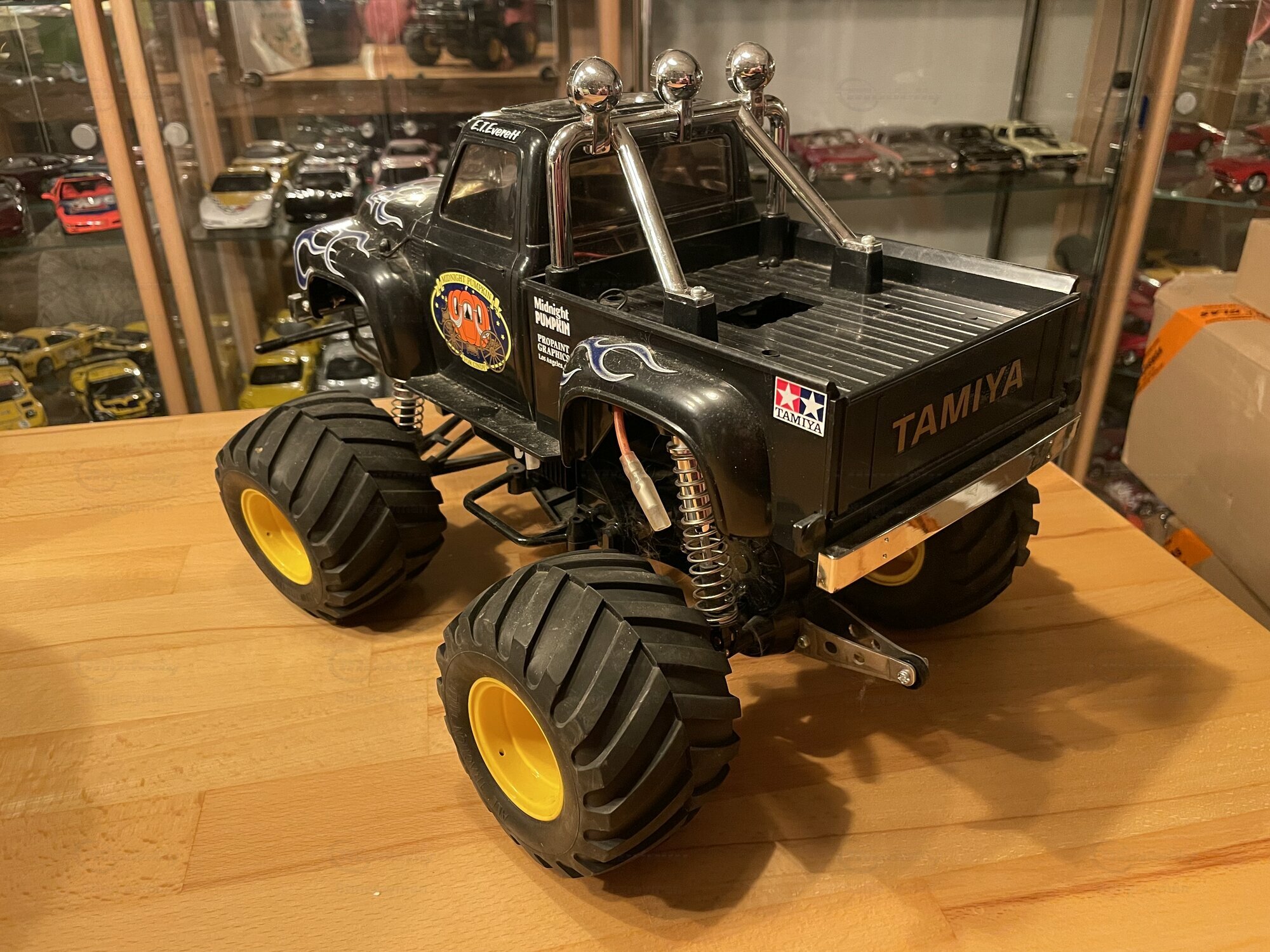 Die hier gezeigte Miniatur gehört zur Sammlung des Modelly‑Mitglieds „Stingrayman“ und ist ein Modellauto im Maßstab 1:10 von Tamiya. Es handelt sich um die bekannte „Midnight Pumpkin“-Karosserie, die optisch sehr eng am Ford F‑100 der Jahre 1953 bis 1956 orientiert ist. Das Modell ist aus Kunststoff gefertigt; die Karosserie besteht aus robustem, lackiertem ABS, die Stoßstangen sowie Roll‑Bar‑Elemente sind als verchromte Kunststoffteile ausgeführt. Damit ist ausdrücklich erwähnt: Die Miniatur wurde auf Basis des Materials Plastik hergestellt. Auf den Fotos sind die charakteristischen, großvolumigen Ballonreifen mit breitem Blockprofil und gelben Felgen zu sehen; sie verleihen dem Fahrzeug die typische Monster‑Truck‑Anmutung. Vorne sitzt ein Rohrschutzbügel, dahinter eine zweistufige, verchromte Stoßstange. Die Frontmaske nimmt die Form des Ford F‑100 mit zwei Rundscheinwerfern und zentralem Zierstab auf. Auf dem Dach befindet sich ein verchromter Überrollbügel mit drei Zusatzscheinwerfern, deren Kappen mit der Aufschrift „Brite“ bedruckt sind. Im Innenraum sieht man getönte Fensterflächen; wie bei RC‑Karosserien üblich, bleibt der Innenausbau reduziert, um Platz für Elektronik zu schaffen. Die Beklebung mit blauen Flammen auf schwarzem Lack und dem „Midnight Pumpkin“-Logo an den Türen ist sauber umgesetzt und entspricht dem bekannten Tamiya‑Layout. Dieser Auftritt ist auffällig, aber funktional: die klaren Dekore dienen der schnellen Wiedererkennung auf dem Parcours.