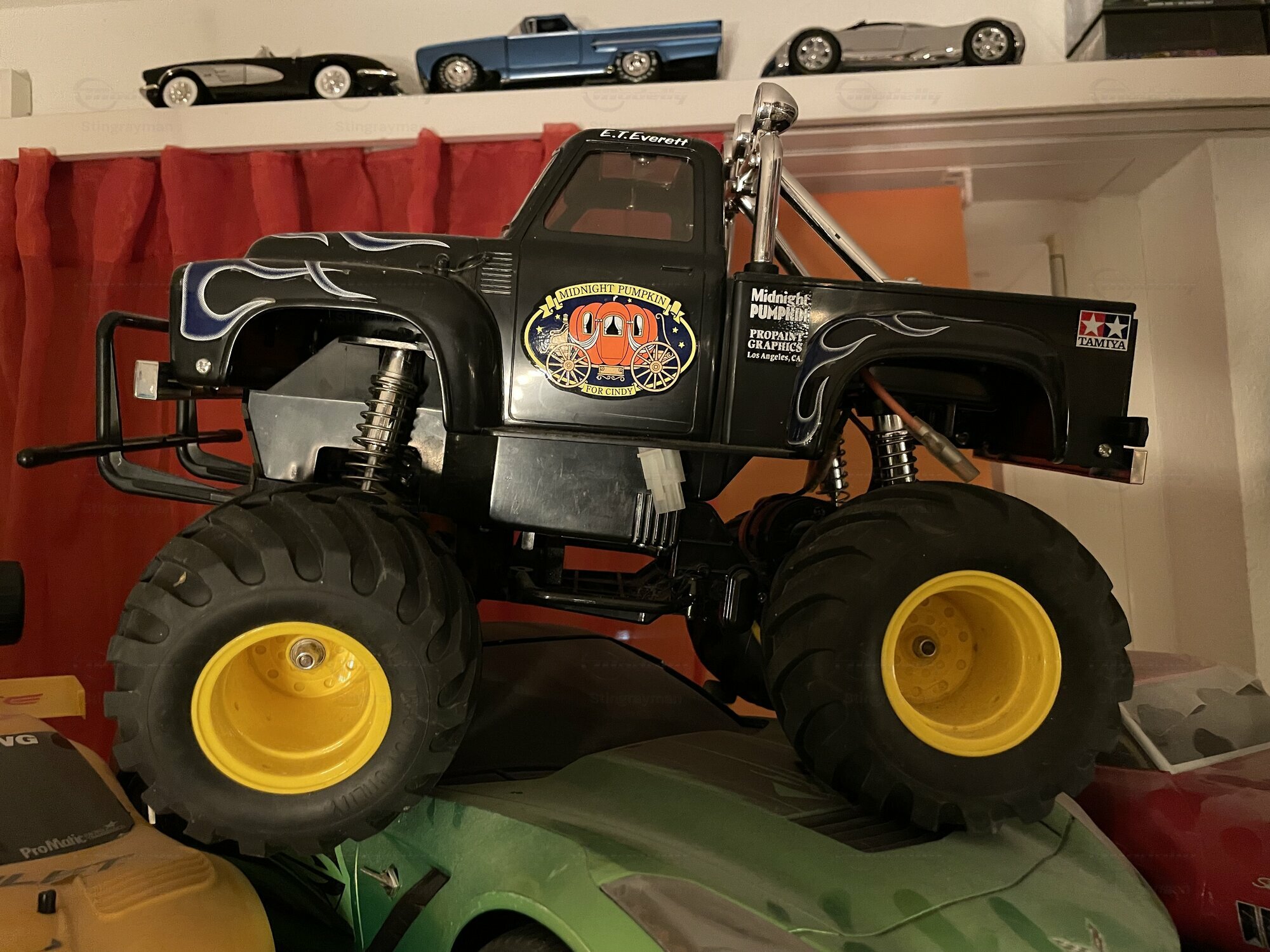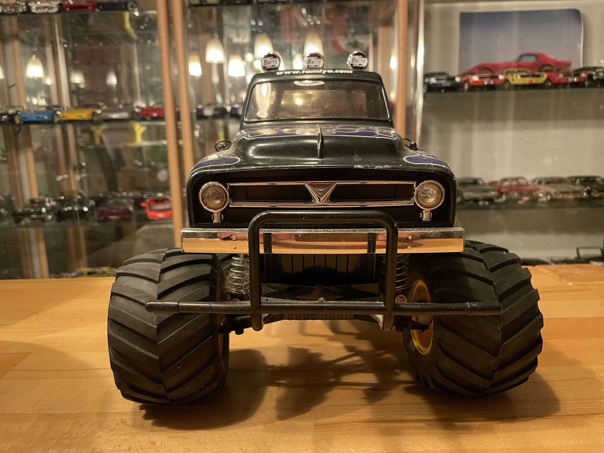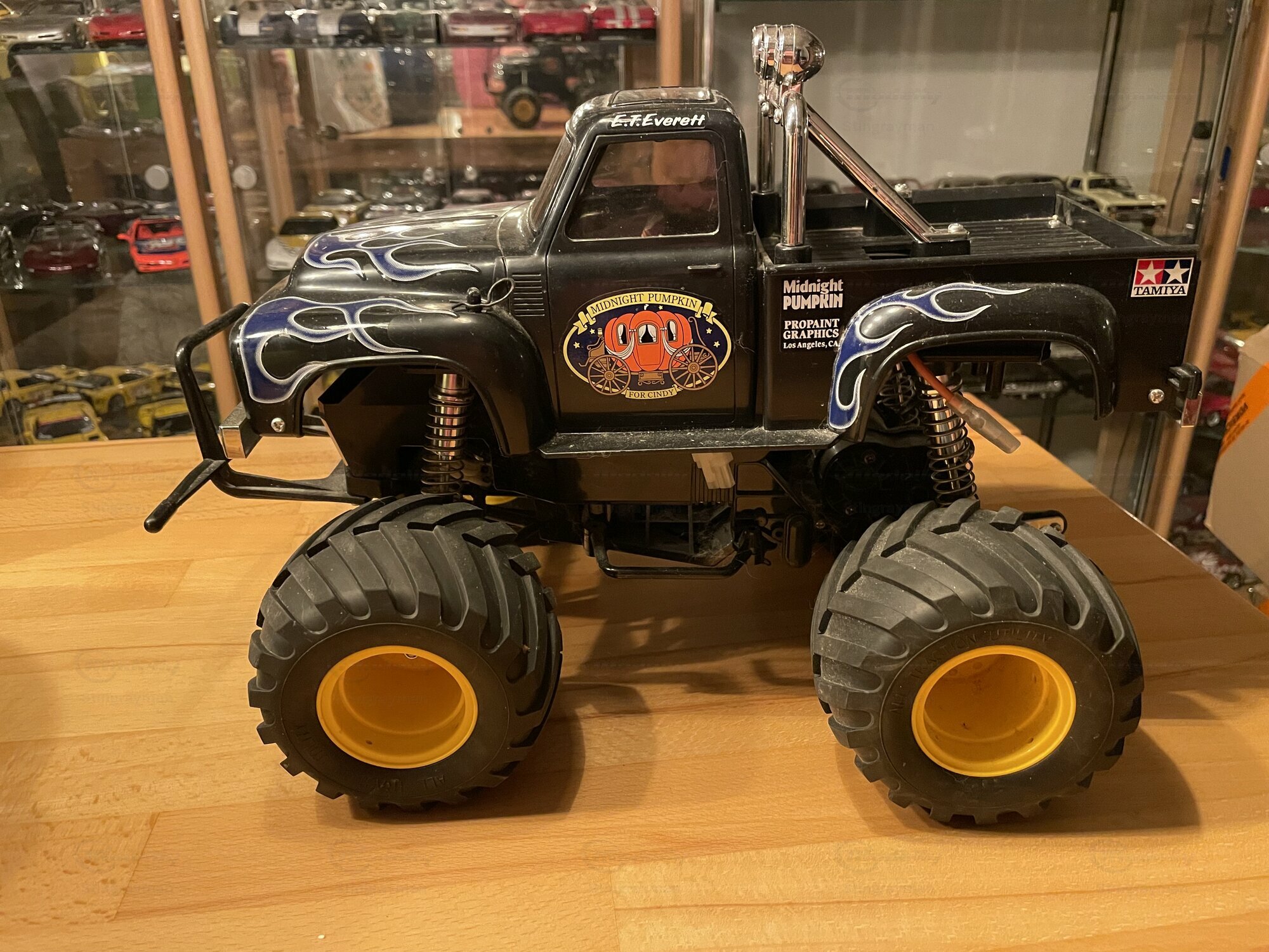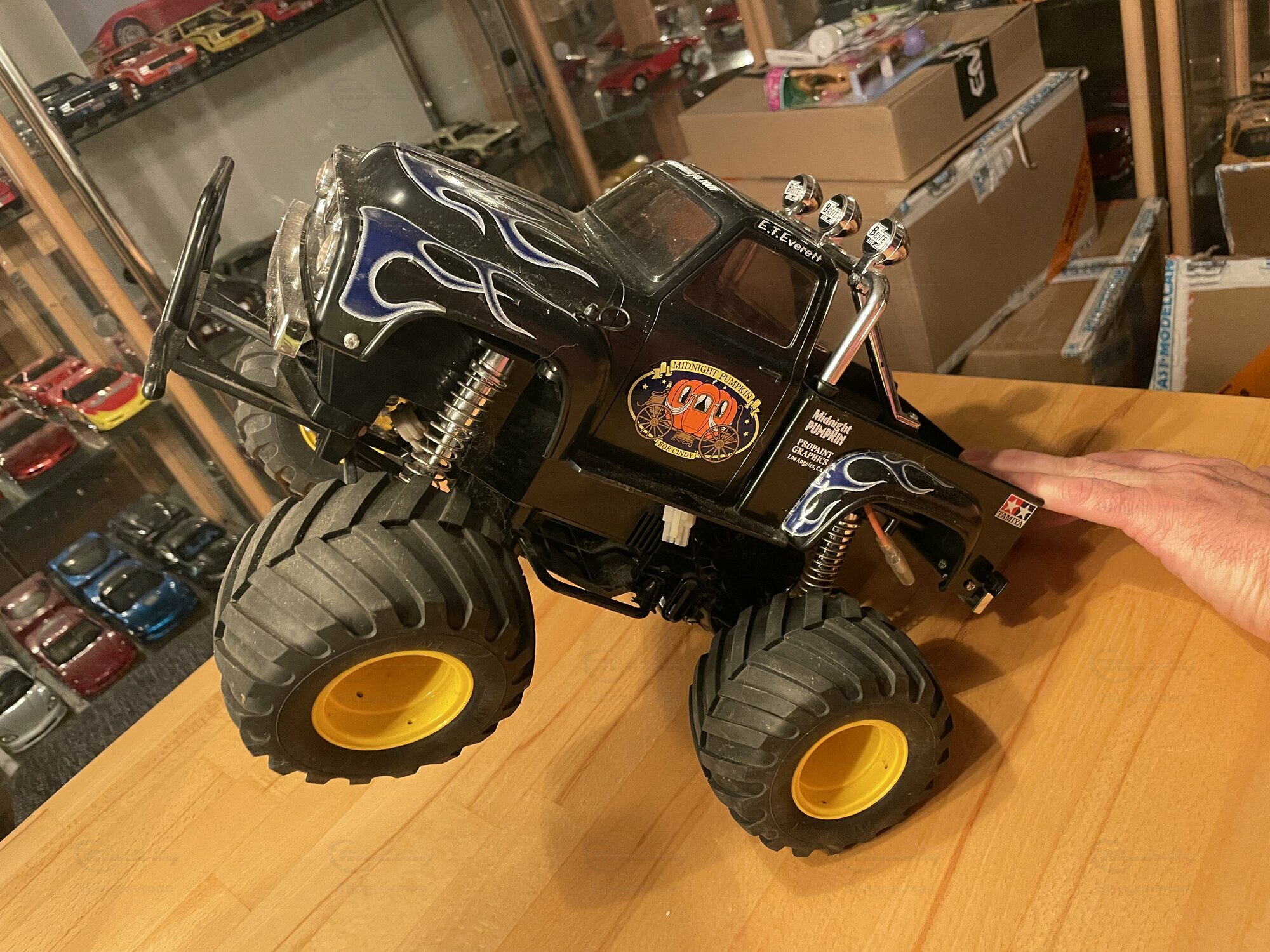 Die hier gezeigte Miniatur gehört zur Sammlung des Modelly‑Mitglieds „Stingrayman“ und ist ein Modellauto im Maßstab 1:10 von Tamiya. Es handelt sich um die bekannte „Midnight Pumpkin“-Karosserie, die optisch sehr eng am Ford F‑100 der Jahre 1953 bis 1956 orientiert ist. Das Modell ist aus Kunststoff gefertigt; die Karosserie besteht aus robustem, lackiertem ABS, die Stoßstangen sowie Roll‑Bar‑Elemente sind als verchromte Kunststoffteile ausgeführt. Damit ist ausdrücklich erwähnt: Die Miniatur wurde auf Basis des Materials Plastik hergestellt. Auf den Fotos sind die charakteristischen, großvolumigen Ballonreifen mit breitem Blockprofil und gelben Felgen zu sehen; sie verleihen dem Fahrzeug die typische Monster‑Truck‑Anmutung. Vorne sitzt ein Rohrschutzbügel, dahinter eine zweistufige, verchromte Stoßstange. Die Frontmaske nimmt die Form des Ford F‑100 mit zwei Rundscheinwerfern und zentralem Zierstab auf. Auf dem Dach befindet sich ein verchromter Überrollbügel mit drei Zusatzscheinwerfern, deren Kappen mit der Aufschrift „Brite“ bedruckt sind. Im Innenraum sieht man getönte Fensterflächen; wie bei RC‑Karosserien üblich, bleibt der Innenausbau reduziert, um Platz für Elektronik zu schaffen. Die Beklebung mit blauen Flammen auf schwarzem Lack und dem „Midnight Pumpkin“-Logo an den Türen ist sauber umgesetzt und entspricht dem bekannten Tamiya‑Layout. Dieser Auftritt ist auffällig, aber funktional: die klaren Dekore dienen der schnellen Wiedererkennung auf dem Parcours.
