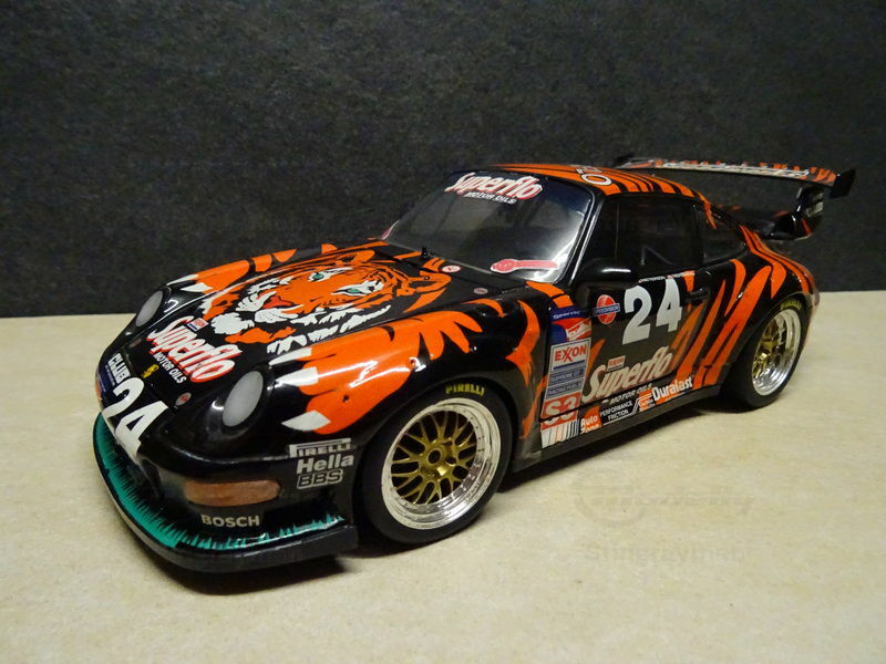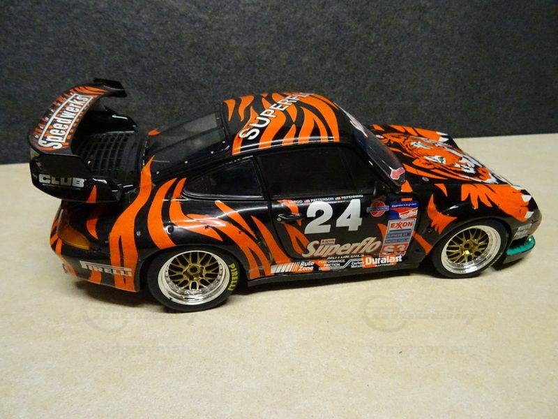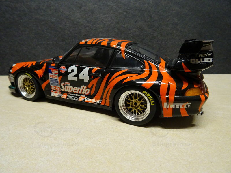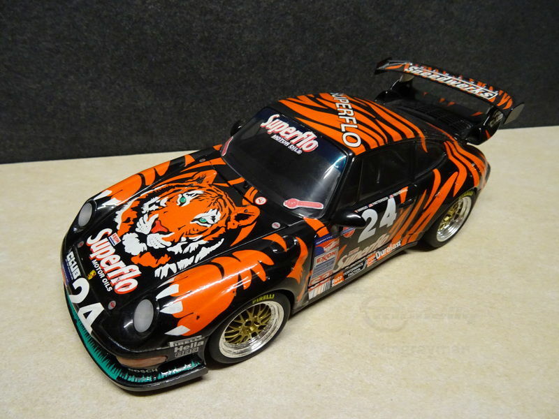 Der optische Eindruck dieses 1:18-Modells von UTmodels Racing Collection ist beeindruckend. Mit seinen präzisen Details und der auffälligen Lackierung repräsentiert das Modell den kraftvollen und dynamischen Charakter des ursprünglichen Porsche 911 (993) GT2 Evo. Die markanten Tigerstreifen und die kontrastierende Farbgebung machen dieses Modell zu einem Blickfang in jeder Sammlung. Die Sponsorlogos, die detaillierten Felgen und die akkurat nachgebildeten aerodynamischen Komponenten tragen zum authentischen Gesamteindruck bei. Als modifiziertes Modell hebt es sich deutlich von den Serienversionen ab und wird durch seine Individualität und die handgefertigten Anpassungen zu einem einzigartigen Sammlerstück. Dieses Modell ist ein Muss für jeden ernsthaften Autosammler und Fans des Porsche 911.