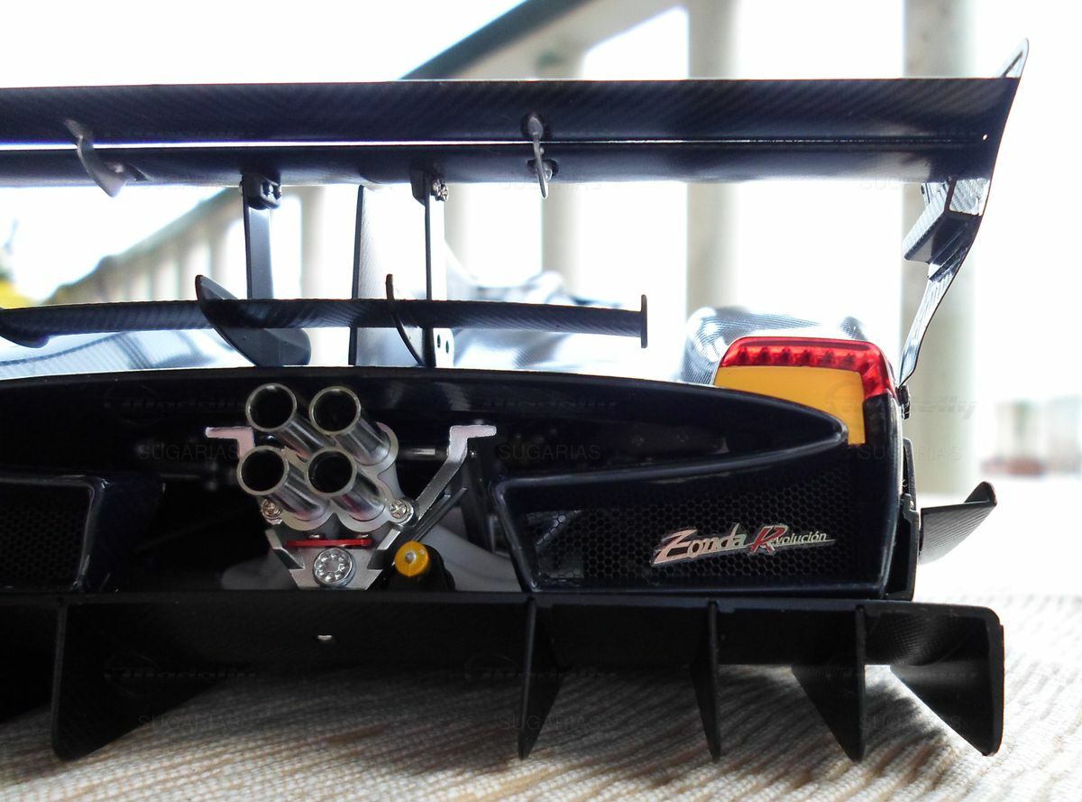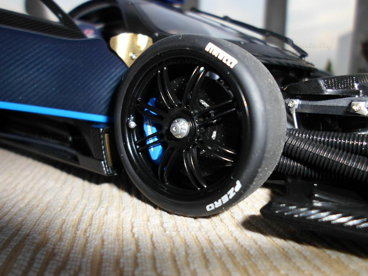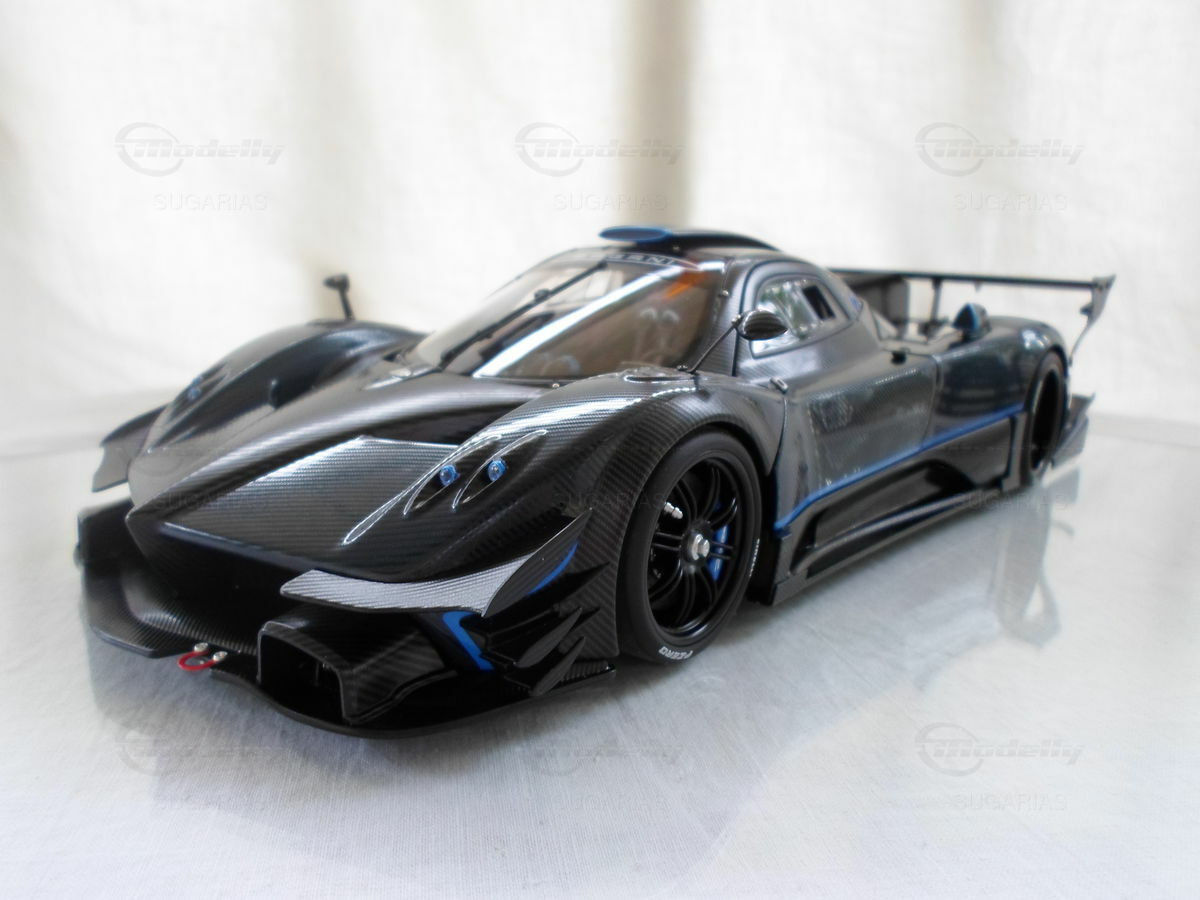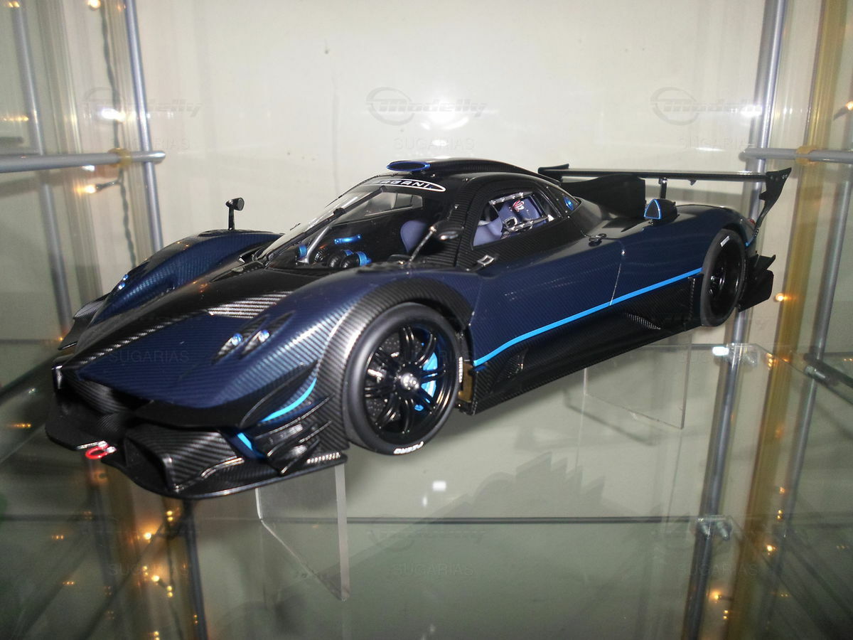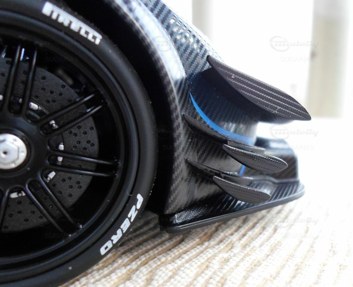 Das Modellauto des Pagani Zonda Revolucion im Maßstab 1:18 ist eine präzise Miniatur, hergestellt von AUTOart aus hochwertigem Diecast-Material. Dieses Modell, Bestandteil der Sammlung von Modelly-Mitglied "SUGARIAS", zeigt unglaubliche Detailtreue. Die Karosserie ist schwarz und mit blauen Akzenten versehen. Die sichtbaren Carbonmuster zusammen mit den detaillierten Scheinwerfern und Rückspiegeln, sowie der filigrane Heckspoiler illustrieren die sorgfältige Handwerkskunst. Sponsorenlogos wie jene von Pirelli und Brembo sind ebenfalls auf dieser Miniatur zu finden und verstärken die Authentizität des Modells. Diese Features machen das Modell zu einem wertvollen Sammlerstück.