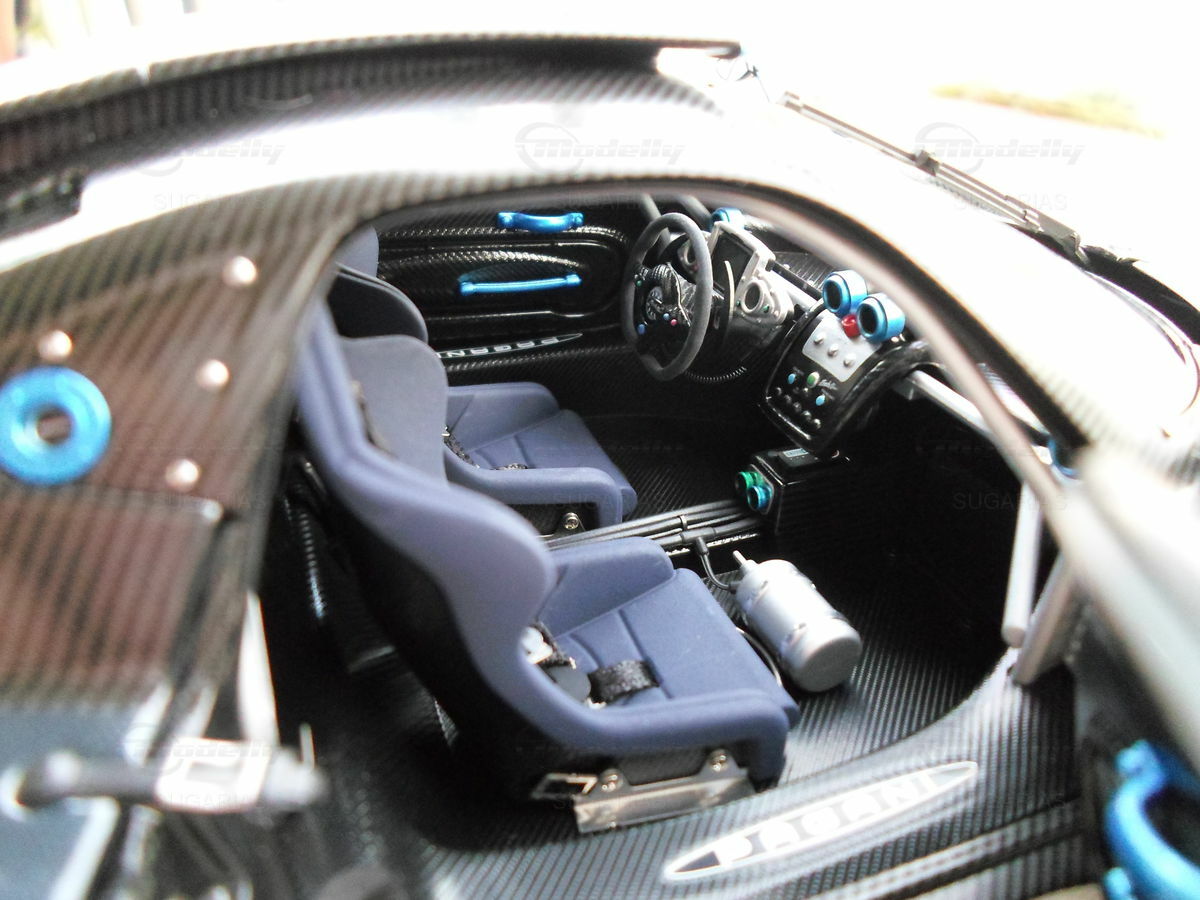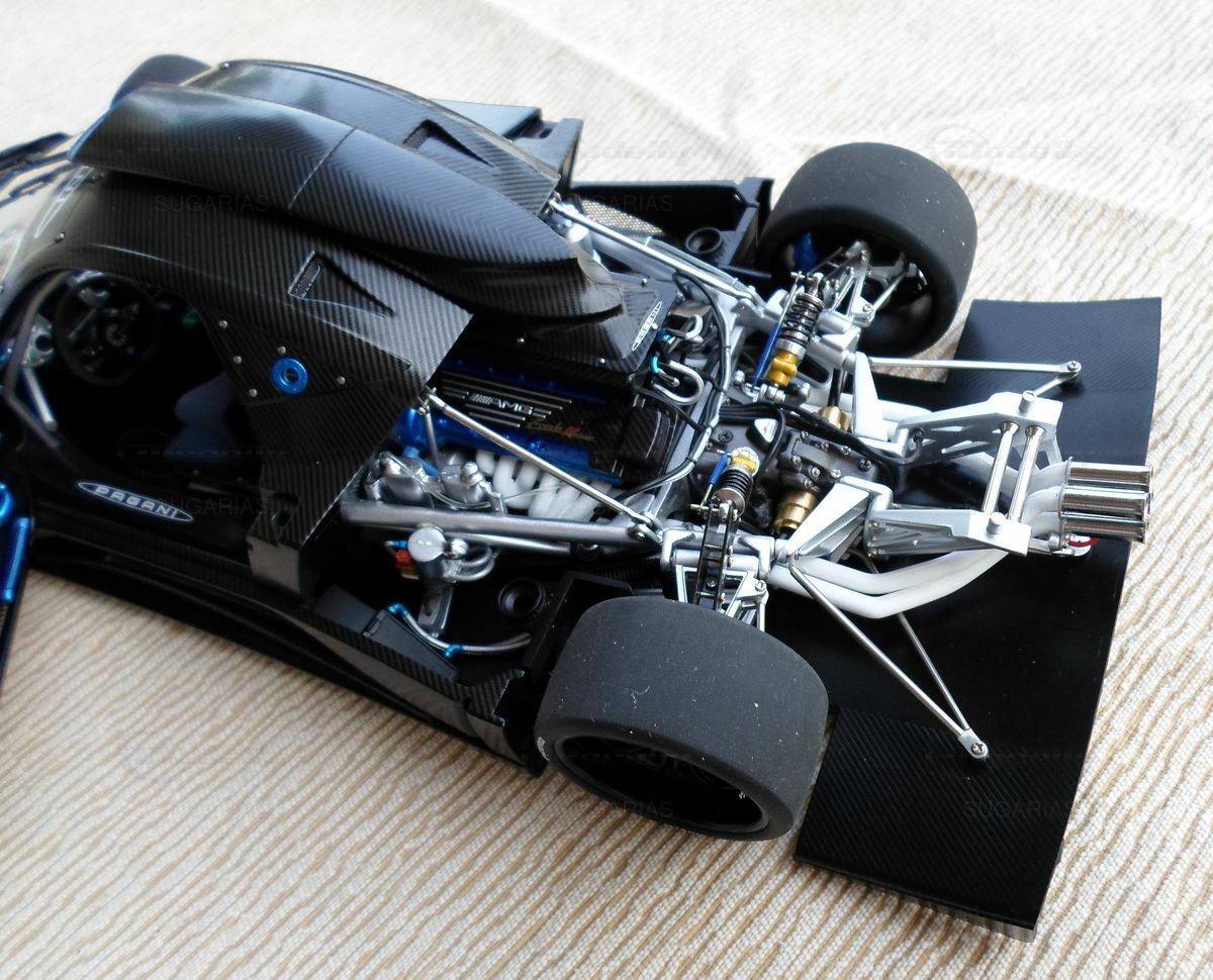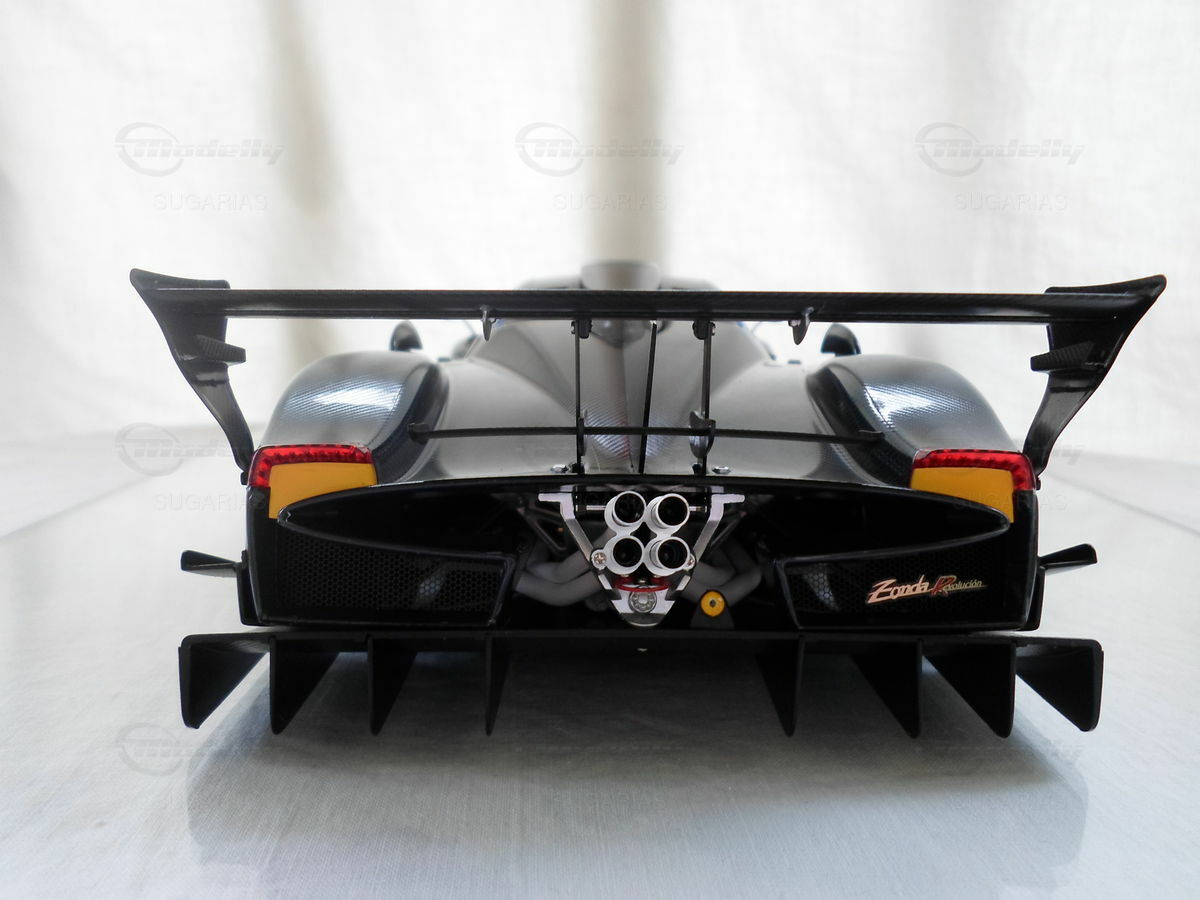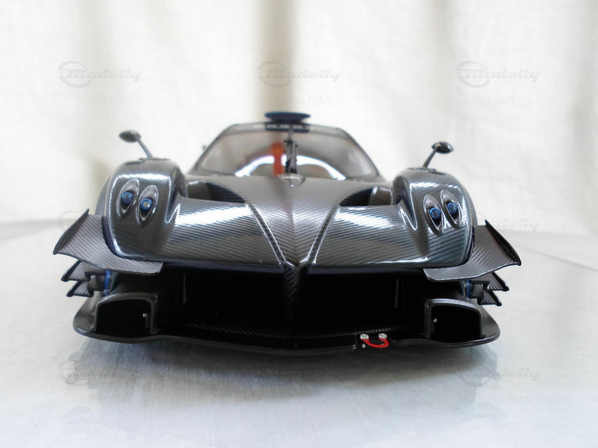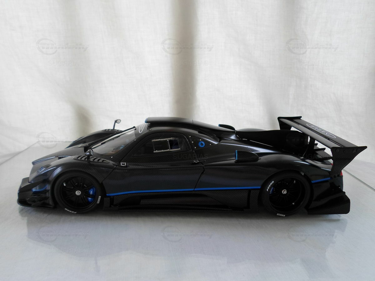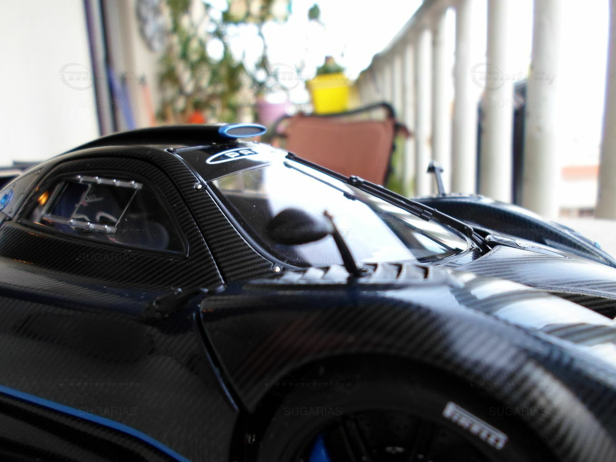 Das Modellauto des Pagani Zonda Revolucion im Maßstab 1:18 ist eine präzise Miniatur, hergestellt von AUTOart aus hochwertigem Diecast-Material. Dieses Modell, Bestandteil der Sammlung von Modelly-Mitglied "SUGARIAS", zeigt unglaubliche Detailtreue. Die Karosserie ist schwarz und mit blauen Akzenten versehen. Die sichtbaren Carbonmuster zusammen mit den detaillierten Scheinwerfern und Rückspiegeln, sowie der filigrane Heckspoiler illustrieren die sorgfältige Handwerkskunst. Sponsorenlogos wie jene von Pirelli und Brembo sind ebenfalls auf dieser Miniatur zu finden und verstärken die Authentizität des Modells. Diese Features machen das Modell zu einem wertvollen Sammlerstück.