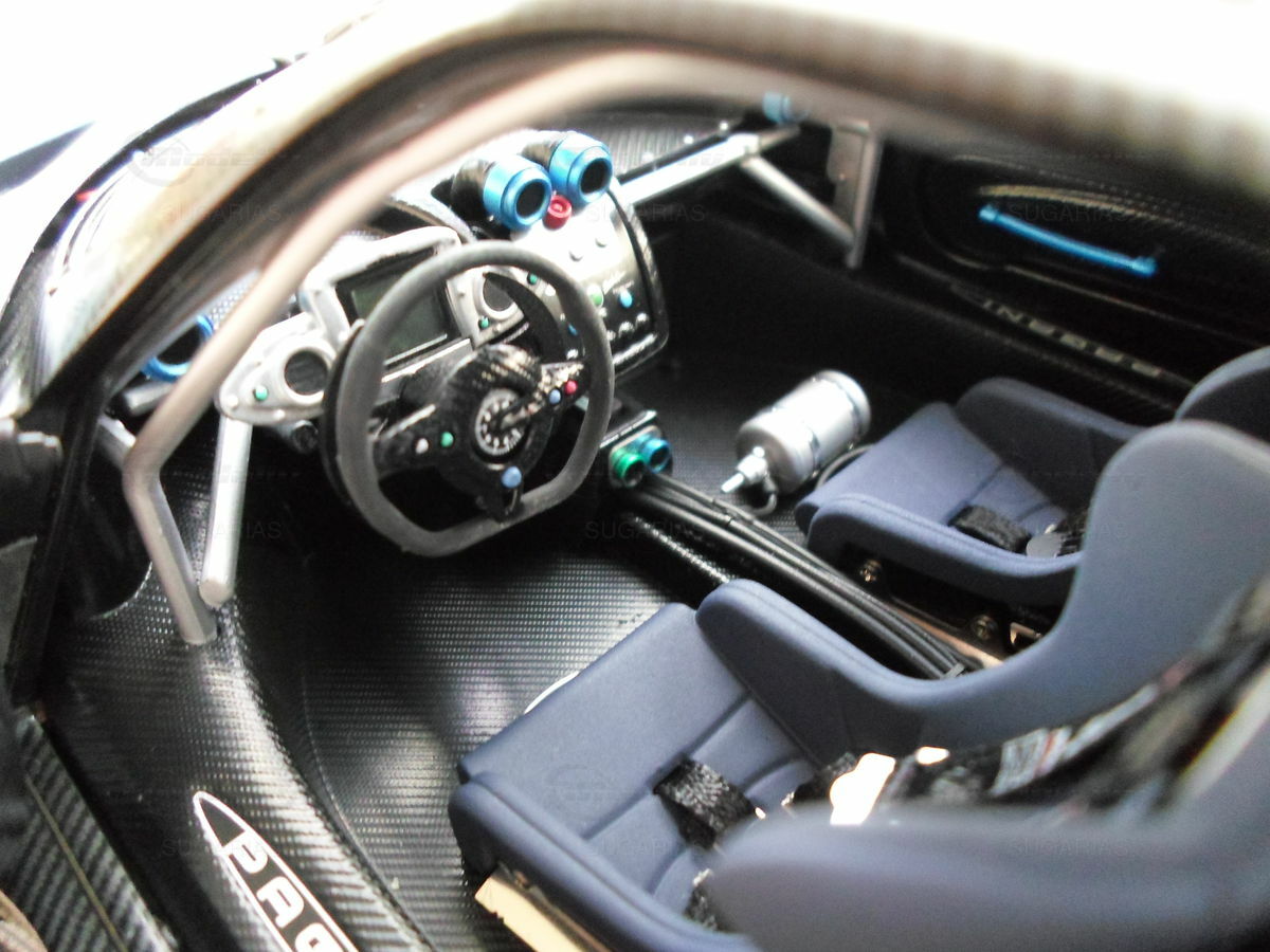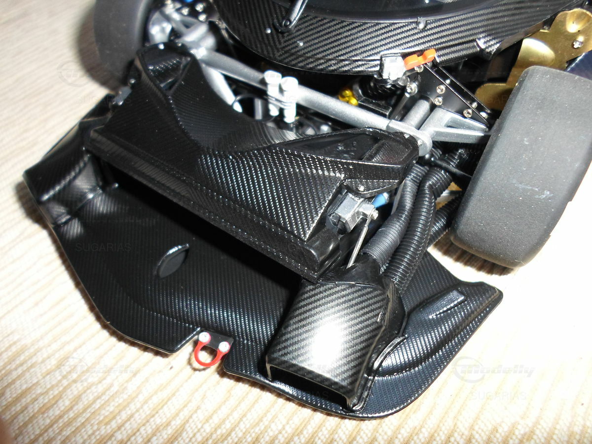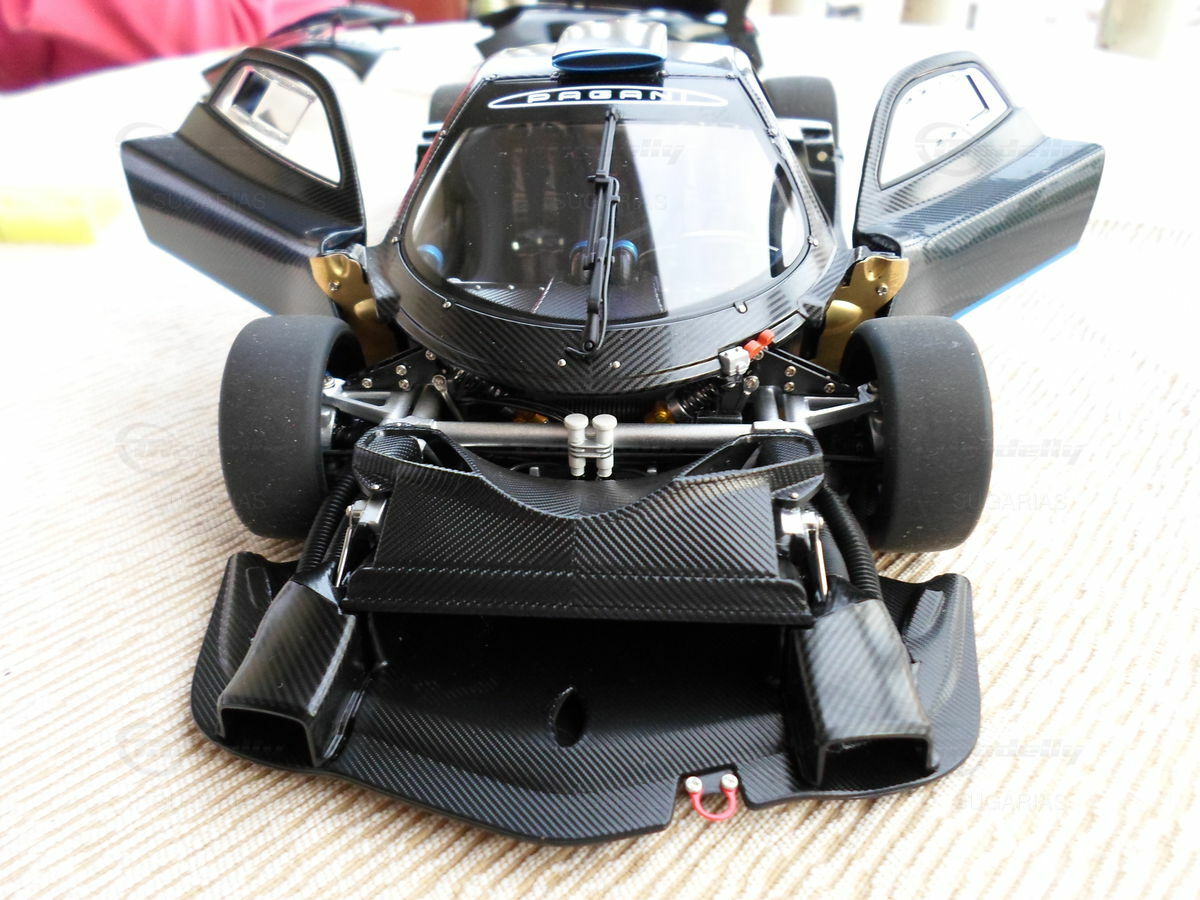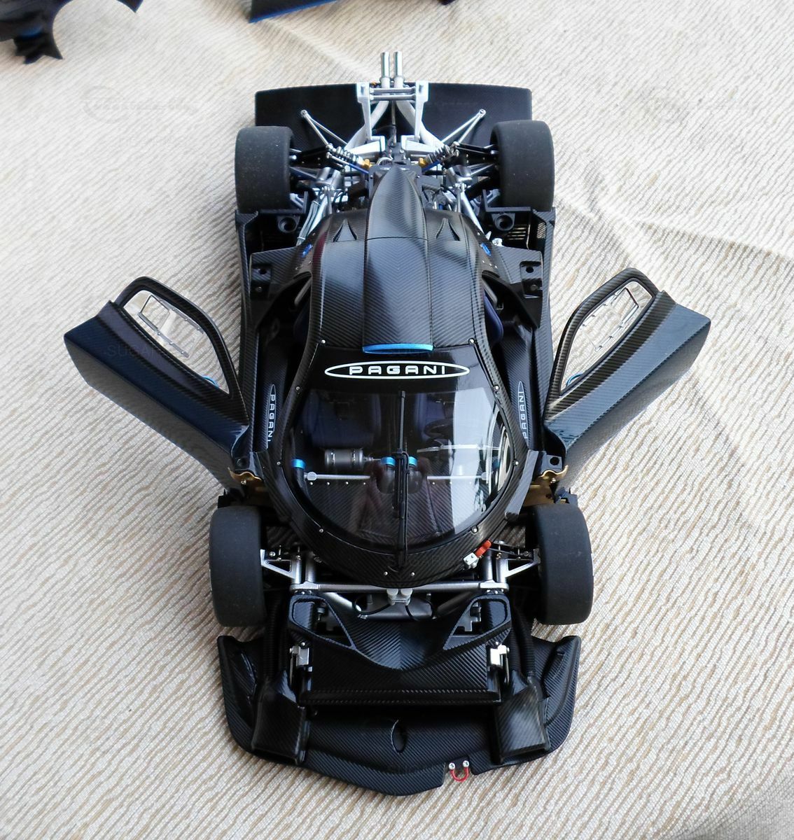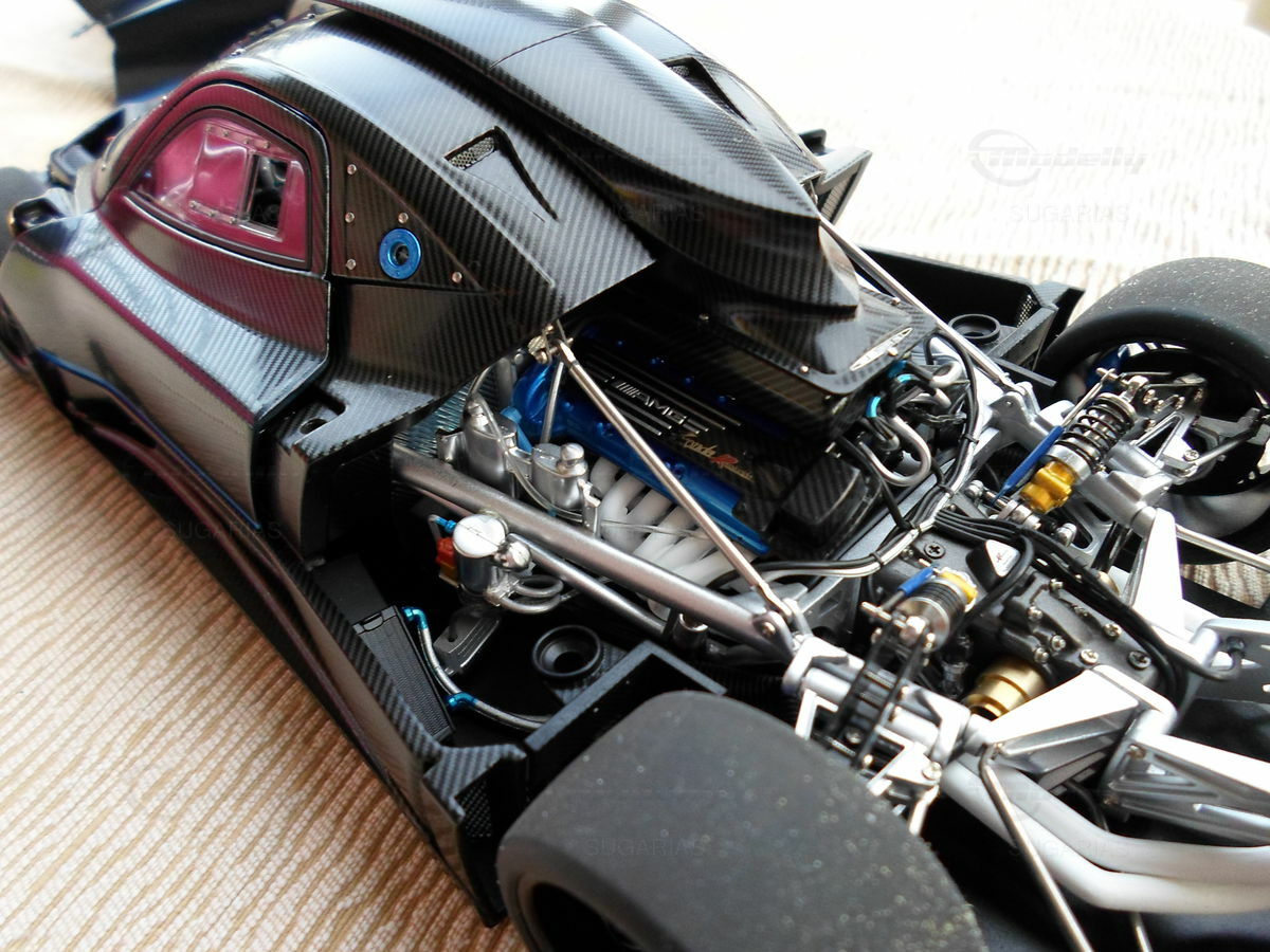 Das Modellauto des Pagani Zonda Revolucion im Maßstab 1:18 ist eine präzise Miniatur, hergestellt von AUTOart aus hochwertigem Diecast-Material. Dieses Modell, Bestandteil der Sammlung von Modelly-Mitglied "SUGARIAS", zeigt unglaubliche Detailtreue. Die Karosserie ist schwarz und mit blauen Akzenten versehen. Die sichtbaren Carbonmuster zusammen mit den detaillierten Scheinwerfern und Rückspiegeln, sowie der filigrane Heckspoiler illustrieren die sorgfältige Handwerkskunst. Sponsorenlogos wie jene von Pirelli und Brembo sind ebenfalls auf dieser Miniatur zu finden und verstärken die Authentizität des Modells. Diese Features machen das Modell zu einem wertvollen Sammlerstück.
