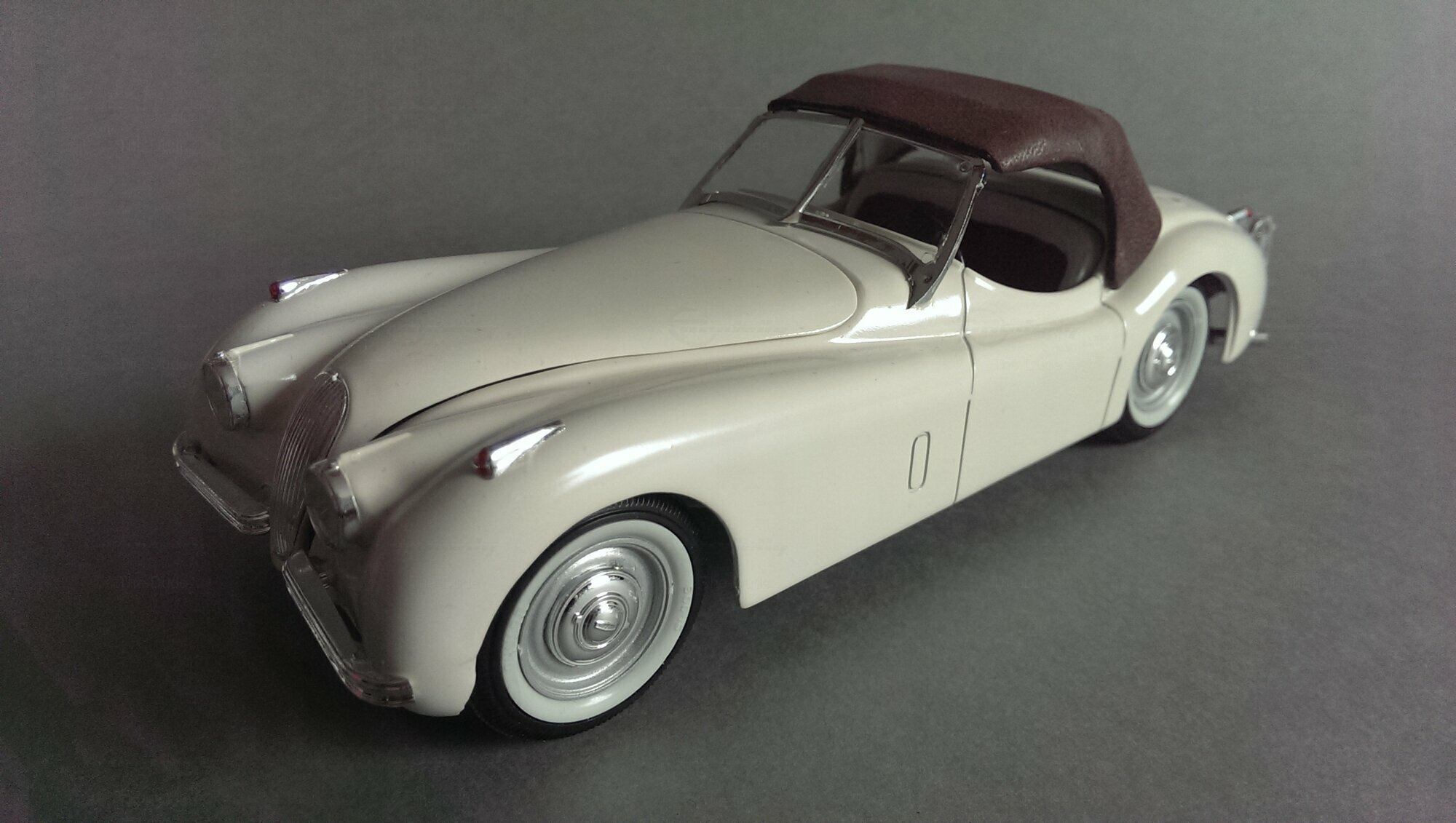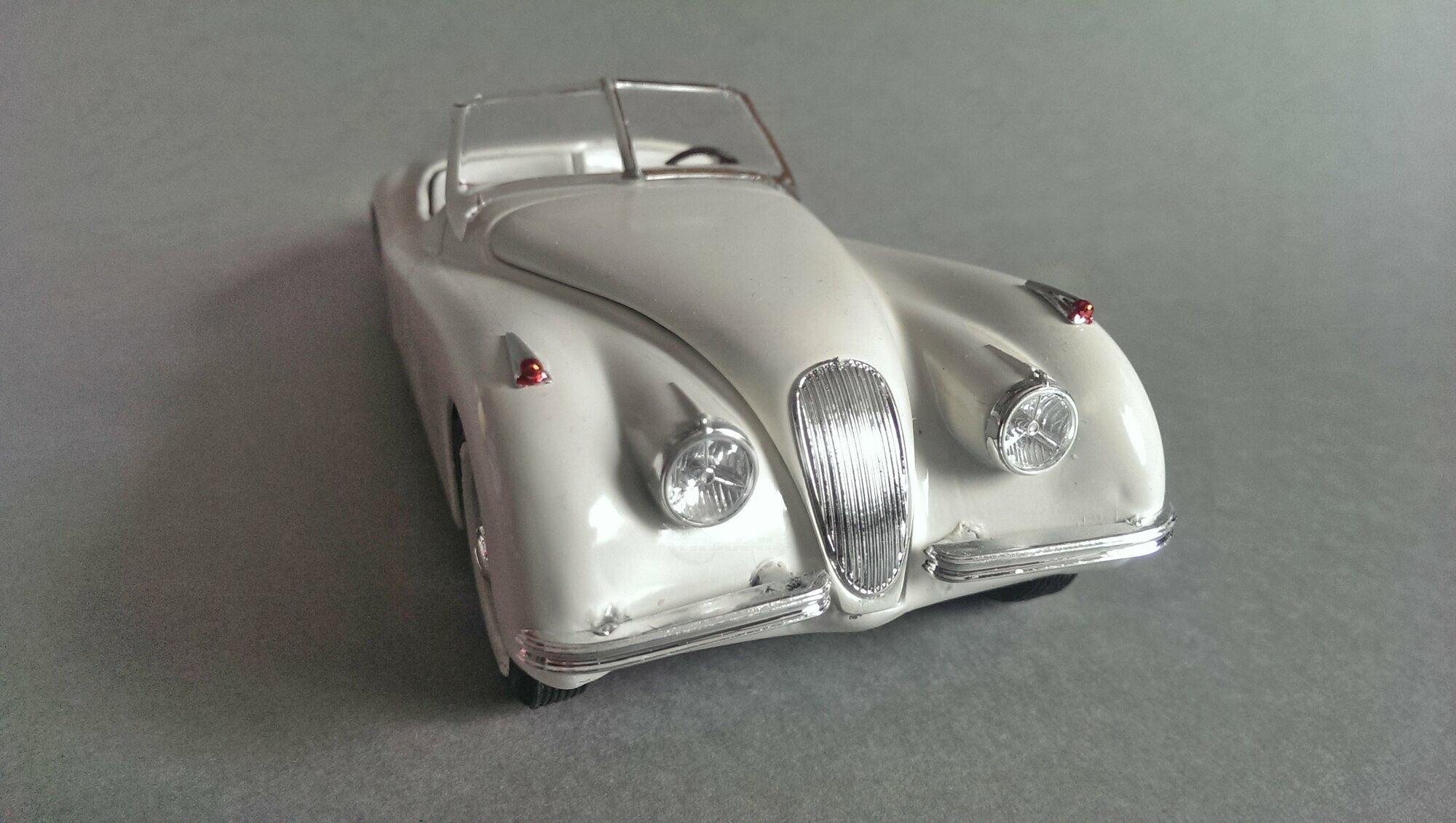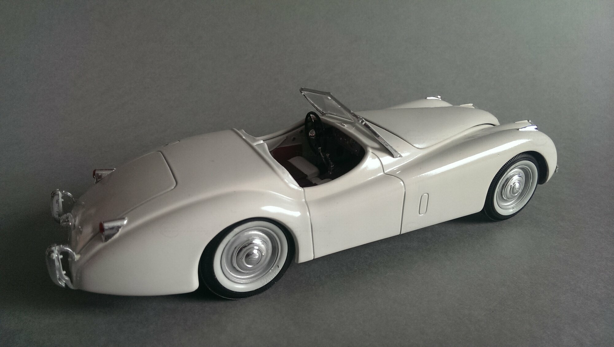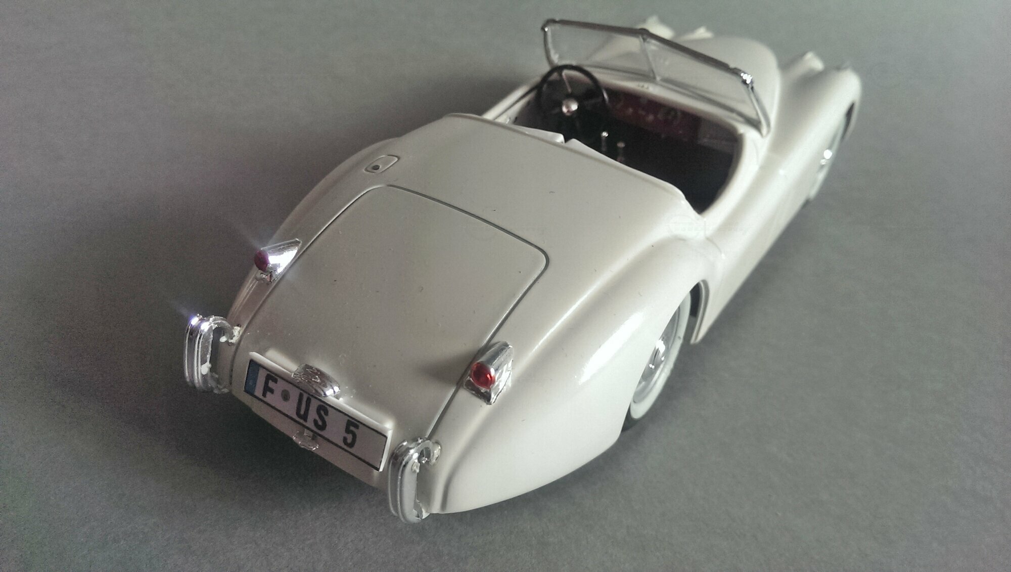 Das gezeigte Modell des Jaguar XK 120 im Maßstab 1:25 ist ein interessantes Sammlerstück für Modellauto-Enthusiasten weltweit. Durch die Modifikation durch "The-Dude" erhält dieses Modell eine individuelle Note, die es von Standardmodellen abhebt. Der Verzicht auf übertriebene decorative Elemente lässt die klassischen Linien des Jaguar XK 120 besonders gut zur Geltung kommen. Die in metallisch silber gehaltenen Felgen und die klare, glatte Lackierung sorgen dafür, dass das Modell sowohl im Regal als auch in einer Vitrine eine sehr gute Figur macht. Der ursprüngliche Charme des Jaguar XK 120 bleibt vollständig erhalten, während die Modifikationen für zusätzliche Individualität sorgen. Das Modell bietet ambitionierten Sammlern die Möglichkeit, ein Stück Automobilgeschichte im Kleinformat zu besitzen und ist zugleich ein Beweis für die handwerkliche Kunstfertigkeit von Modellbauern.