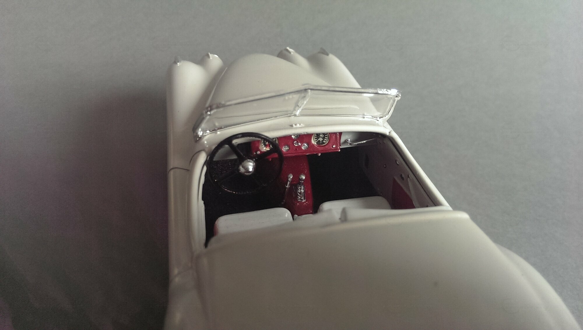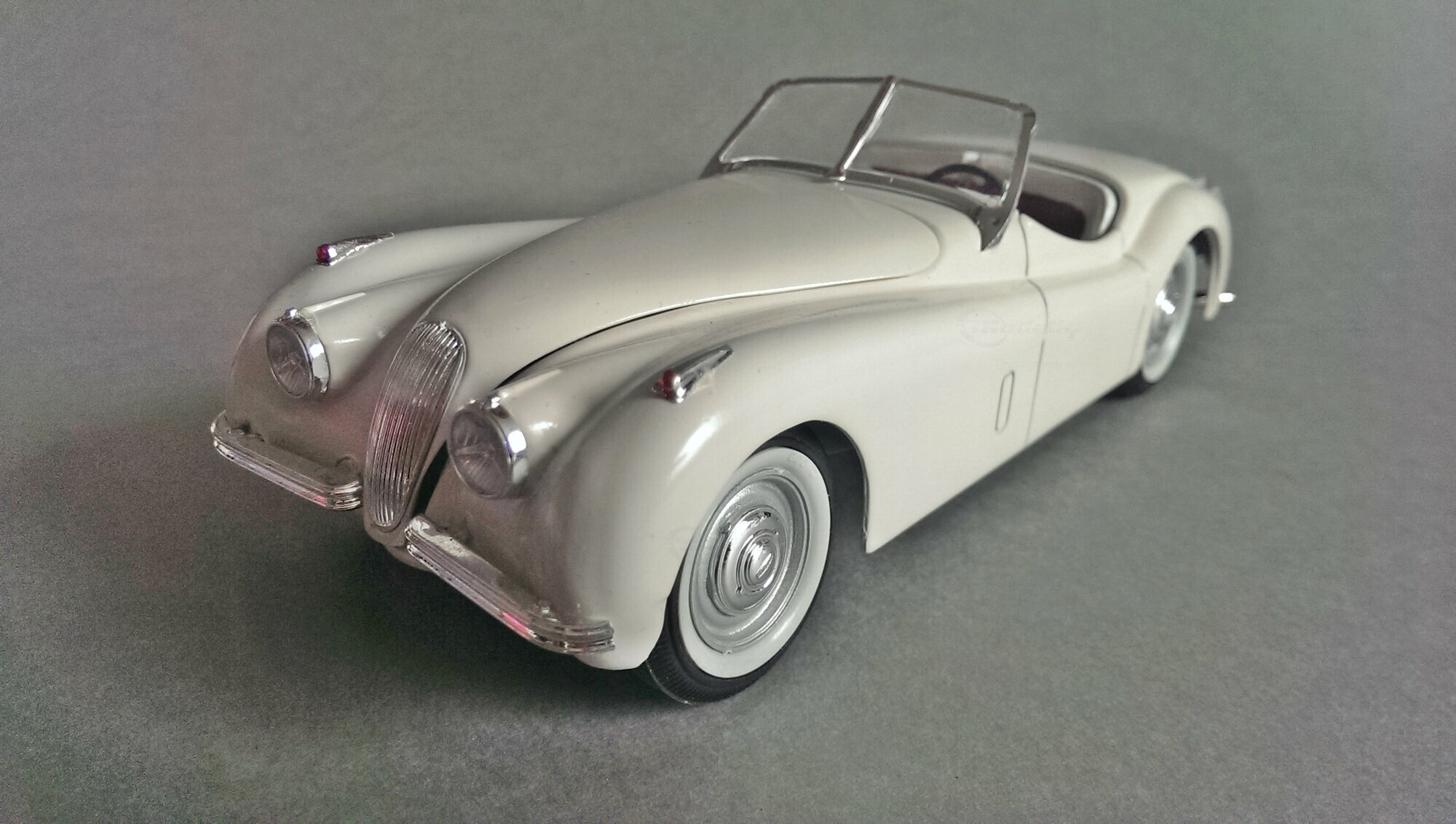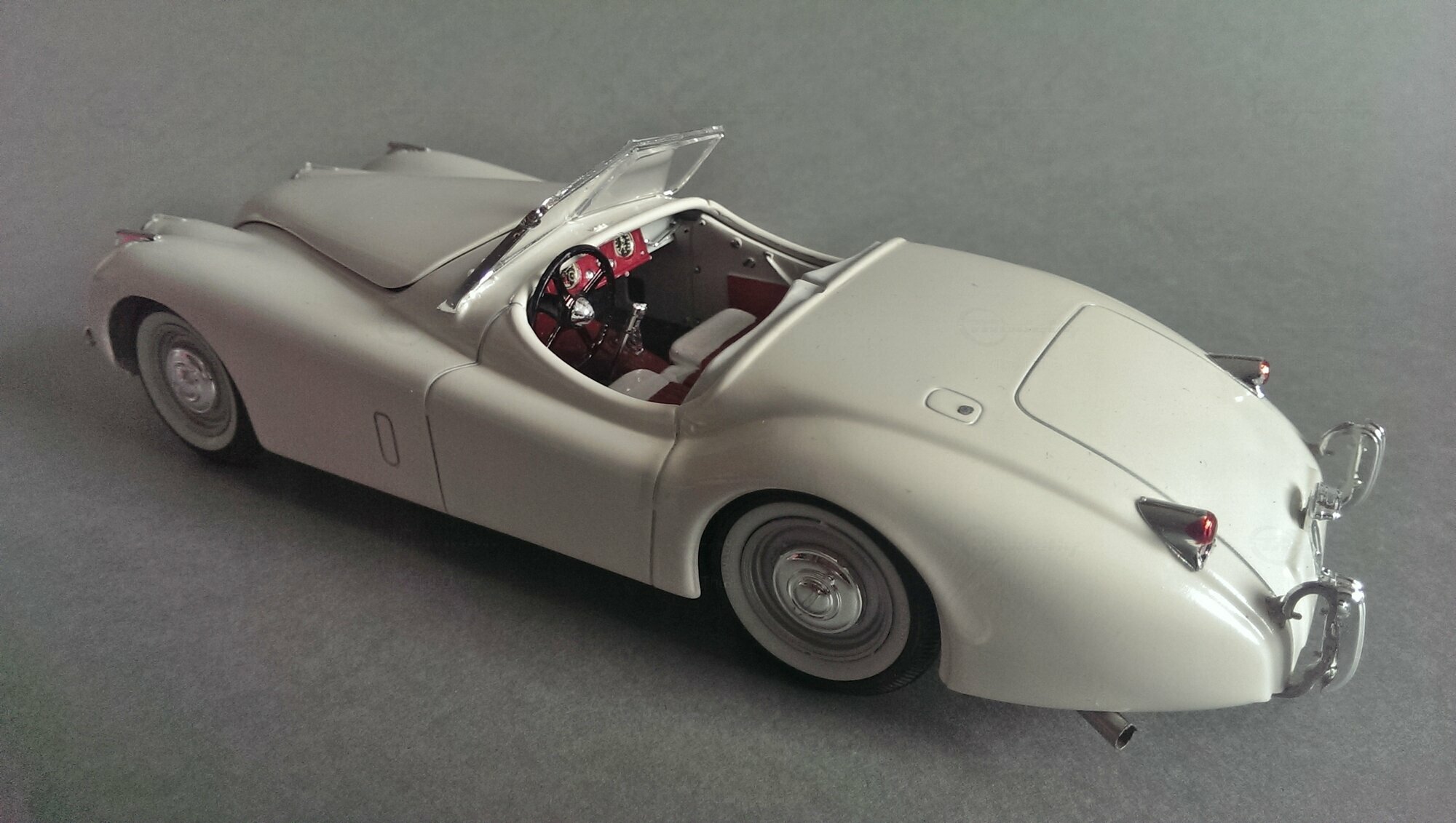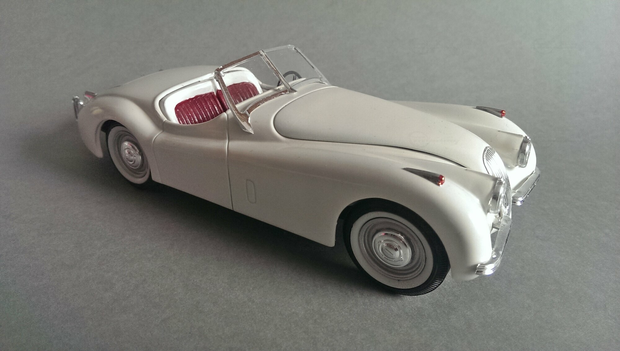 Das gezeigte Modell im Maßstab 1:25 von Revell basiert auf dem berühmten Jaguar XK 120. Dieses Modell wurde aus Plastik gefertigt und bietet eine detailgetreue Darstellung des Originals. Es wurde von dem Modelly-Mitglied „The-Dude“ modifiziert und unterscheidet sich daher von der ursprünglichen Version von Revell. Das Modell besticht durch präzise Nachbildungen der klassischen Linien und Proportionen des Originals. Besonders auffällig ist die weiße Lackierung, die dem Modell ein elegantes Erscheinungsbild verleiht. Das Interieur des Modells ist in Rot gehalten, was einen attraktiven Kontrast zur Außenfarbe bietet. Der Innenraum ist fein detailliert, mit einem realistisch gestalteten Armaturenbrett und Sitzen. Die klaren Kunststoffteile für die Windschutzscheibe und die Scheinwerfer tragen zu einem authentischen Gesamteindruck bei. Diese Modifikation bietet einen einzigartigen Blick auf den legendären Jaguar XK 120.