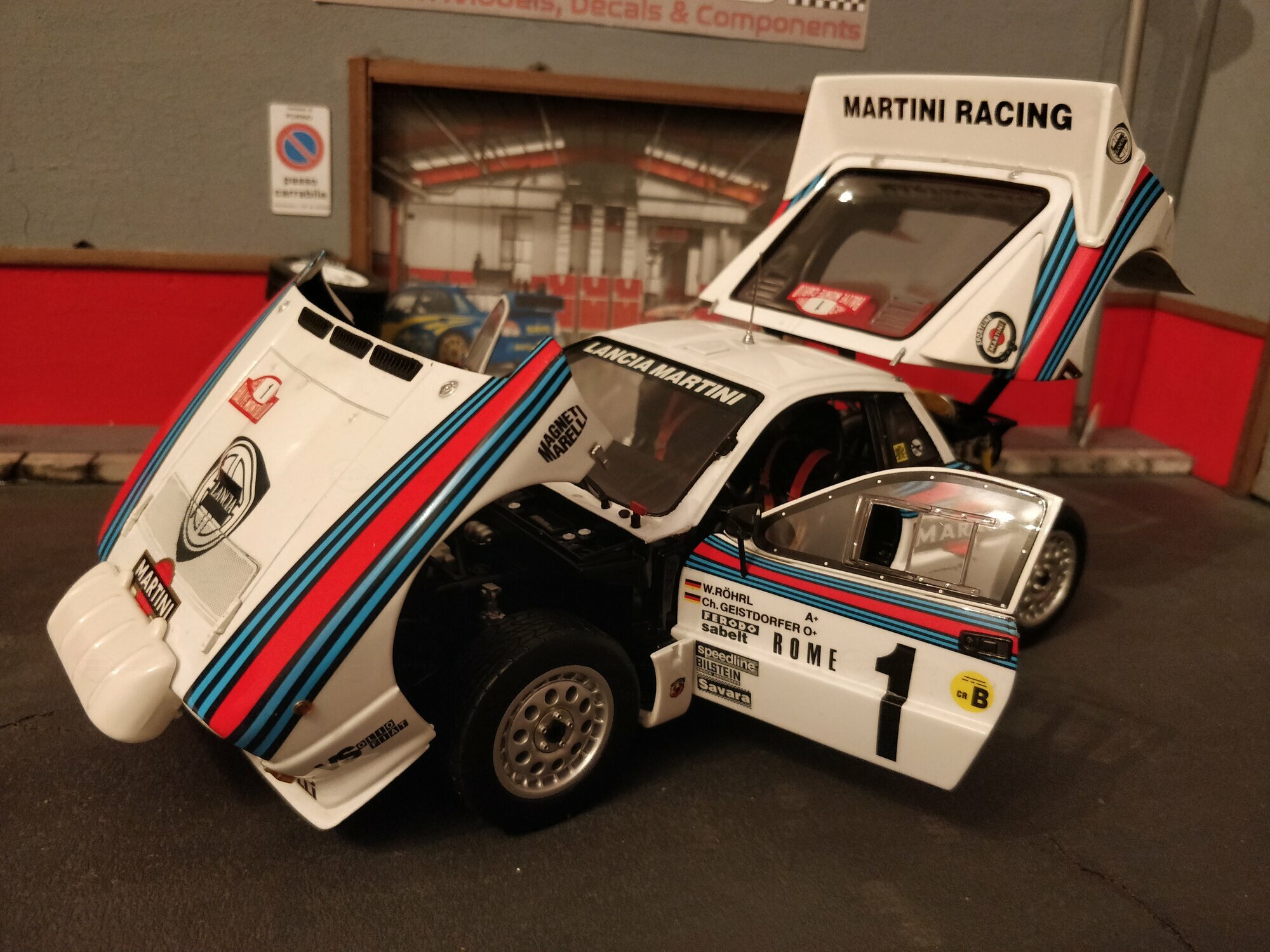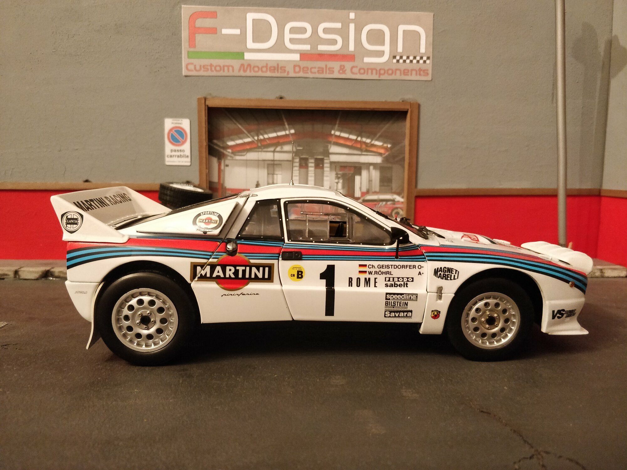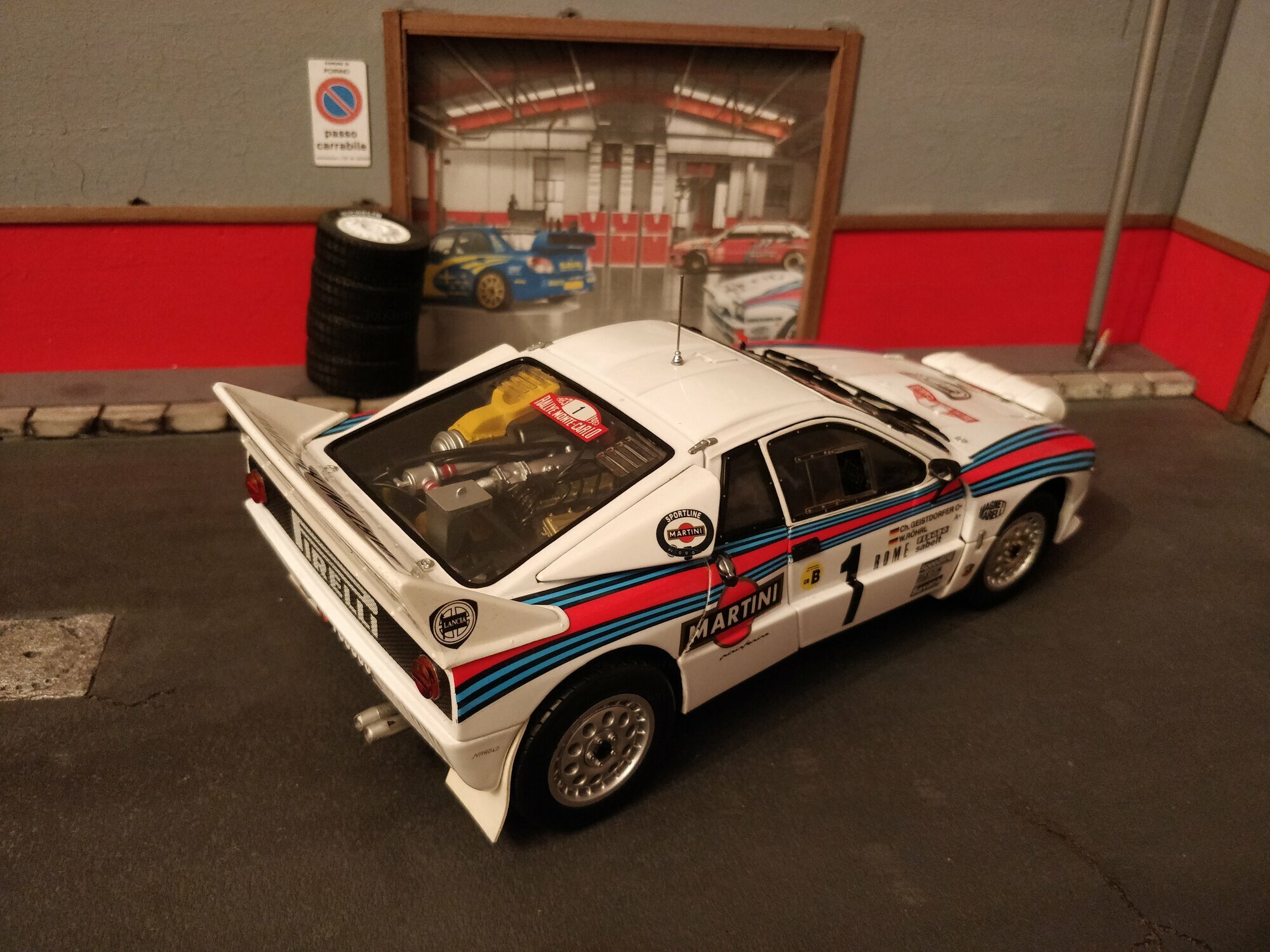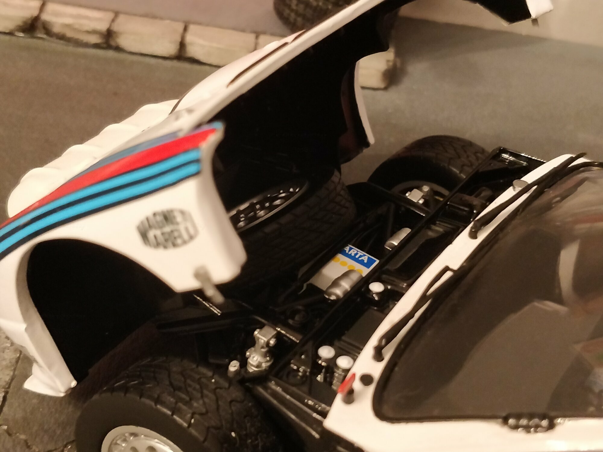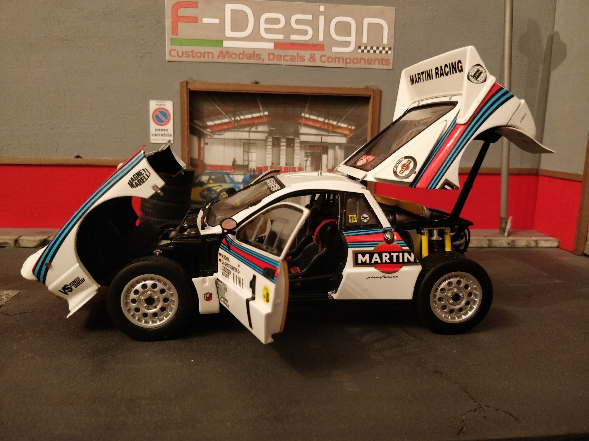 Das Design des Lancia 037 Rally stammte von dem berühmten Designer Pininfarina. Die Karosserie war gekennzeichnet durch eine fließende, aerodynamische Form, was für die Rennleistung von entscheidender Bedeutung war. Die ikonische Lackierung der Sponsoren, insbesondere von Martini Racing, ist ein wesentlicher Teil der Ästhetik dieses Fahrzeugs. Farblich zeigte sich der Wagen in der klassischen Martini-Livery, die weiße Grundfarbe kombiniert mit blauen und roten Streifen. Die prominenten Aufkleber von Pirelli, Magneti Marelli, und VS Olio Fiat, die auf den Fotos zu sehen sind, unterstreichen den konkurrenzorientierten Geist des Fahrzeugs und verbinden es mit seiner reichen Motorsportgeschichte.