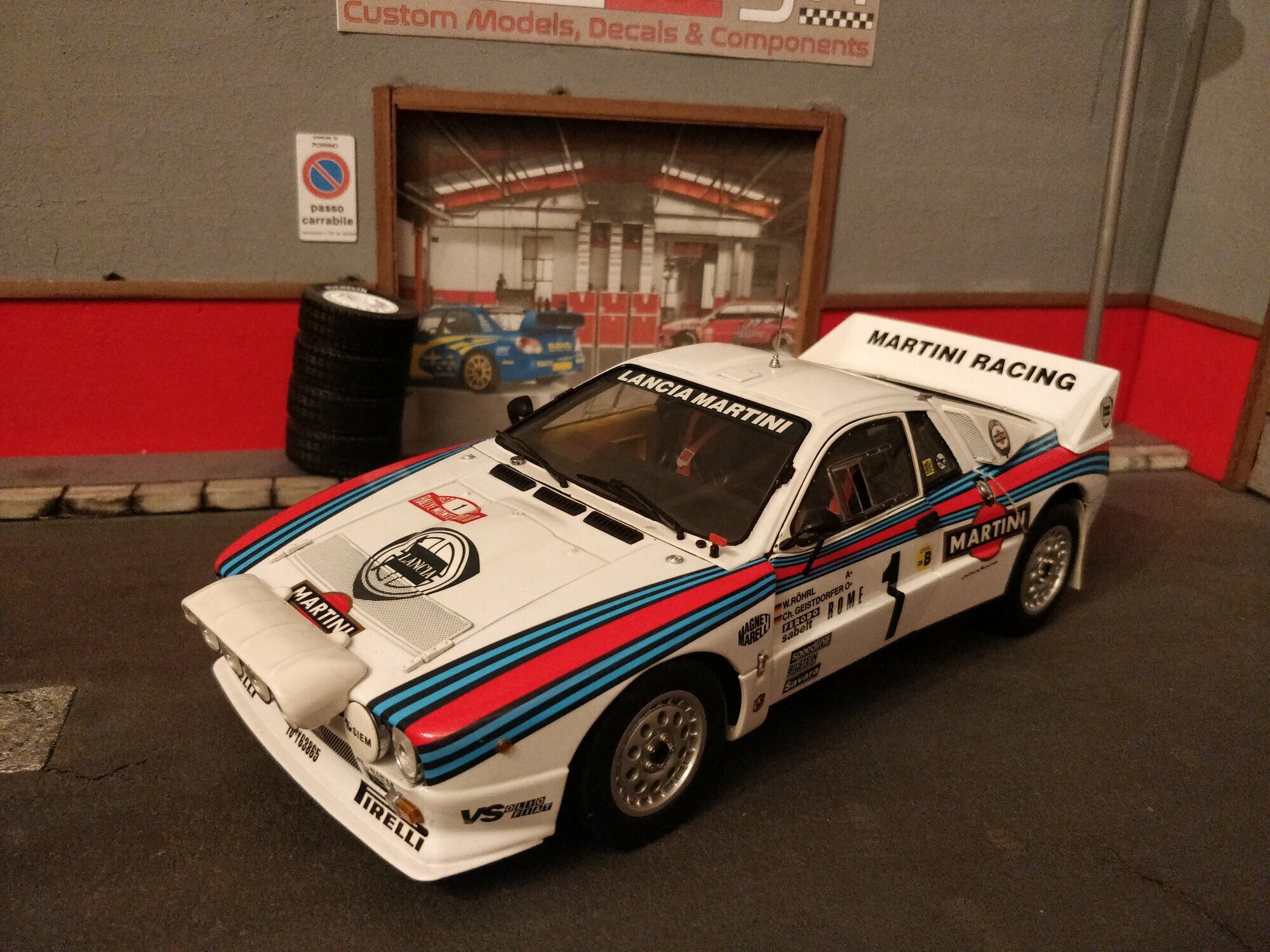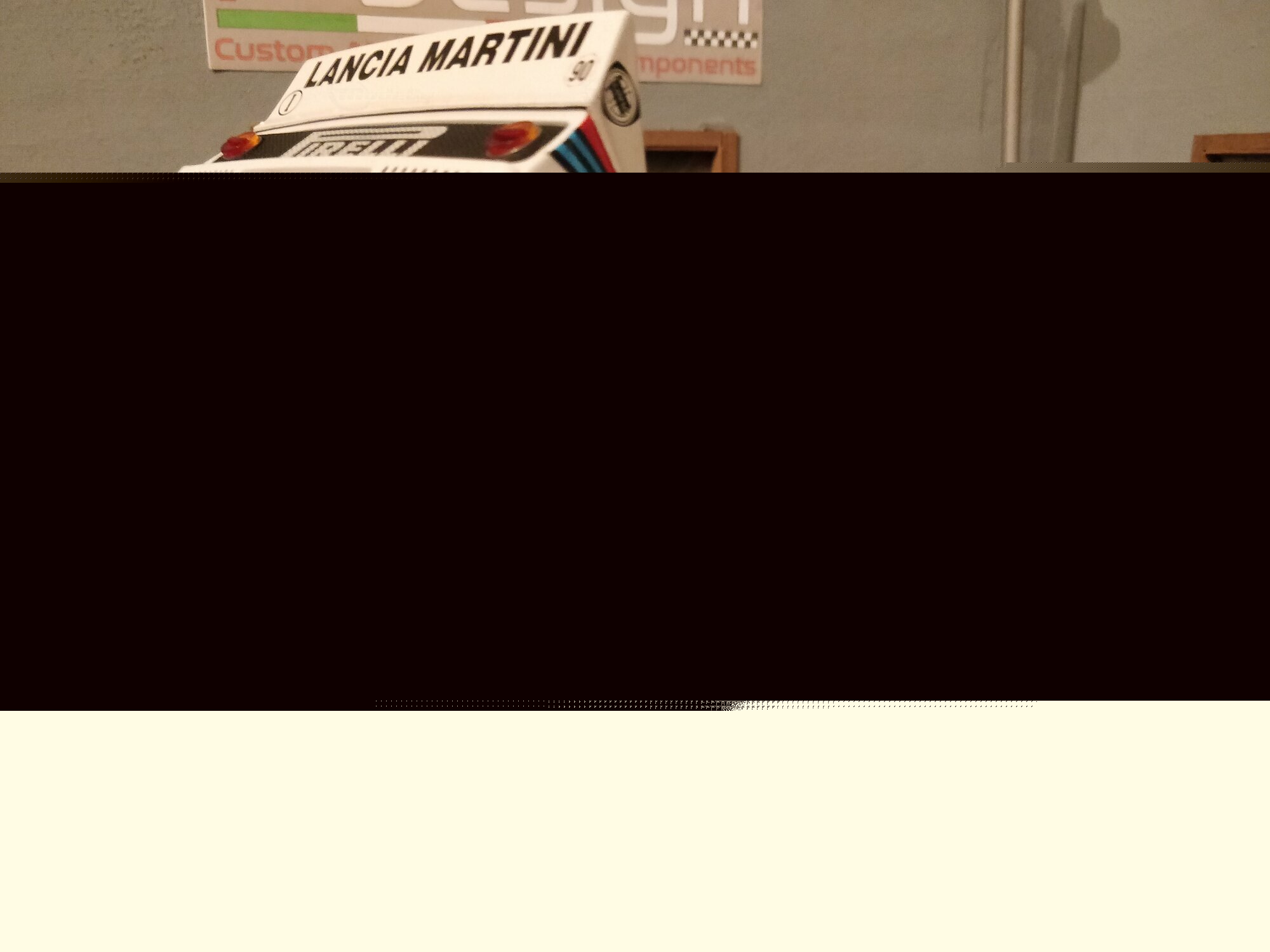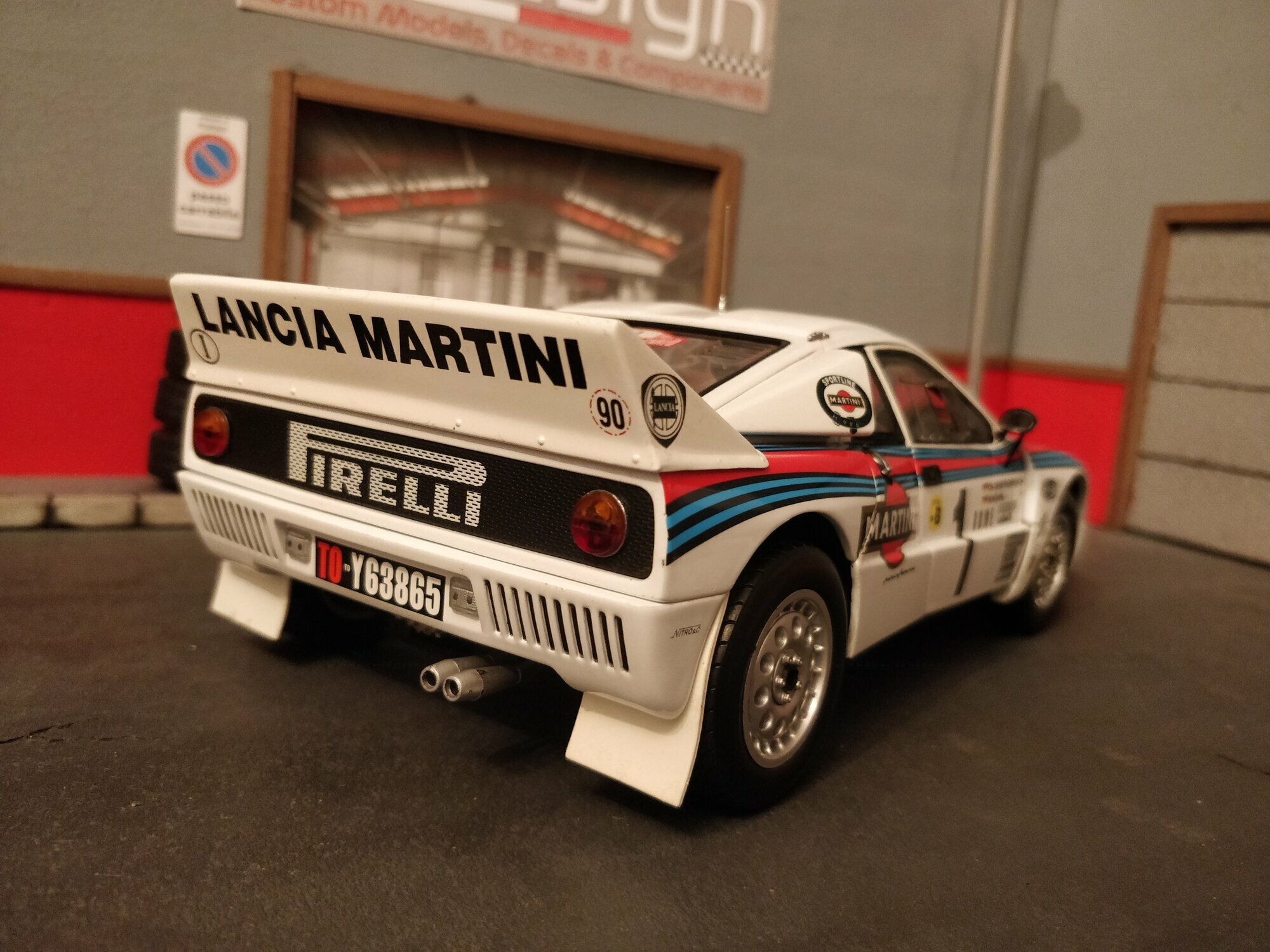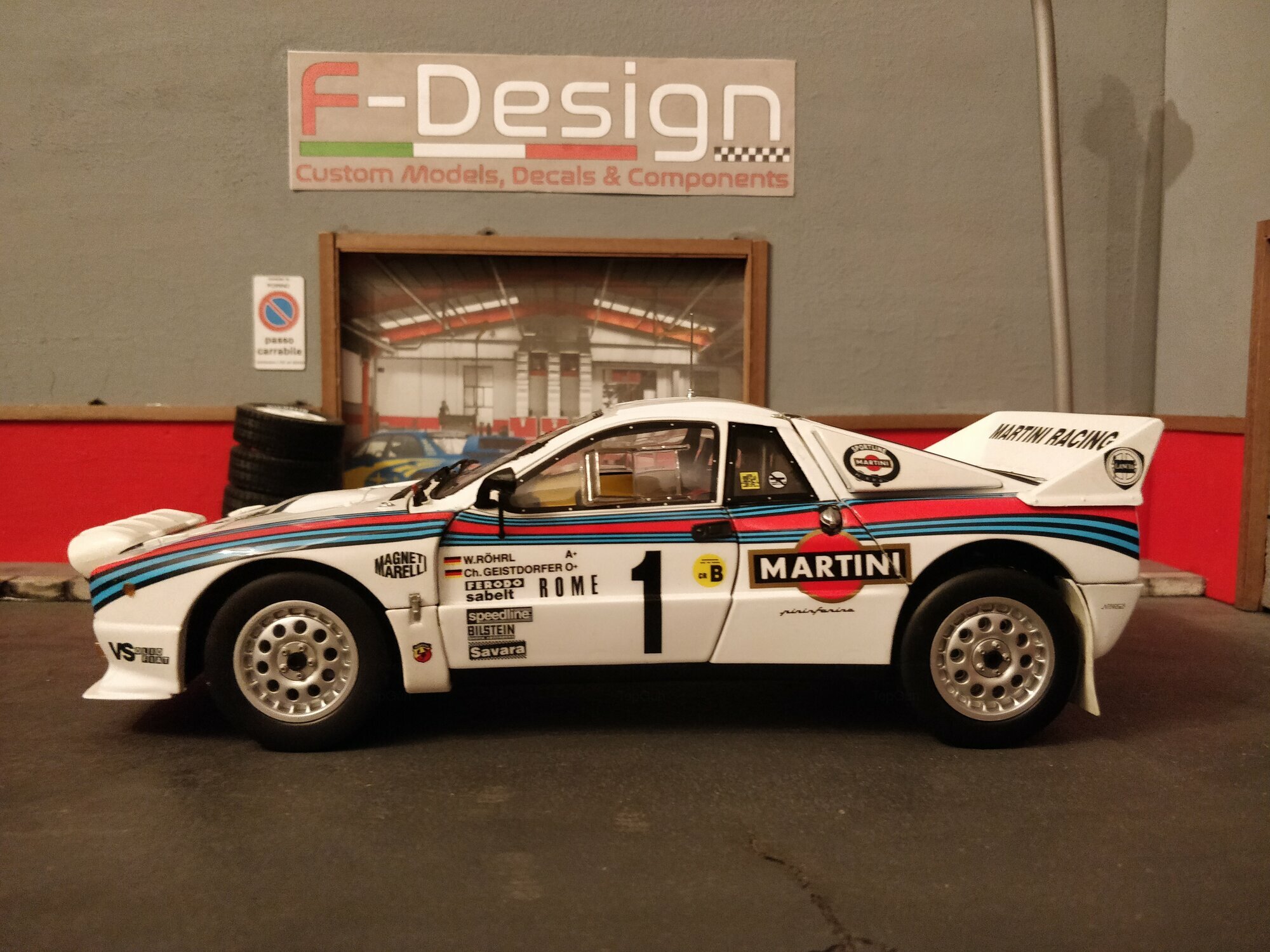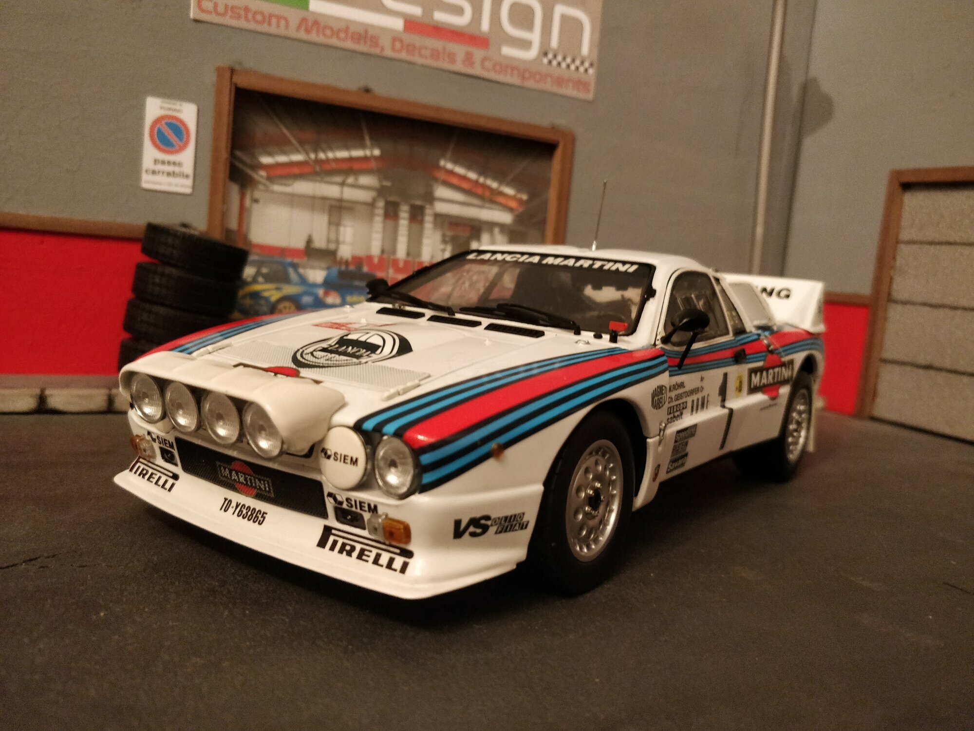 Das Design des Lancia 037 Rally stammte von dem berühmten Designer Pininfarina. Die Karosserie war gekennzeichnet durch eine fließende, aerodynamische Form, was für die Rennleistung von entscheidender Bedeutung war. Die ikonische Lackierung der Sponsoren, insbesondere von Martini Racing, ist ein wesentlicher Teil der Ästhetik dieses Fahrzeugs. Farblich zeigte sich der Wagen in der klassischen Martini-Livery, die weiße Grundfarbe kombiniert mit blauen und roten Streifen. Die prominenten Aufkleber von Pirelli, Magneti Marelli, und VS Olio Fiat, die auf den Fotos zu sehen sind, unterstreichen den konkurrenzorientierten Geist des Fahrzeugs und verbinden es mit seiner reichen Motorsportgeschichte.
