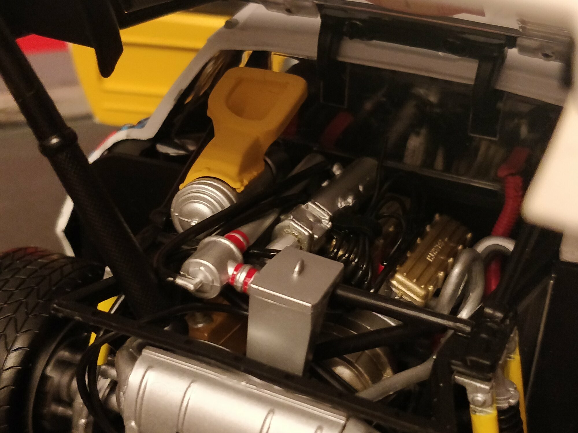 Die Detailtreue dieses Modells im Maßstab 1:18 von Kyosho ist erstaunlich. Die sichtbaren Scheinwerfer vorne, akkurat nachgebildete Radstoßdämpfer sowie die fein gearbeiteten Felgen spiegeln die hohe Qualität dieses Modells wider. Der Innenraum des Autos wurde ebenfalls detailgetreu nachgebildet, inklusive der Sicherheitsgurte, Sitze und Armaturen. Das Modell zeigt einen straffen Look mit den auffälligen breiten Kotflügeln und dem großen Heckspoiler, was die aerodynamischen Elemente des Originals unterstreicht. Die Kombination dieser Elemente und die Liebe zum Detail machen dieses Modell von Kyosho zu einem begehrenswerten Stück für Sammler auf der ganzen Welt.