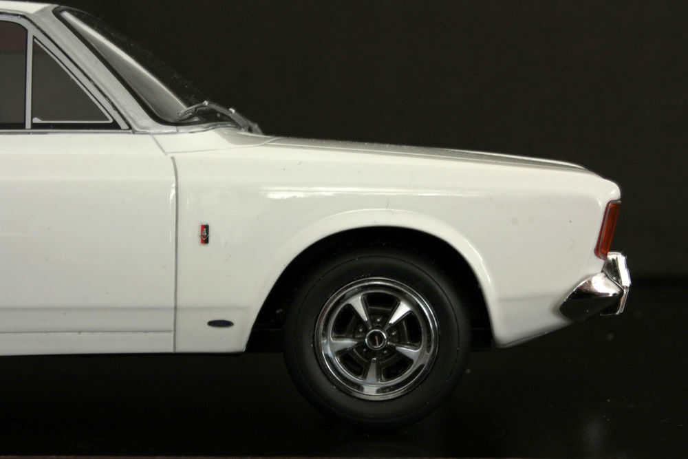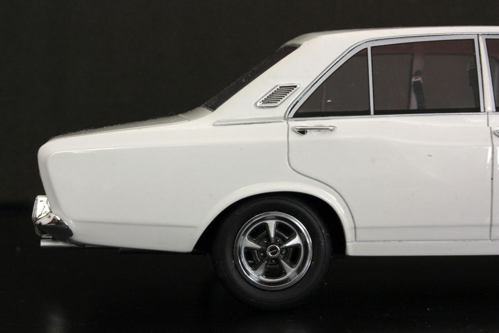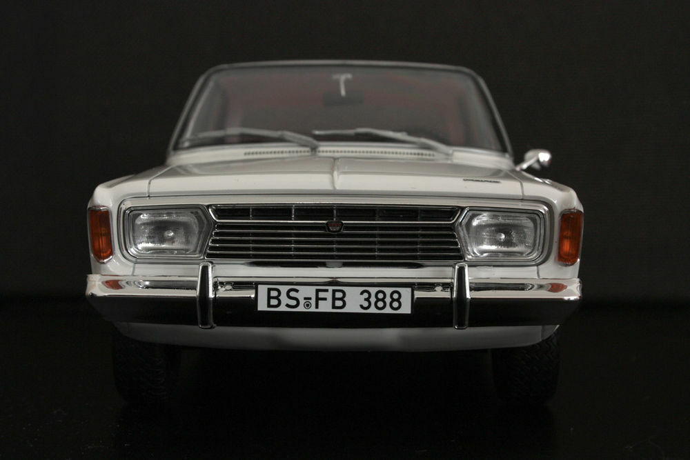 Die Lackierung dieses Miniaturmodells zeichnet sich durch eine klare, weiße Farbe aus, die dem Original sehr ähnlich sieht. Der insgesamt saubere und präzise Look könnte durch individuelle Anpassungen akzentuiert worden sein. Das Modell scheint spezielle Felgen zu besitzen, die im Vergleich zu den Standardmodellen einzigartig sind und möglicherweise von einem bekannten Tuning-Unternehmen wie BBS stammen. Der subtile Glanz und die Detailtreue der Lackierung sowie der exakte Nachbau der Karosserieformen und -linien bieten einen detaillierten Einblick in das klassische Design des 17M. Diese Detailtreue und die hochwertigen Materialien machen das Modell zu einem begehrten Sammlerstück.