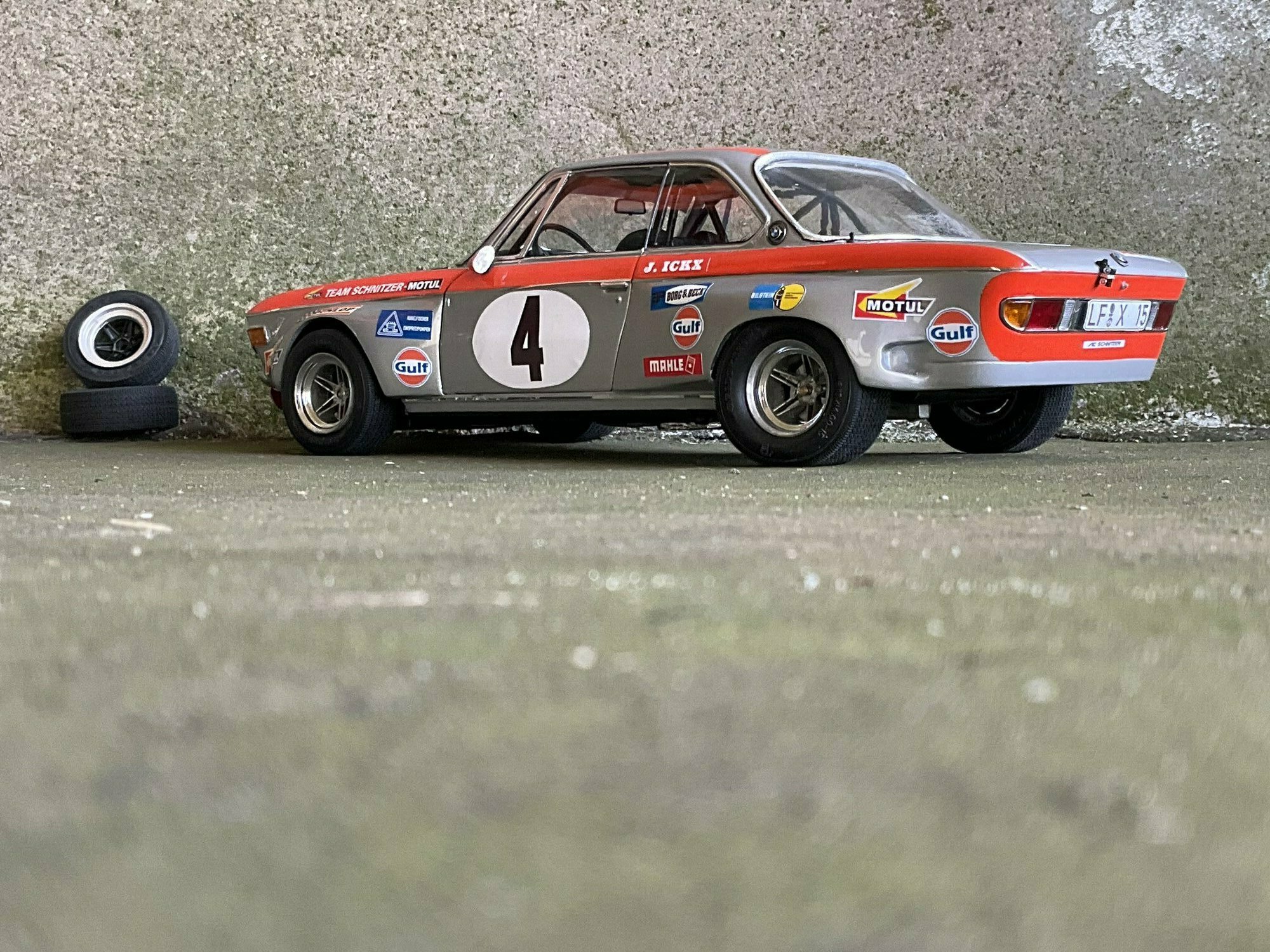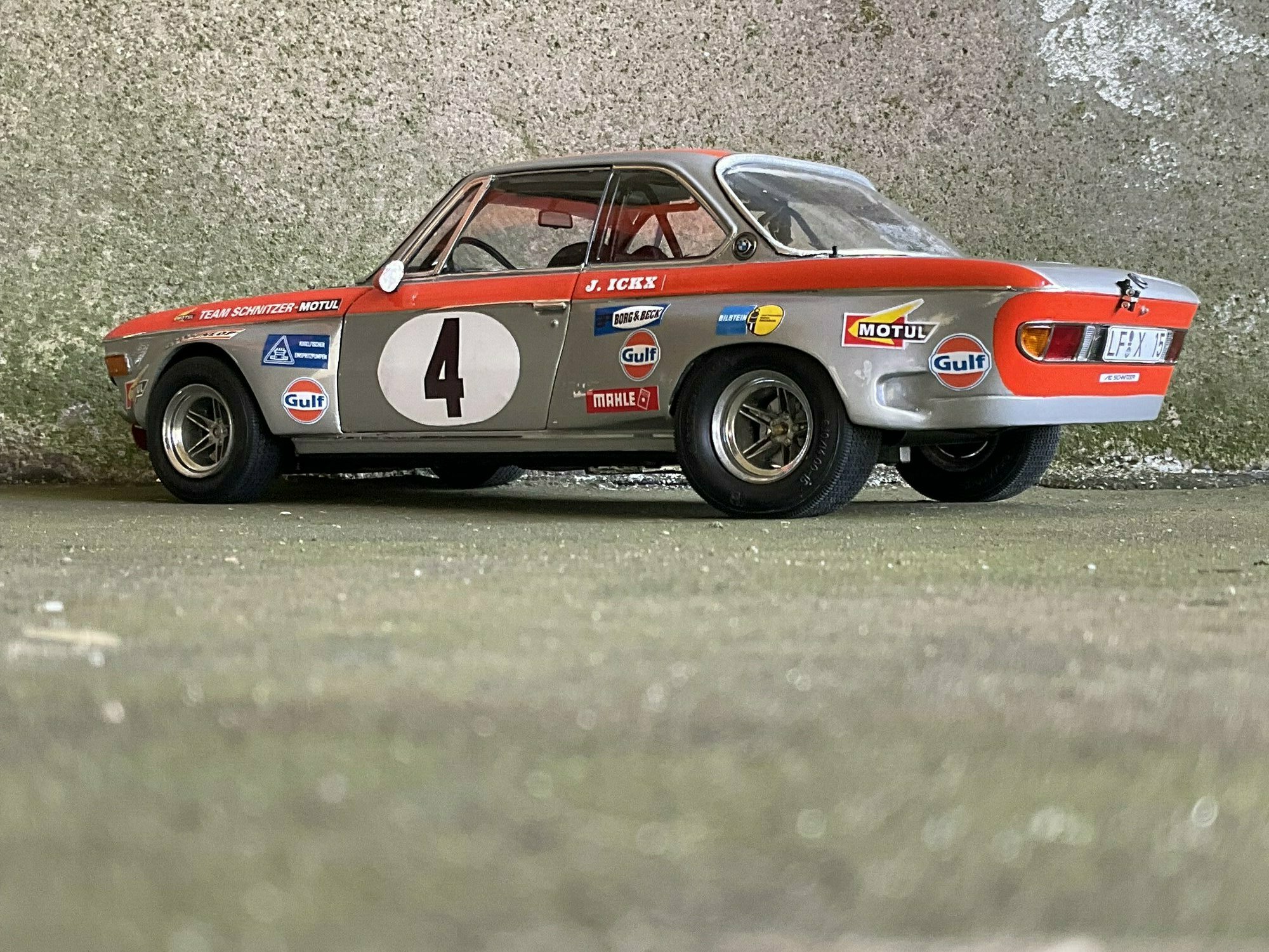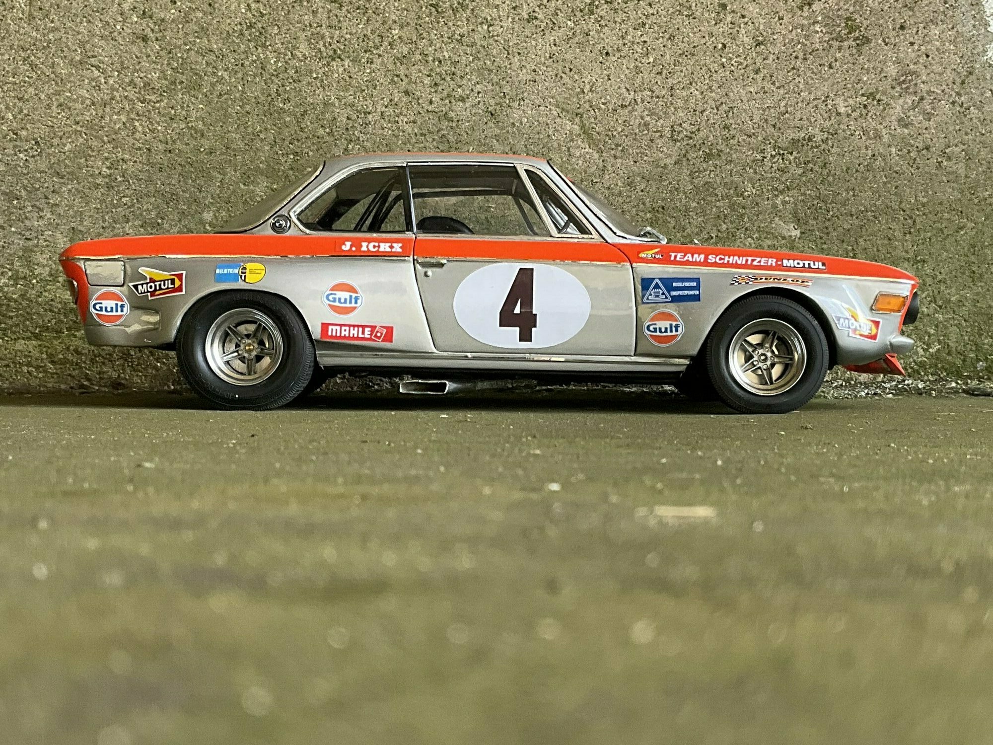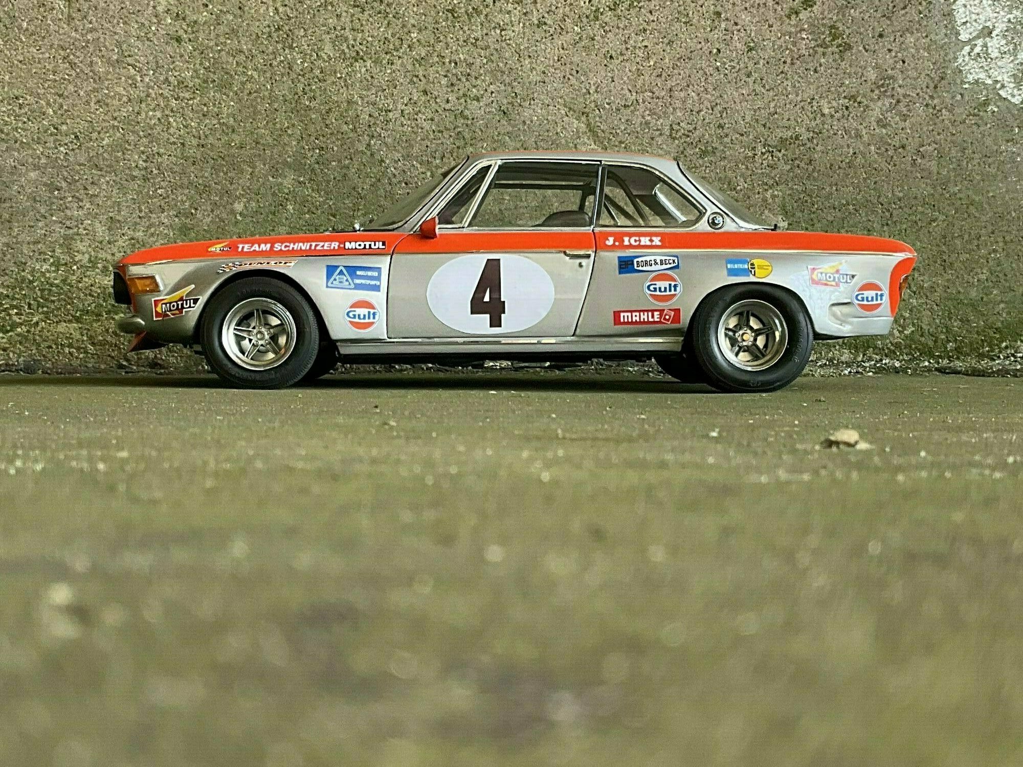 Die Farbgebung des Vorbilds war bei Team Schnitzer häufig in Silber mit kontrastierender Signalfarbe gehalten. Am Modell des BMW 2800 CS ist die obere Zierlinie in Orange umgesetzt, die an Frontmaske, Kotflügeln und Türrahmen umläuft. Auf beiden Türen und auf der Haube befindet sich ein weißer Rundling mit Startnummer „4“. Die Front zeigt die typische BMW‑Doppelniere sowie vier runde Leuchten, dazu einen roten, nach unten gezogenen Frontspoiler mit kleinen Markenaufklebern. Auf den Seitenteilen sind mehrere Sponsoren klar lesbar: Gulf, Motul, Mahle, Ferodo und Borg & Beck. Zusätzlich trägt die Scheibenoberkante den „Schnitzer“-Schriftzug, auf der Fahrerseite der Hinweis „J. Ickx“, der auf Jacky Ickx verweist. Die Fünfspeichenräder mit breiten Reifen, ein seitlich sichtbarer Auspuff und die fehlenden Chromstoßstangen komplettieren die Rennoptik des BMW 2800 CS. Die Formen und Spaltverläufe der Druckgusskarosserie sind sauber getroffen, was bei einem diecast‑Modell in dieser Größe positiv auffällt. Noch einmal der deutliche Hinweis: Das ausgestellte Exemplar ist ein modifiziertes Modellauto im Maßstab 1:12 von KK Scale und stellt keine unveränderte Werksausführung des Herstellers dar.