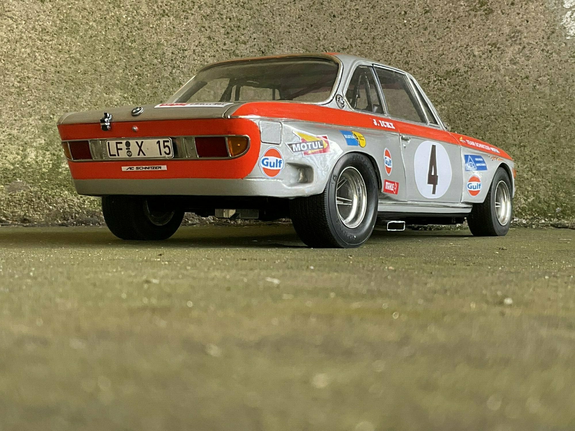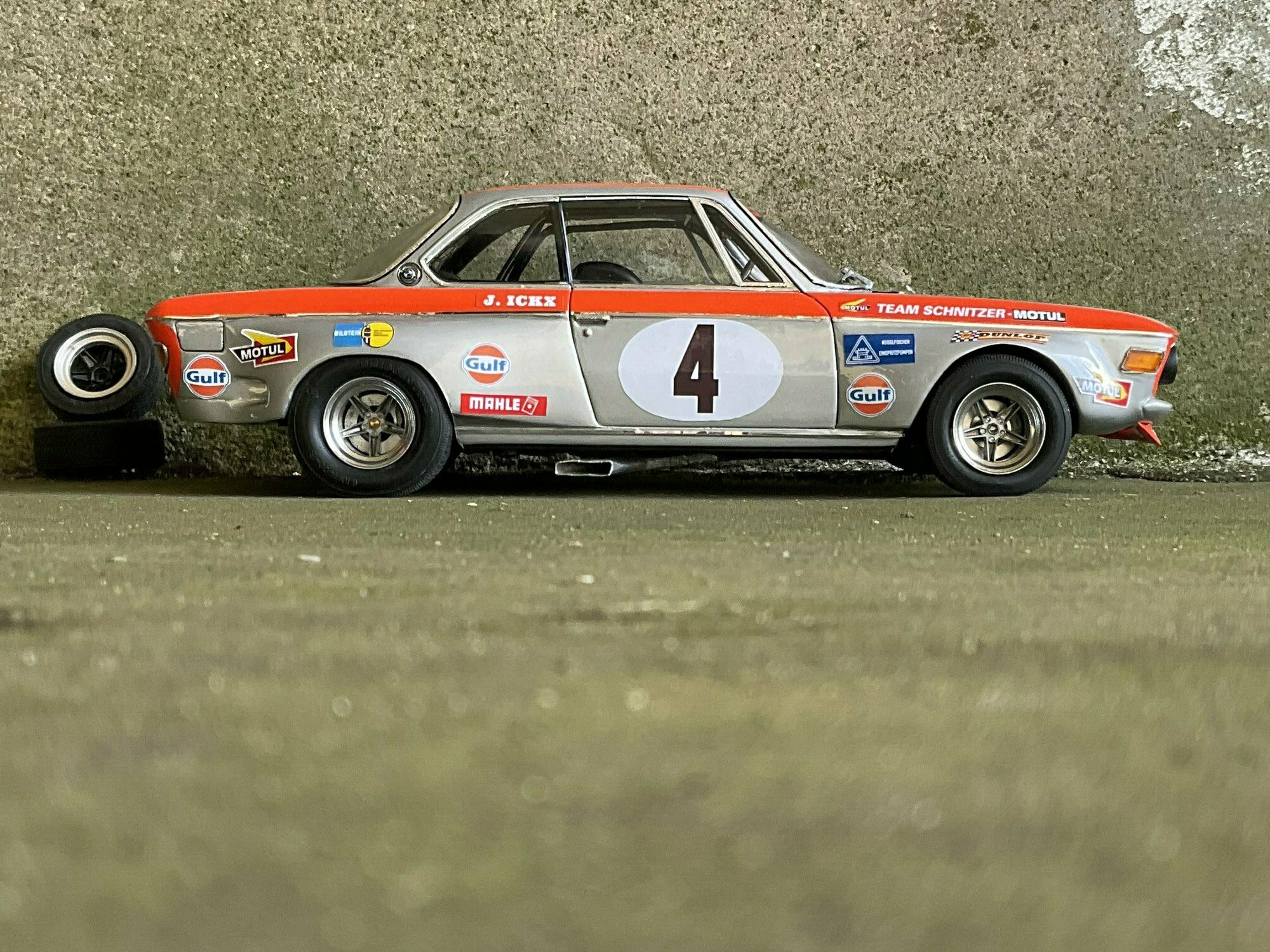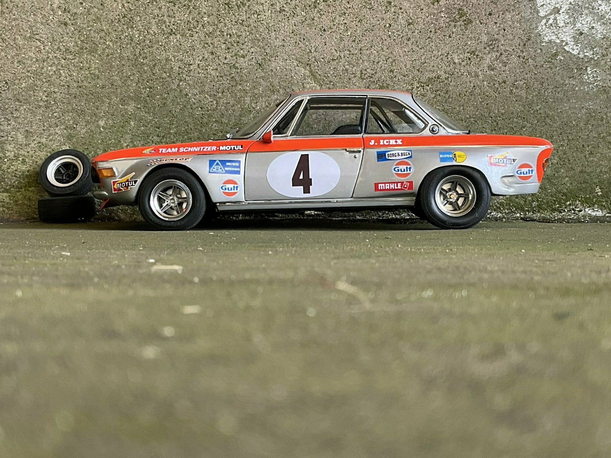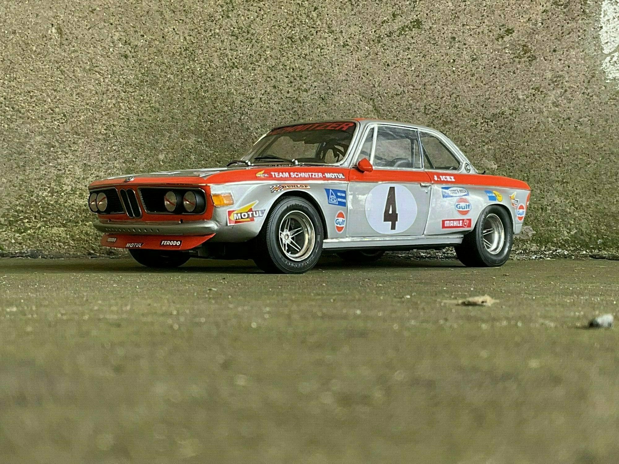 Die Farbgebung des Vorbilds war bei Team Schnitzer häufig in Silber mit kontrastierender Signalfarbe gehalten. Am Modell des BMW 2800 CS ist die obere Zierlinie in Orange umgesetzt, die an Frontmaske, Kotflügeln und Türrahmen umläuft. Auf beiden Türen und auf der Haube befindet sich ein weißer Rundling mit Startnummer „4“. Die Front zeigt die typische BMW‑Doppelniere sowie vier runde Leuchten, dazu einen roten, nach unten gezogenen Frontspoiler mit kleinen Markenaufklebern. Auf den Seitenteilen sind mehrere Sponsoren klar lesbar: Gulf, Motul, Mahle, Ferodo und Borg & Beck. Zusätzlich trägt die Scheibenoberkante den „Schnitzer“-Schriftzug, auf der Fahrerseite der Hinweis „J. Ickx“, der auf Jacky Ickx verweist. Die Fünfspeichenräder mit breiten Reifen, ein seitlich sichtbarer Auspuff und die fehlenden Chromstoßstangen komplettieren die Rennoptik des BMW 2800 CS. Die Formen und Spaltverläufe der Druckgusskarosserie sind sauber getroffen, was bei einem diecast‑Modell in dieser Größe positiv auffällt. Noch einmal der deutliche Hinweis: Das ausgestellte Exemplar ist ein modifiziertes Modellauto im Maßstab 1:12 von KK Scale und stellt keine unveränderte Werksausführung des Herstellers dar.