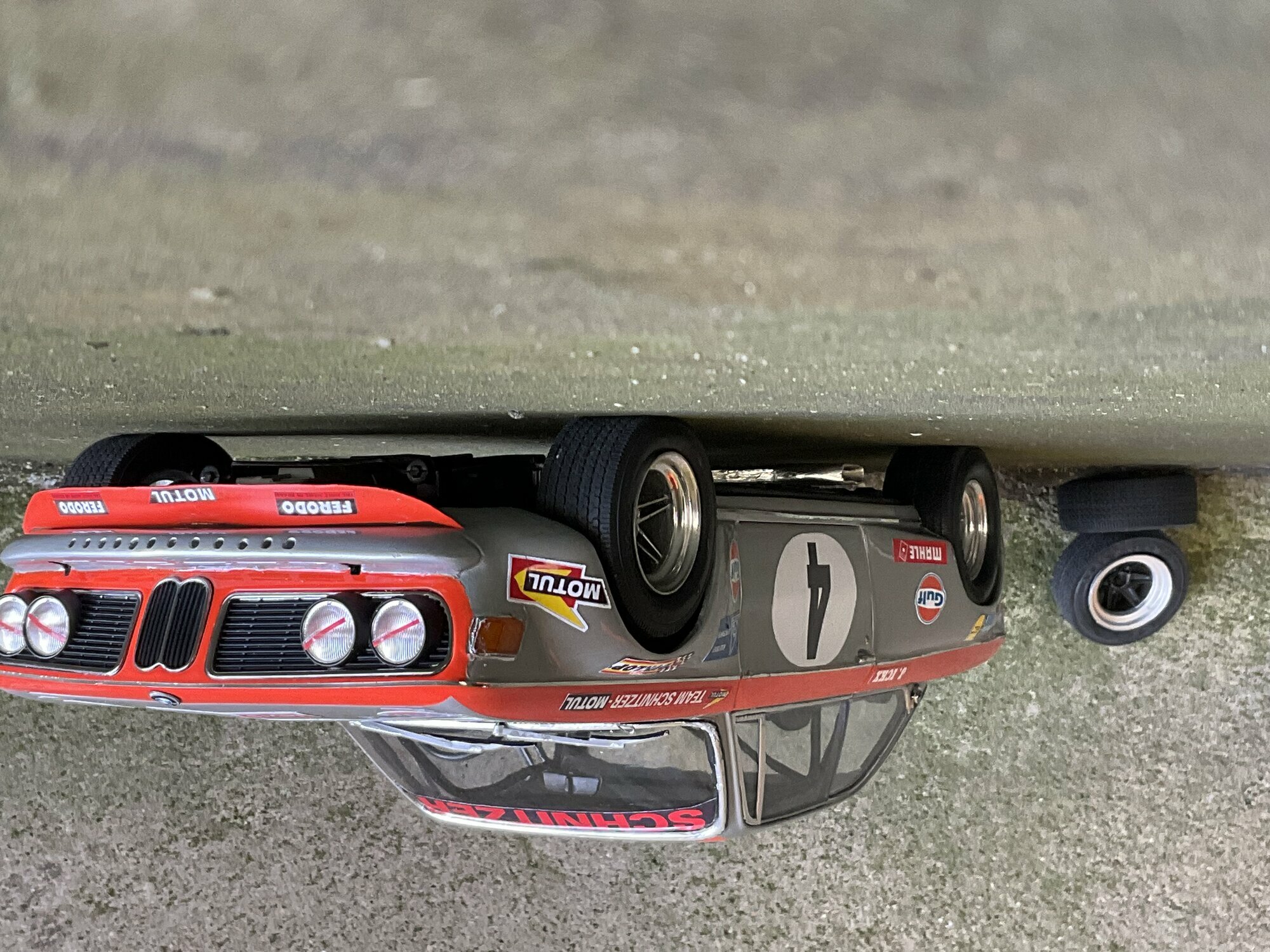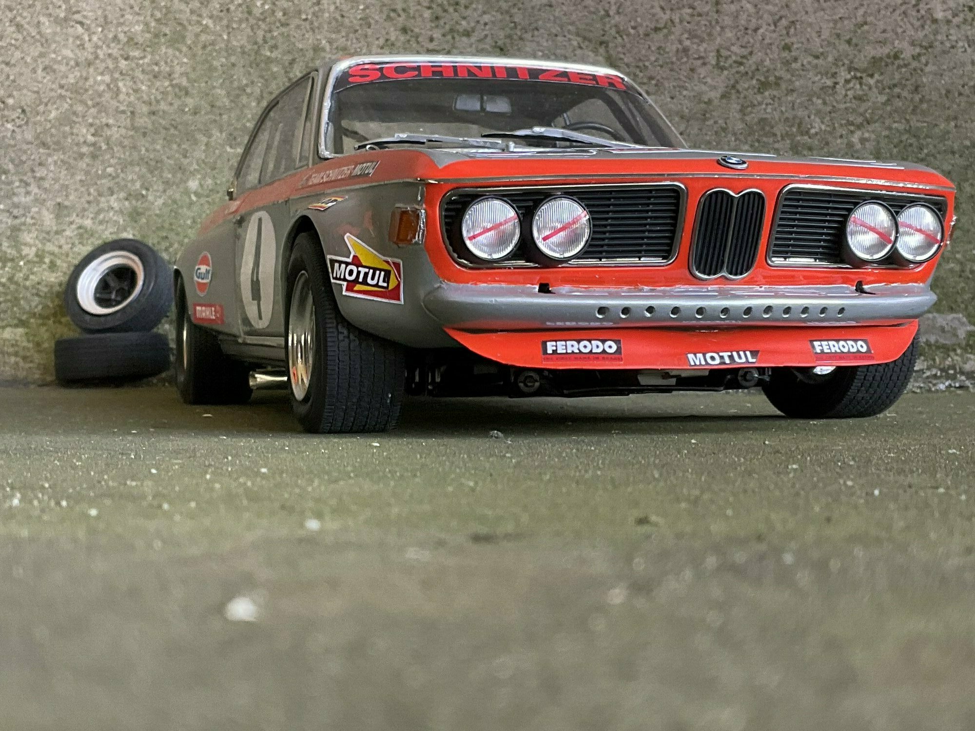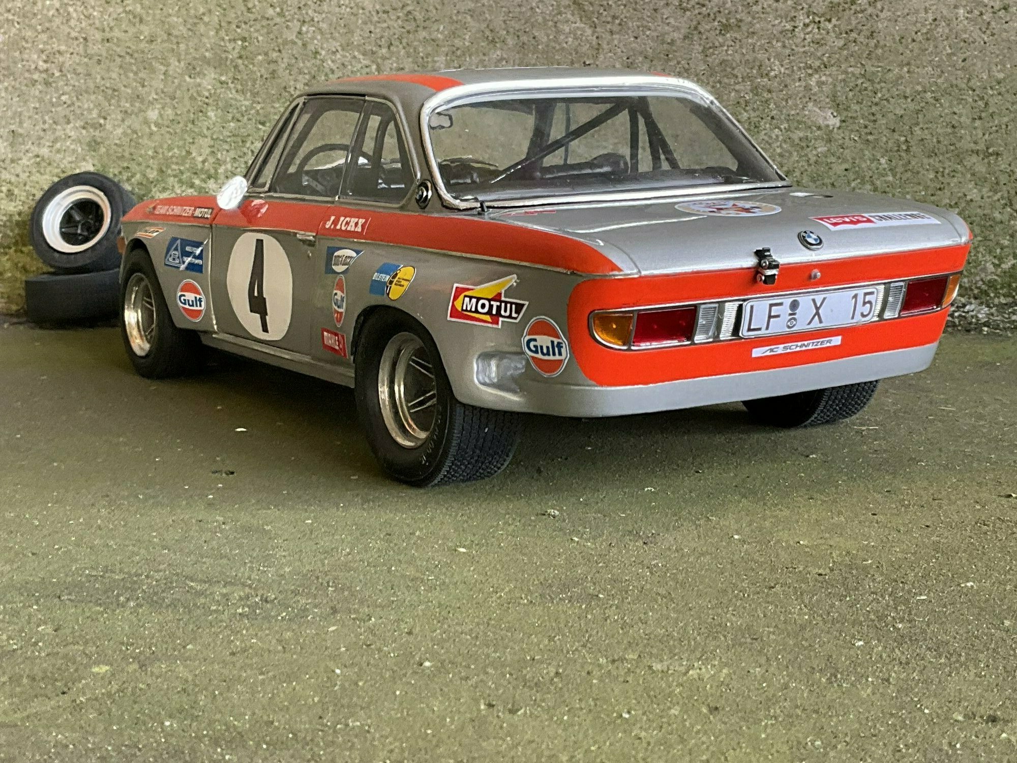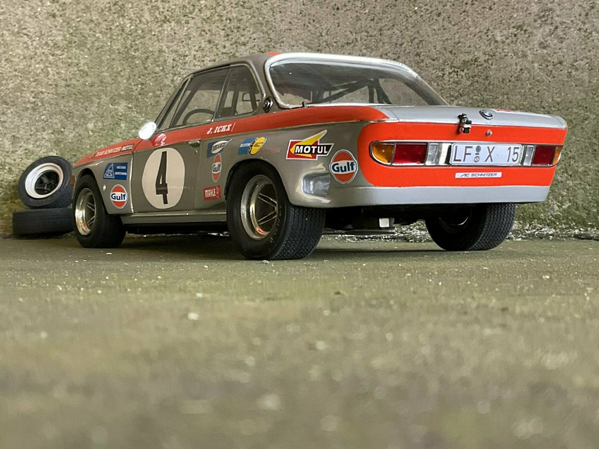 Die Farbgebung des Vorbilds war bei Team Schnitzer häufig in Silber mit kontrastierender Signalfarbe gehalten. Am Modell des BMW 2800 CS ist die obere Zierlinie in Orange umgesetzt, die an Frontmaske, Kotflügeln und Türrahmen umläuft. Auf beiden Türen und auf der Haube befindet sich ein weißer Rundling mit Startnummer „4“. Die Front zeigt die typische BMW‑Doppelniere sowie vier runde Leuchten, dazu einen roten, nach unten gezogenen Frontspoiler mit kleinen Markenaufklebern. Auf den Seitenteilen sind mehrere Sponsoren klar lesbar: Gulf, Motul, Mahle, Ferodo und Borg & Beck. Zusätzlich trägt die Scheibenoberkante den „Schnitzer“-Schriftzug, auf der Fahrerseite der Hinweis „J. Ickx“, der auf Jacky Ickx verweist. Die Fünfspeichenräder mit breiten Reifen, ein seitlich sichtbarer Auspuff und die fehlenden Chromstoßstangen komplettieren die Rennoptik des BMW 2800 CS. Die Formen und Spaltverläufe der Druckgusskarosserie sind sauber getroffen, was bei einem diecast‑Modell in dieser Größe positiv auffällt. Noch einmal der deutliche Hinweis: Das ausgestellte Exemplar ist ein modifiziertes Modellauto im Maßstab 1:12 von KK Scale und stellt keine unveränderte Werksausführung des Herstellers dar.